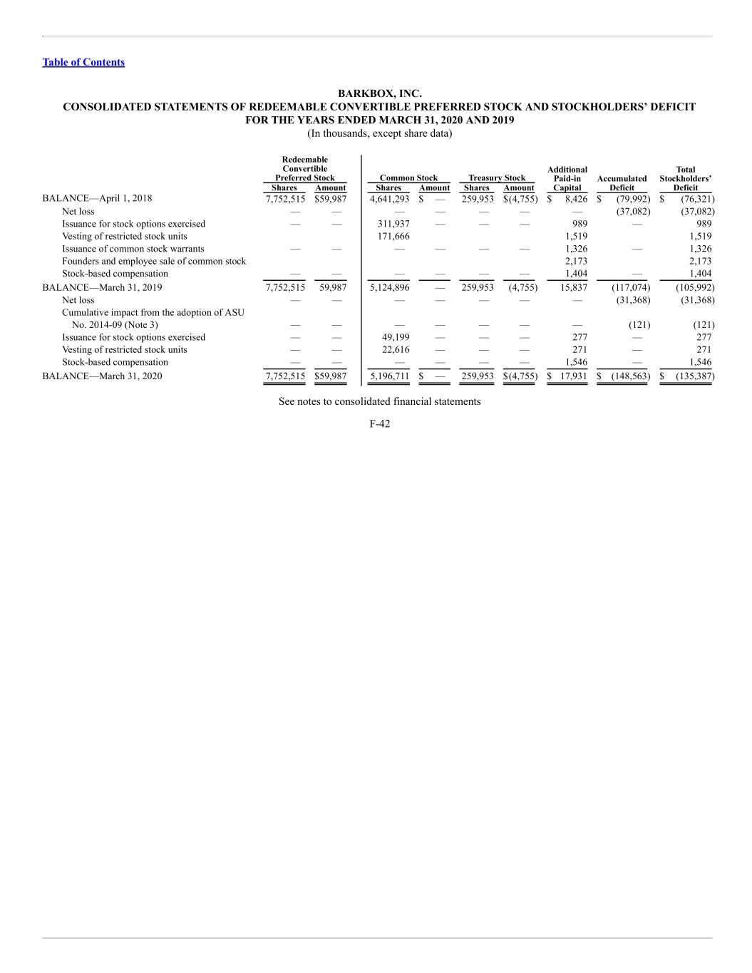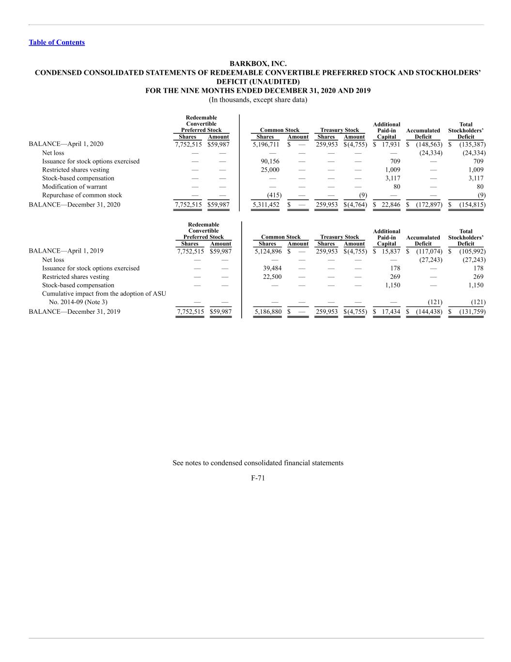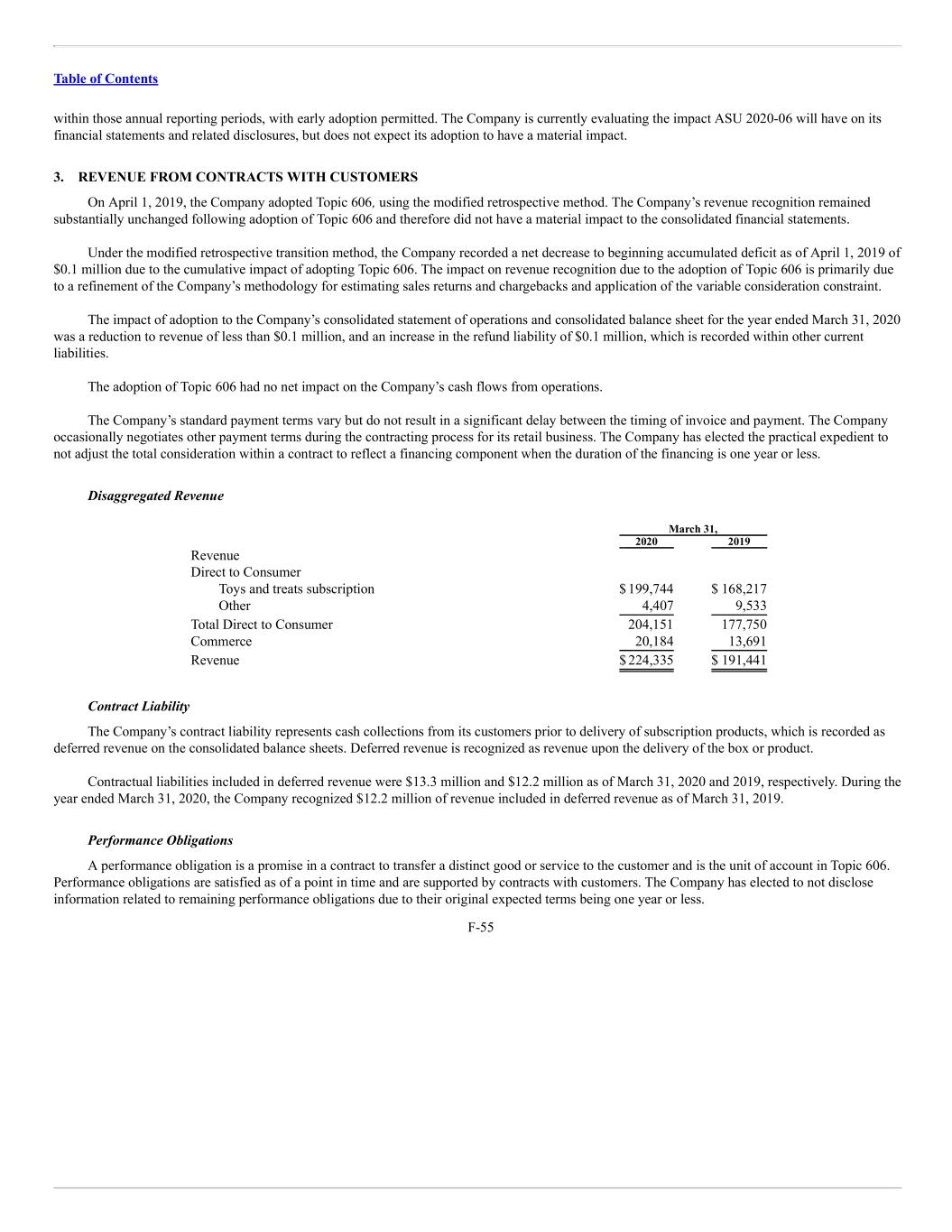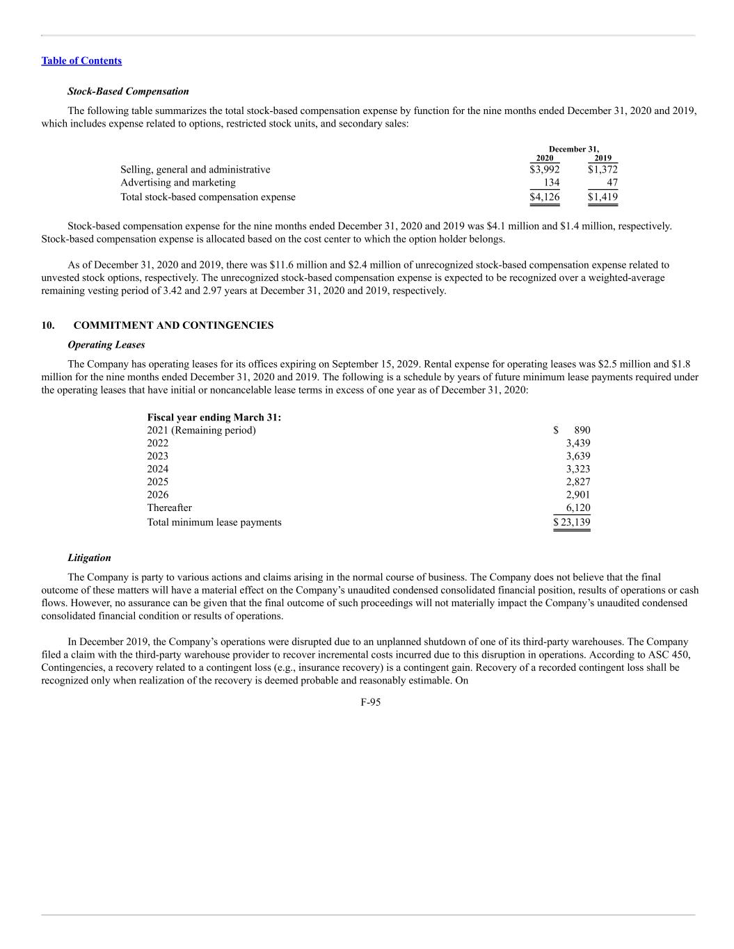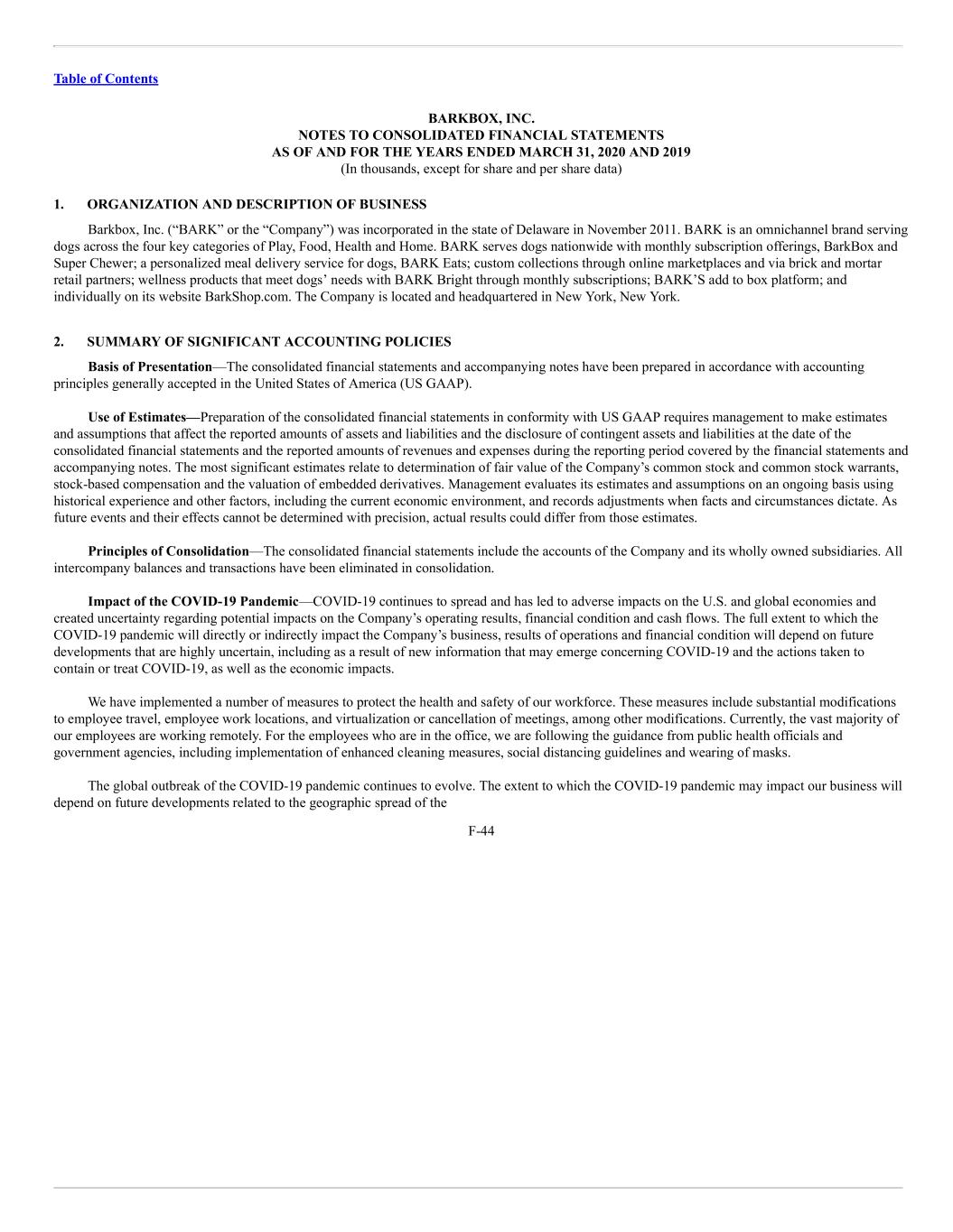 Table of Contents SUMMARY HISTORICAL FINANCIAL INFORMATION OF BARK The following table sets forth summary historical financial information of BARK for the periods and as of the dates indicated. The summary historical financial information of BARK as of and for the years ended March 31, 2020 and 2019 was derived from the audited historical financial statements of BARK included elsewhere in this proxy statement/prospectus. The summary historical interim financial information of BARK as of December 31, 2020, and for the nine months ended December 31, 2020 and 2019 was derived from the unaudited condensed consolidated financial statements of BARK included elsewhere in this proxy statement/prospectus and has been prepared on a consistent basis as the audited consolidated financial statements. In the opinion of BARK’s management, the interim financial statements reflect all adjustments, consisting only of normal recurring adjustments, necessary for the fair statement of the financial information in those statements. The following summary historical financial information should be read together with BARK’s consolidated financial statements and accompanying notes and “BARK’s Management’s Discussion and Analysis of Financial Condition and Results of Operations” appearing elsewhere in this proxy statement/ prospectus. The summary historical financial information in this section is not intended to replace BARK’s financial statements and the related notes. BARK’s historical results are not necessarily indicative of the results that may be expected in the future, and BARK’s results as of and for the nine months ended December 31, 2020, are not necessarily indicative of the results that may be expected for the year ending March 31, 2021, or any other period.        Nine Months Ended  December 31,     Year Ended March 31,        2020     2019     2020     2019        (in thousands, except for  share and per share data)     (in thousands, except for  share and per share data)   Consolidated Statement of Operation Data:          Revenue    $ 266,396    $ 161,664    $ 224,335    $ 191,441  Cost of revenue      108,421      65,058      88,921      84,326                                    Gross profit      157,975      96,606      135,414      107,115  Operating expenses:          Selling, general and administrative      123,882      84,606      115,893      104,146  Advertising and marketing      50,782      35,904      46,147      37,664                                    Total operating expenses      174,664      120,510      162,040      141,810                                    Loss from operations      (16,689)     (23,904)     (26,626)     (34,695)  Interest expense      (8,381)     (3,834)     (5,421)     (2,595)  Other income, net      736      495      679      208                                    Net loss before income taxes      (24,334)     (27,243)     (31,368)     (37,082)  Provision for income tax      —          —          —          —                                        Net loss and comprehensive loss    $ (24,334)   $ (27,243)   $ (31,368)   $ (37,082)                                    Net loss per common share attributable to common stockholders— basic and diluted    $ (4.64)   $ (5.29)   $ (6.08)   $ (7.56)                                    Weighted average common shares used to compute net loss per share attributable to common stockholders—basic and diluted      5,246,530      5,148,584      5,159,893      4,905,972                                      33