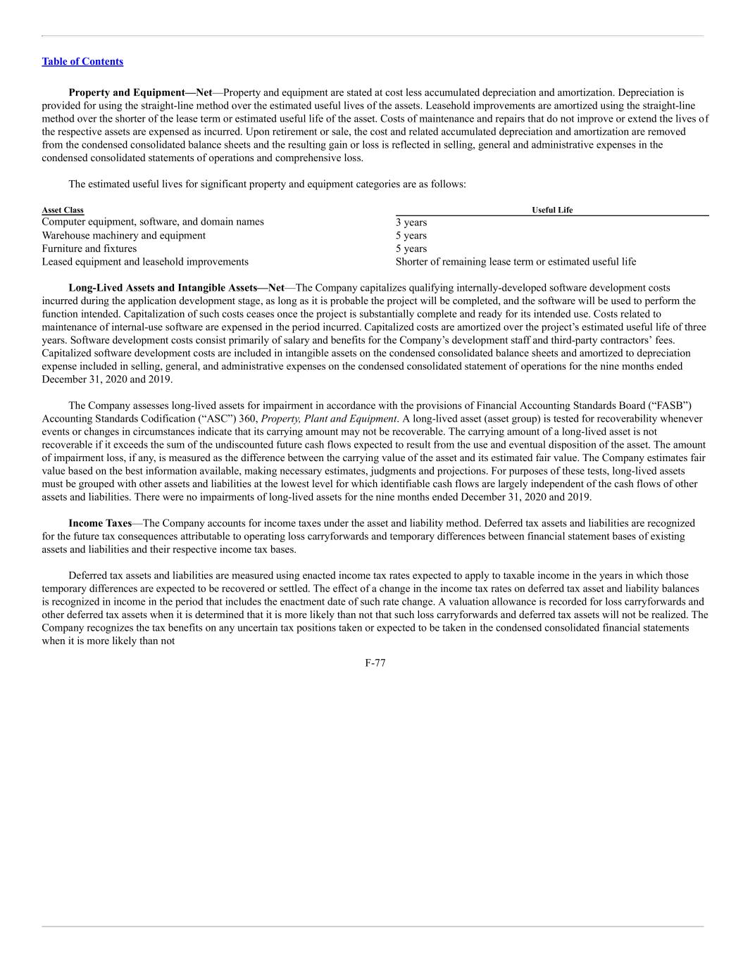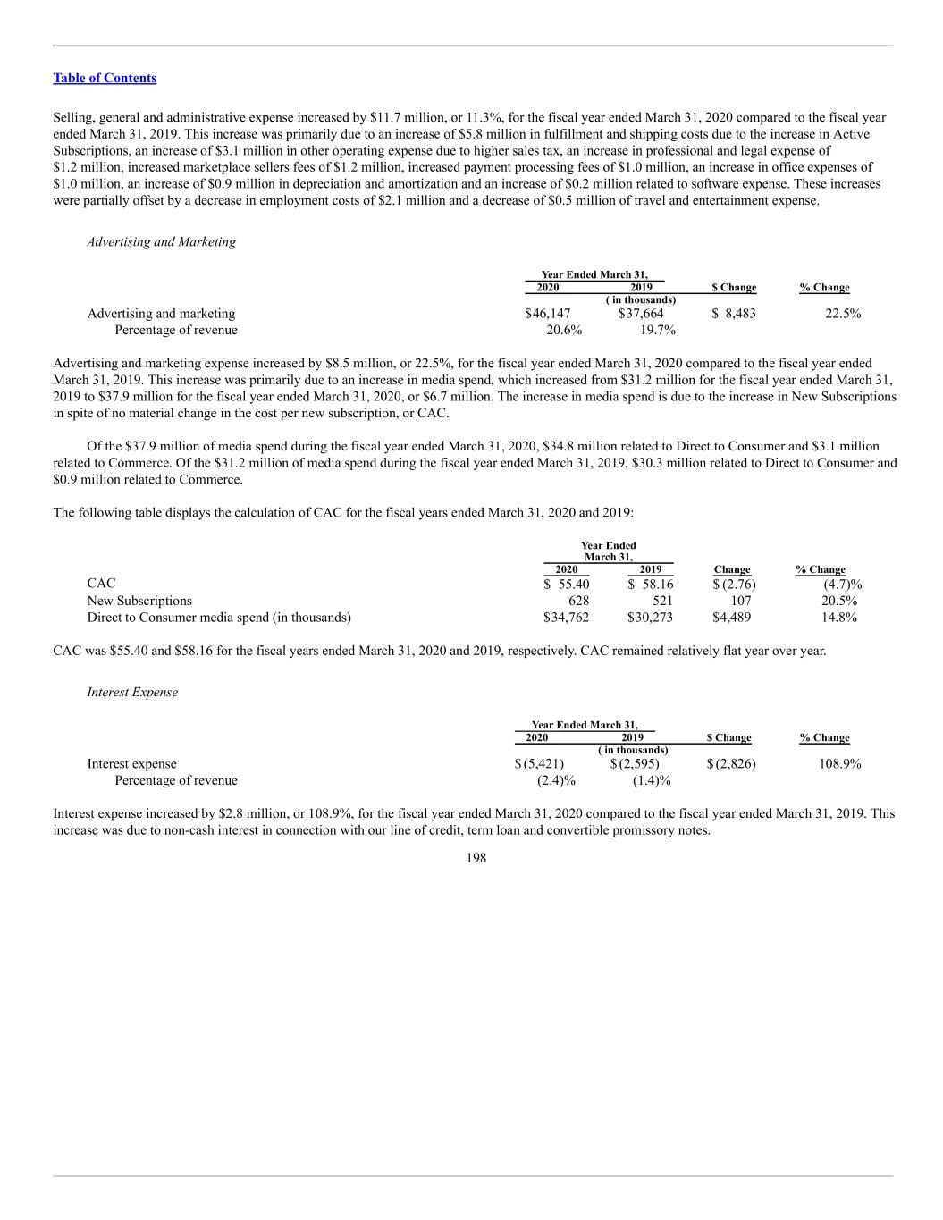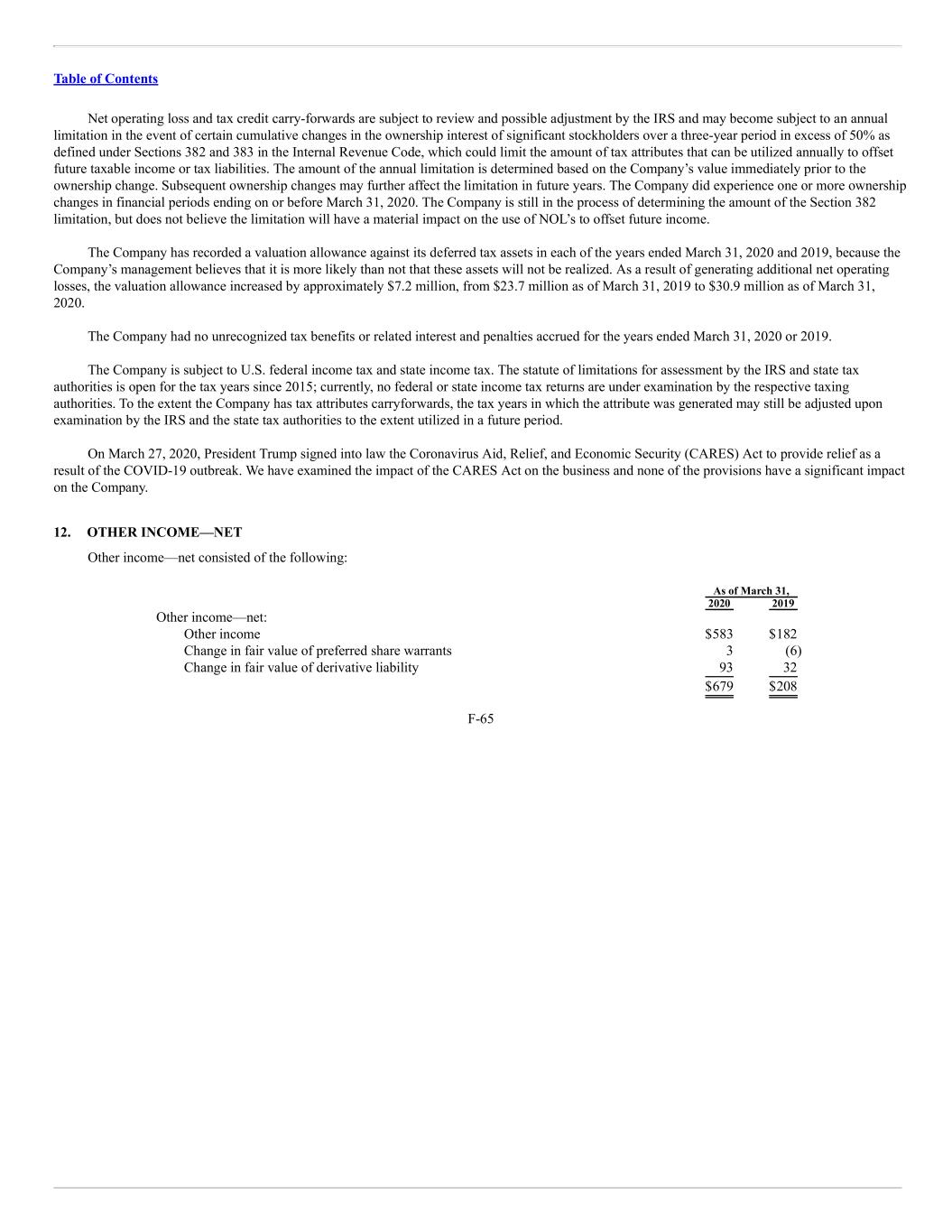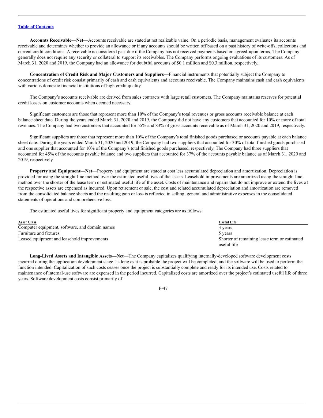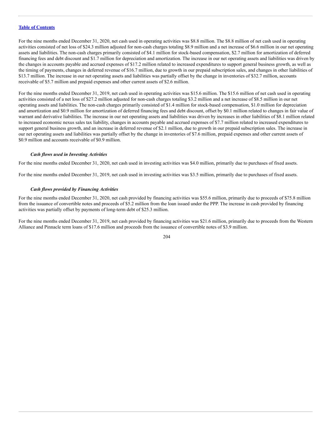 Table of Contents SUMMARY HISTORICAL FINANCIAL INFORMATION OF BARK The following table sets forth summary historical financial information of BARK for the periods and as of the dates indicated. The summary historical financial information of BARK as of and for the years ended March 31, 2020 and 2019 was derived from the audited historical financial statements of BARK included elsewhere in this proxy statement/prospectus. The summary historical interim financial information of BARK as of December 31, 2020, and for the nine months ended December 31, 2020 and 2019 was derived from the unaudited condensed consolidated financial statements of BARK included elsewhere in this proxy statement/prospectus and has been prepared on a consistent basis as the audited consolidated financial statements. In the opinion of BARK’s management, the interim financial statements reflect all adjustments, consisting only of normal recurring adjustments, necessary for the fair statement of the financial information in those statements. The following summary historical financial information should be read together with BARK’s consolidated financial statements and accompanying notes and “BARK’s Management’s Discussion and Analysis of Financial Condition and Results of Operations” appearing elsewhere in this proxy statement/ prospectus. The summary historical financial information in this section is not intended to replace BARK’s financial statements and the related notes. BARK’s historical results are not necessarily indicative of the results that may be expected in the future, and BARK’s results as of and for the nine months ended December 31, 2020, are not necessarily indicative of the results that may be expected for the year ending March 31, 2021, or any other period.        Nine Months Ended  December 31,     Year Ended March 31,        2020     2019     2020     2019        (in thousands, except for  share and per share data)     (in thousands, except for  share and per share data)   Consolidated Statement of Operation Data:          Revenue    $ 266,396    $ 161,664    $ 224,335    $ 191,441  Cost of revenue      108,421      65,058      88,921      84,326                                    Gross profit      157,975      96,606      135,414      107,115  Operating expenses:          Selling, general and administrative      123,882      84,606      115,893      104,146  Advertising and marketing      50,782      35,904      46,147      37,664                                    Total operating expenses      174,664      120,510      162,040      141,810                                    Loss from operations      (16,689)     (23,904)     (26,626)     (34,695)  Interest expense      (8,381)     (3,834)     (5,421)     (2,595)  Other income, net      736      495      679      208                                    Net loss before income taxes      (24,334)     (27,243)     (31,368)     (37,082)  Provision for income tax      —          —          —          —                                        Net loss and comprehensive loss    $ (24,334)   $ (27,243)   $ (31,368)   $ (37,082)                                    Net loss per common share attributable to common stockholders— basic and diluted    $ (4.64)   $ (5.29)   $ (6.08)   $ (7.56)                                    Weighted average common shares used to compute net loss per share attributable to common stockholders—basic and diluted      5,246,530      5,148,584      5,159,893      4,905,972                                      33
