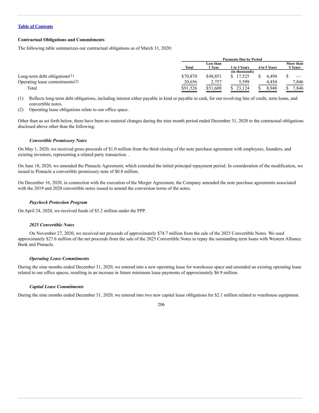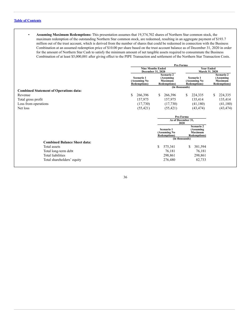 Table of Contents   •   Assuming Maximum Redemptions: This presentation assumes that 19,374,702 shares of Northern Star common stock, the maximum redemption of the outstanding Northern Star common stock, are redeemed, resulting in an aggregate payment of $193.7 million out of the trust account, which is derived from the number of shares that could be redeemed in connection with the Business Combination at an assumed redemption price of $10.00 per share based on the trust account balance as of December 31, 2020 in order for the amount of Northern Star Cash to satisfy the minimum amount of net tangible assets required to consummate the Business Combination of at least $5,000,001 after giving effect to the PIPE Transaction and settlement of the Northern Star Transaction Costs.        Pro Forma        Nine Months Ended  December 31, 2020     Year Ended  March 31, 2020        Scenario 1  (Assuming No  Redemptions)     Scenario 2  (Assuming  Maximum  Redemptions)    Scenario 1  (Assuming No  Redemptions)     Scenario 2  (Assuming  Maximum  Redemptions)       (in thousands)   Combined Statement of Operations data:          Revenue    $ 266,396    $ 266,396    $ 224,335    $ 224,335  Total gross profit      157,975      157,975      135,414      135,414  Loss from operations      (17,730)     (17,730)     (41,180)     (41,180)  Net loss      (55,421)     (55,421)     (43,474)     (43,474)         Pro Forma        As of December 31,  2020        Scenario 1  (Assuming No  Redemptions)      Scenario 2  (Assuming  Maximum  Redemptions)       (in thousands)   Combined Balance Sheet data:       Total assets    $ 575,341    $ 381,594  Total long-term debt      76,181      76,181  Total liabilities      298,861      298,861  Total shareholders’ equity      276,480      82,733    36