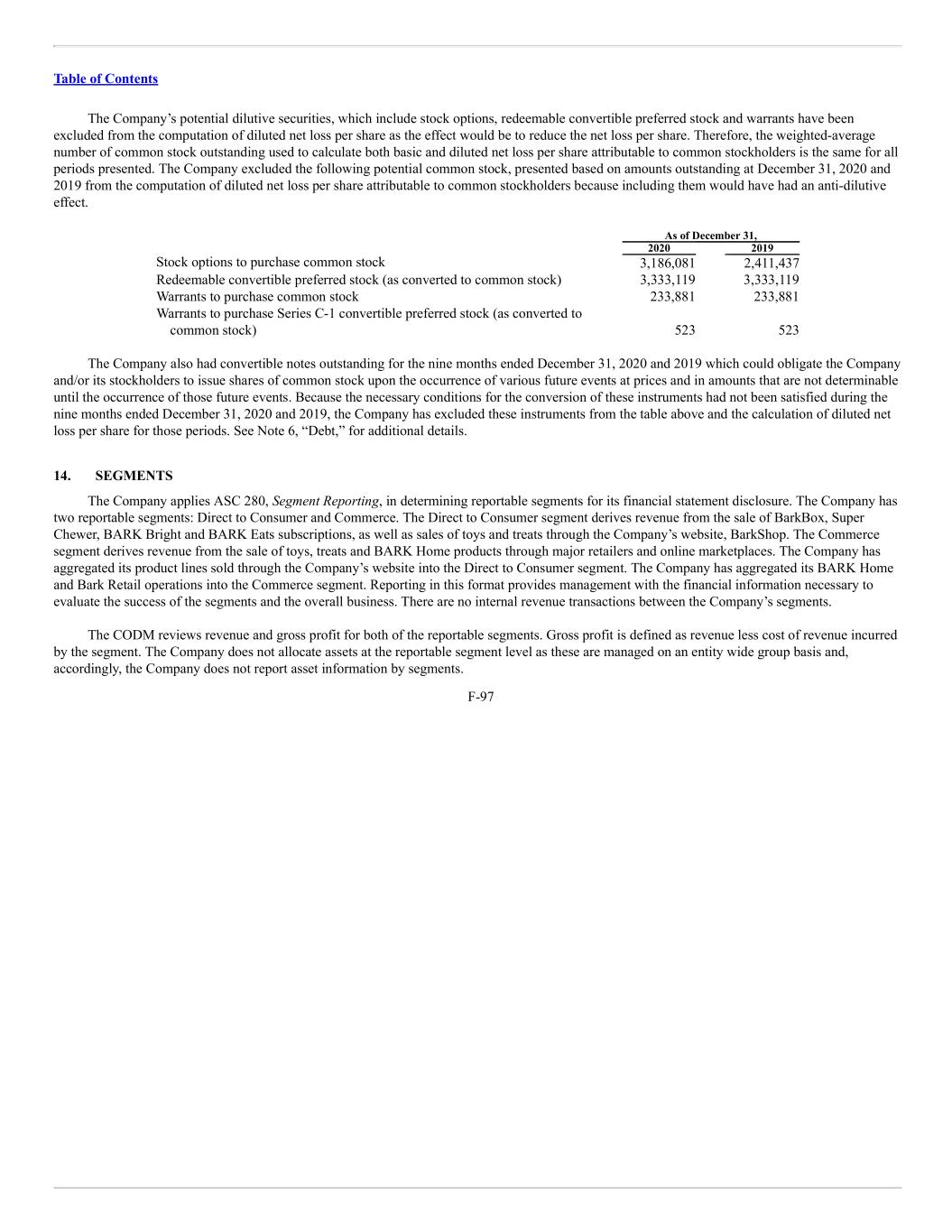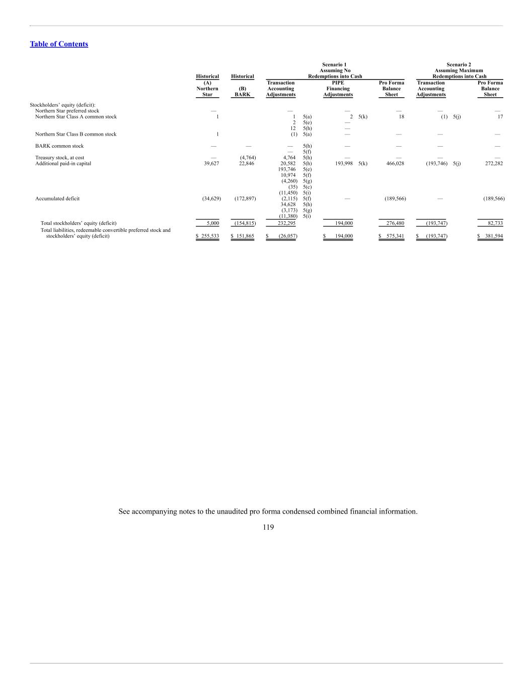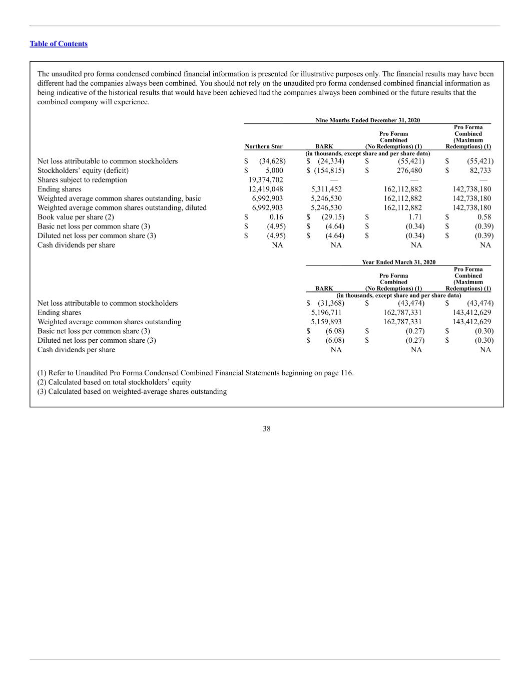 Table of Contents The unaudited pro forma condensed combined financial information is presented for illustrative purposes only. The financial results may have been different had the companies always been combined. You should not rely on the unaudited pro forma condensed combined financial information as being indicative of the historical results that would have been achieved had the companies always been combined or the future results that the combined company will experience.       Nine Months Ended December 31, 2020       Northern Star     BARK     Pro Forma  Combined  (No Redemptions) (1)    Pro Forma  Combined  (Maximum  Redemptions) (1)      (in thousands, except share and per share data)   Net loss attributable to common stockholders   $ (34,628)   $ (24,334)   $ (55,421)   $ (55,421)  Stockholders’ equity (deficit)   $ 5,000    $ (154,815)   $ 276,480    $ 82,733  Shares subject to redemption     19,374,702      —        —        —    Ending shares     12,419,048      5,311,452      162,112,882      142,738,180  Weighted average common shares outstanding, basic     6,992,903      5,246,530      162,112,882      142,738,180  Weighted average common shares outstanding, diluted     6,992,903      5,246,530      162,112,882      142,738,180  Book value per share (2)   $ 0.16    $ (29.15)   $ 1.71    $ 0.58  Basic net loss per common share (3)   $ (4.95)   $ (4.64)   $ (0.34)   $ (0.39)  Diluted net loss per common share (3)   $ (4.95)   $ (4.64)   $ (0.34)   $ (0.39)  Cash dividends per share     NA      NA      NA      NA            Year Ended March 31, 2020             BARK     Pro Forma  Combined  (No Redemptions) (1)    Pro Forma  Combined  (Maximum  Redemptions) (1)            (in thousands, except share and per share data)   Net loss attributable to common stockholders     $ (31,368)   $ (43,474)   $ (43,474)  Ending shares       5,196,711      162,787,331      143,412,629  Weighted average common shares outstanding       5,159,893      162,787,331      143,412,629  Basic net loss per common share (3)     $ (6.08)   $ (0.27)   $ (0.30)  Diluted net loss per common share (3)     $ (6.08)   $ (0.27)   $ (0.30)  Cash dividends per share       NA      NA      NA  (1) Refer to Unaudited Pro Forma Condensed Combined Financial Statements beginning on page 116. (2) Calculated based on total stockholders’ equity (3) Calculated based on weighted-average shares outstanding   38