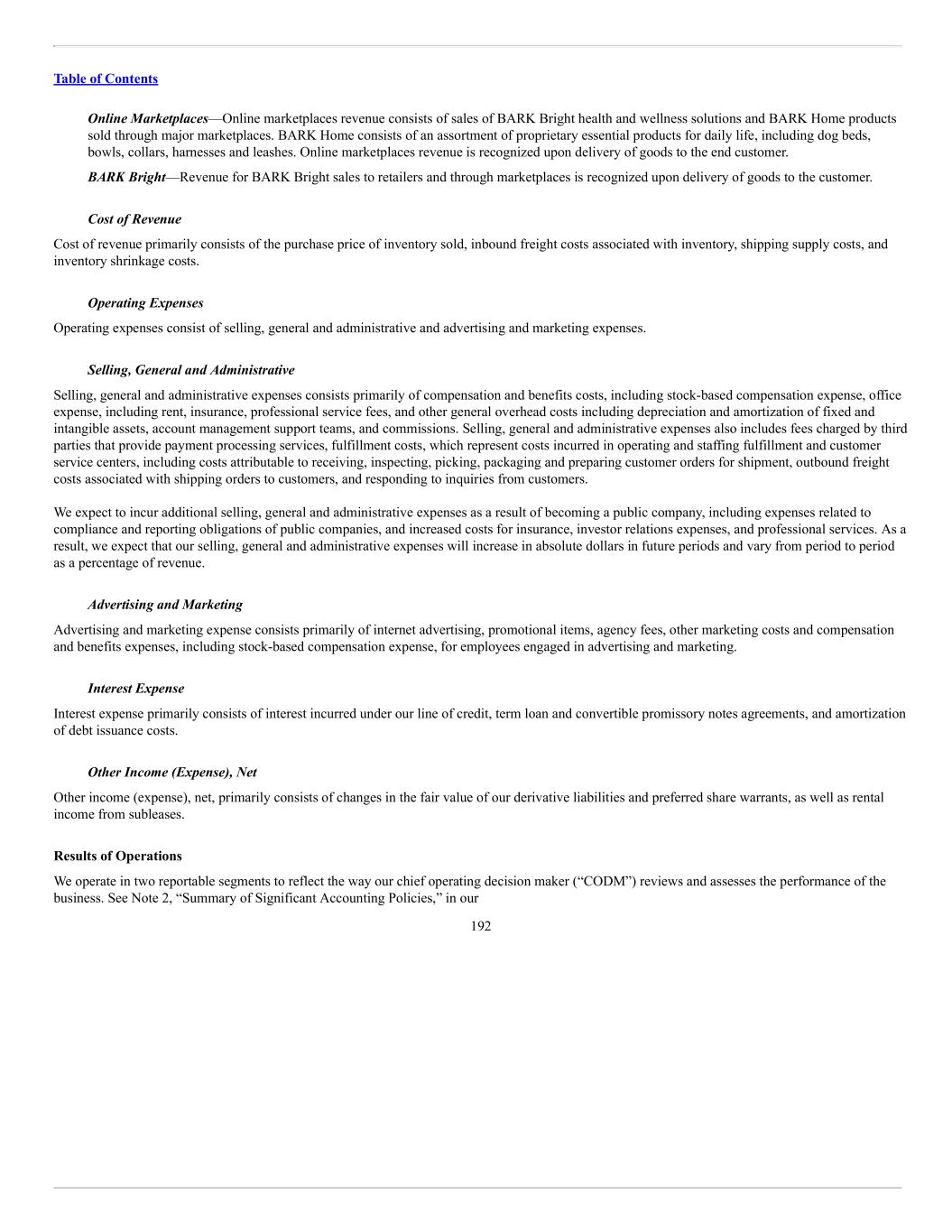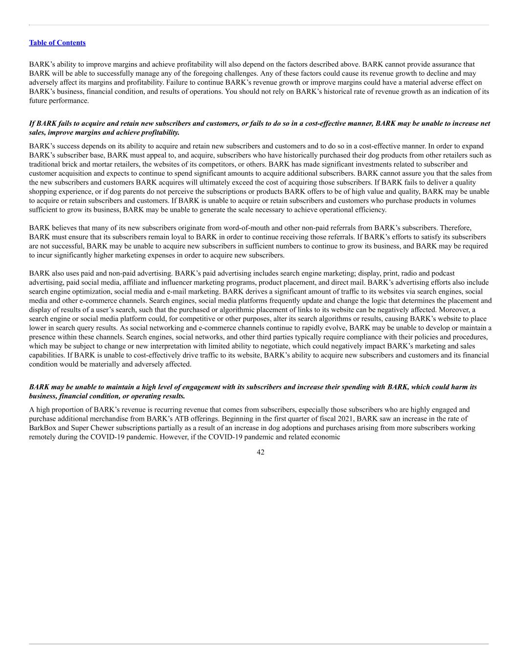 Table of Contents BARK’s ability to improve margins and achieve profitability will also depend on the factors described above. BARK cannot provide assurance that BARK will be able to successfully manage any of the foregoing challenges. Any of these factors could cause its revenue growth to decline and may adversely affect its margins and profitability. Failure to continue BARK’s revenue growth or improve margins could have a material adverse effect on BARK’s business, financial condition, and results of operations. You should not rely on BARK’s historical rate of revenue growth as an indication of its future performance. If BARK fails to acquire and retain new subscribers and customers, or fails to do so in a cost-effective manner, BARK may be unable to increase net sales, improve margins and achieve profitability. BARK’s success depends on its ability to acquire and retain new subscribers and customers and to do so in a cost-effective manner. In order to expand BARK’s subscriber base, BARK must appeal to, and acquire, subscribers who have historically purchased their dog products from other retailers such as traditional brick and mortar retailers, the websites of its competitors, or others. BARK has made significant investments related to subscriber and customer acquisition and expects to continue to spend significant amounts to acquire additional subscribers. BARK cannot assure you that the sales from the new subscribers and customers BARK acquires will ultimately exceed the cost of acquiring those subscribers. If BARK fails to deliver a quality shopping experience, or if dog parents do not perceive the subscriptions or products BARK offers to be of high value and quality, BARK may be unable to acquire or retain subscribers and customers. If BARK is unable to acquire or retain subscribers and customers who purchase products in volumes sufficient to grow its business, BARK may be unable to generate the scale necessary to achieve operational efficiency. BARK believes that many of its new subscribers originate from word-of-mouth and other non-paid referrals from BARK’s subscribers. Therefore, BARK must ensure that its subscribers remain loyal to BARK in order to continue receiving those referrals. If BARK’s efforts to satisfy its subscribers are not successful, BARK may be unable to acquire new subscribers in sufficient numbers to continue to grow its business, and BARK may be required to incur significantly higher marketing expenses in order to acquire new subscribers. BARK also uses paid and non-paid advertising. BARK’s paid advertising includes search engine marketing; display, print, radio and podcast advertising, paid social media, affiliate and influencer marketing programs, product placement, and direct mail. BARK’s advertising efforts also include search engine optimization, social media and e-mail marketing. BARK derives a significant amount of traffic to its websites via search engines, social media and other e-commerce channels. Search engines, social media platforms frequently update and change the logic that determines the placement and display of results of a user’s search, such that the purchased or algorithmic placement of links to its website can be negatively affected. Moreover, a search engine or social media platform could, for competitive or other purposes, alter its search algorithms or results, causing BARK’s website to place lower in search query results. As social networking and e-commerce channels continue to rapidly evolve, BARK may be unable to develop or maintain a presence within these channels. Search engines, social networks, and other third parties typically require compliance with their policies and procedures, which may be subject to change or new interpretation with limited ability to negotiate, which could negatively impact BARK’s marketing and sales capabilities. If BARK is unable to cost-effectively drive traffic to its website, BARK’s ability to acquire new subscribers and customers and its financial condition would be materially and adversely affected. BARK may be unable to maintain a high level of engagement with its subscribers and increase their spending with BARK, which could harm its business, financial condition, or operating results. A high proportion of BARK’s revenue is recurring revenue that comes from subscribers, especially those subscribers who are highly engaged and purchase additional merchandise from BARK’s ATB offerings. Beginning in the first quarter of fiscal 2021, BARK saw an increase in the rate of BarkBox and Super Chewer subscriptions partially as a result of an increase in dog adoptions and purchases arising from more subscribers working remotely during the COVID-19 pandemic. However, if the COVID-19 pandemic and related economic   42