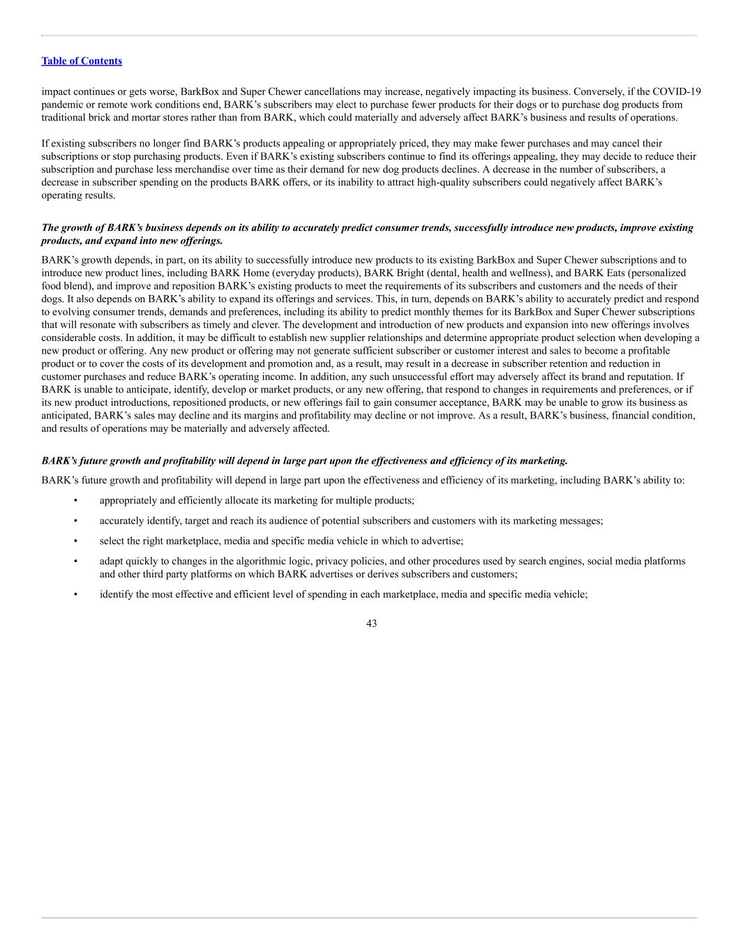 Table of Contents impact continues or gets worse, BarkBox and Super Chewer cancellations may increase, negatively impacting its business. Conversely, if the COVID-19 pandemic or remote work conditions end, BARK’s subscribers may elect to purchase fewer products for their dogs or to purchase dog products from traditional brick and mortar stores rather than from BARK, which could materially and adversely affect BARK’s business and results of operations. If existing subscribers no longer find BARK’s products appealing or appropriately priced, they may make fewer purchases and may cancel their subscriptions or stop purchasing products. Even if BARK’s existing subscribers continue to find its offerings appealing, they may decide to reduce their subscription and purchase less merchandise over time as their demand for new dog products declines. A decrease in the number of subscribers, a decrease in subscriber spending on the products BARK offers, or its inability to attract high-quality subscribers could negatively affect BARK’s operating results. The growth of BARK’s business depends on its ability to accurately predict consumer trends, successfully introduce new products, improve existing products, and expand into new offerings. BARK’s growth depends, in part, on its ability to successfully introduce new products to its existing BarkBox and Super Chewer subscriptions and to introduce new product lines, including BARK Home (everyday products), BARK Bright (dental, health and wellness), and BARK Eats (personalized food blend), and improve and reposition BARK’s existing products to meet the requirements of its subscribers and customers and the needs of their dogs. It also depends on BARK’s ability to expand its offerings and services. This, in turn, depends on BARK’s ability to accurately predict and respond to evolving consumer trends, demands and preferences, including its ability to predict monthly themes for its BarkBox and Super Chewer subscriptions that will resonate with subscribers as timely and clever. The development and introduction of new products and expansion into new offerings involves considerable costs. In addition, it may be difficult to establish new supplier relationships and determine appropriate product selection when developing a new product or offering. Any new product or offering may not generate sufficient subscriber or customer interest and sales to become a profitable product or to cover the costs of its development and promotion and, as a result, may result in a decrease in subscriber retention and reduction in customer purchases and reduce BARK’s operating income. In addition, any such unsuccessful effort may adversely affect its brand and reputation. If BARK is unable to anticipate, identify, develop or market products, or any new offering, that respond to changes in requirements and preferences, or if its new product introductions, repositioned products, or new offerings fail to gain consumer acceptance, BARK may be unable to grow its business as anticipated, BARK’s sales may decline and its margins and profitability may decline or not improve. As a result, BARK’s business, financial condition, and results of operations may be materially and adversely affected. BARK’s future growth and profitability will depend in large part upon the effectiveness and efficiency of its marketing. BARK’s future growth and profitability will depend in large part upon the effectiveness and efficiency of its marketing, including BARK’s ability to:     •   appropriately and efficiently allocate its marketing for multiple products;     •   accurately identify, target and reach its audience of potential subscribers and customers with its marketing messages;     •   select the right marketplace, media and specific media vehicle in which to advertise;     •   adapt quickly to changes in the algorithmic logic, privacy policies, and other procedures used by search engines, social media platforms and other third party platforms on which BARK advertises or derives subscribers and customers;     •   identify the most effective and efficient level of spending in each marketplace, media and specific media vehicle;     43