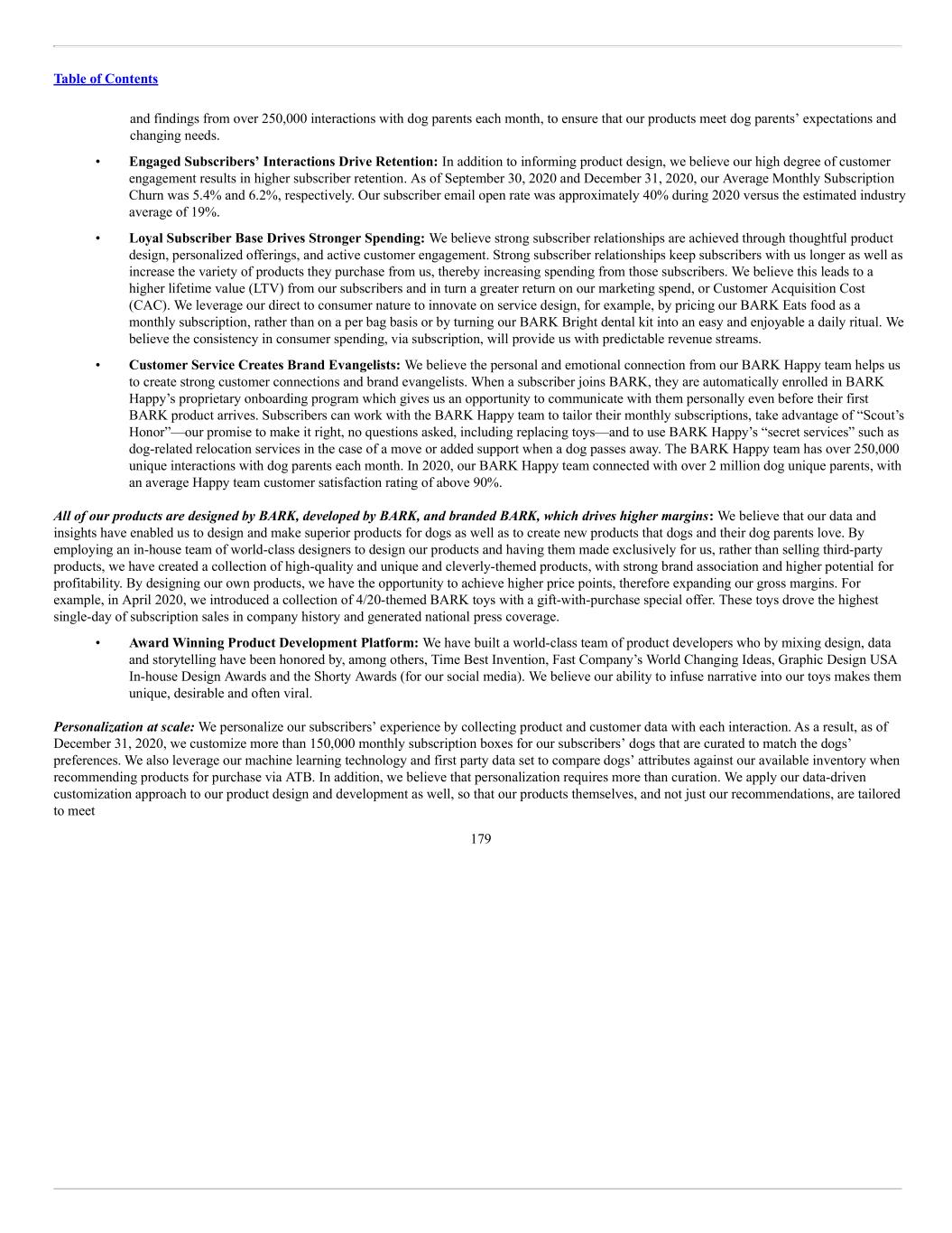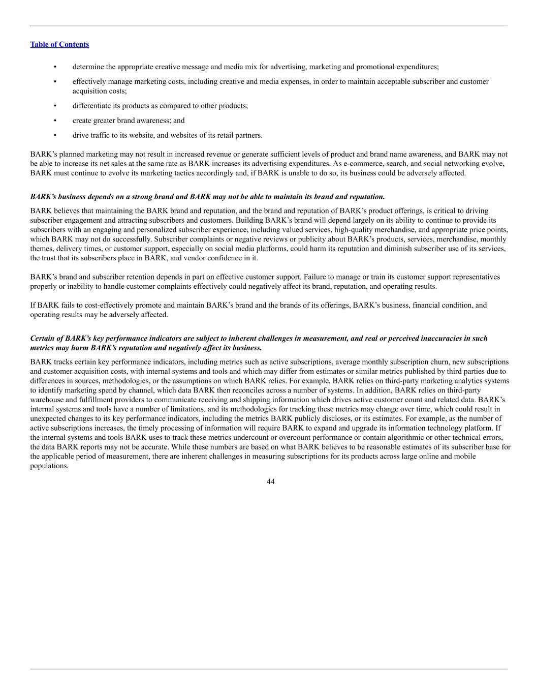 Table of Contents   •   determine the appropriate creative message and media mix for advertising, marketing and promotional expenditures;     •   effectively manage marketing costs, including creative and media expenses, in order to maintain acceptable subscriber and customer acquisition costs;     •   differentiate its products as compared to other products;     •   create greater brand awareness; and     •   drive traffic to its website, and websites of its retail partners. BARK’s planned marketing may not result in increased revenue or generate sufficient levels of product and brand name awareness, and BARK may not be able to increase its net sales at the same rate as BARK increases its advertising expenditures. As e-commerce, search, and social networking evolve, BARK must continue to evolve its marketing tactics accordingly and, if BARK is unable to do so, its business could be adversely affected. BARK’s business depends on a strong brand and BARK may not be able to maintain its brand and reputation. BARK believes that maintaining the BARK brand and reputation, and the brand and reputation of BARK’s product offerings, is critical to driving subscriber engagement and attracting subscribers and customers. Building BARK’s brand will depend largely on its ability to continue to provide its subscribers with an engaging and personalized subscriber experience, including valued services, high-quality merchandise, and appropriate price points, which BARK may not do successfully. Subscriber complaints or negative reviews or publicity about BARK’s products, services, merchandise, monthly themes, delivery times, or customer support, especially on social media platforms, could harm its reputation and diminish subscriber use of its services, the trust that its subscribers place in BARK, and vendor confidence in it. BARK’s brand and subscriber retention depends in part on effective customer support. Failure to manage or train its customer support representatives properly or inability to handle customer complaints effectively could negatively affect its brand, reputation, and operating results. If BARK fails to cost-effectively promote and maintain BARK’s brand and the brands of its offerings, BARK’s business, financial condition, and operating results may be adversely affected. Certain of BARK’s key performance indicators are subject to inherent challenges in measurement, and real or perceived inaccuracies in such metrics may harm BARK’s reputation and negatively affect its business. BARK tracks certain key performance indicators, including metrics such as active subscriptions, average monthly subscription churn, new subscriptions and customer acquisition costs, with internal systems and tools and which may differ from estimates or similar metrics published by third parties due to differences in sources, methodologies, or the assumptions on which BARK relies. For example, BARK relies on third-party marketing analytics systems to identify marketing spend by channel, which data BARK then reconciles across a number of systems. In addition, BARK relies on third-party warehouse and fulfillment providers to communicate receiving and shipping information which drives active customer count and related data. BARK’s internal systems and tools have a number of limitations, and its methodologies for tracking these metrics may change over time, which could result in unexpected changes to its key performance indicators, including the metrics BARK publicly discloses, or its estimates. For example, as the number of active subscriptions increases, the timely processing of information will require BARK to expand and upgrade its information technology platform. If the internal systems and tools BARK uses to track these metrics undercount or overcount performance or contain algorithmic or other technical errors, the data BARK reports may not be accurate. While these numbers are based on what BARK believes to be reasonable estimates of its subscriber base for the applicable period of measurement, there are inherent challenges in measuring subscriptions for its products across large online and mobile populations.   44