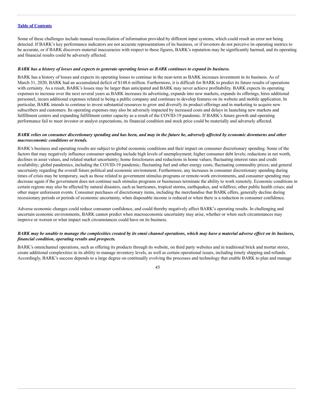 Table of Contents Some of these challenges include manual reconciliation of information provided by different input systems, which could result an error not being detected. If BARK’s key performance indicators are not accurate representations of its business, or if investors do not perceive its operating metrics to be accurate, or if BARK discovers material inaccuracies with respect to these figures, BARK’s reputation may be significantly harmed, and its operating and financial results could be adversely affected. BARK has a history of losses and expects to generate operating losses as BARK continues to expand its business. BARK has a history of losses and expects its operating losses to continue in the near-term as BARK increases investment in its business. As of March 31, 2020, BARK had an accumulated deficit of $148.6 million. Furthermore, it is difficult for BARK to predict its future results of operations with certainty. As a result, BARK’s losses may be larger than anticipated and BARK may never achieve profitability. BARK expects its operating expenses to increase over the next several years as BARK increases its advertising, expands into new markets, expands its offerings, hires additional personnel, incurs additional expenses related to being a public company and continues to develop features on its website and mobile application. In particular, BARK intends to continue to invest substantial resources to grow and diversify its product offerings and in marketing to acquire new subscribers and customers. Its operating expenses may also be adversely impacted by increased costs and delays in launching new markets and fulfillment centers and expanding fulfillment center capacity as a result of the COVID-19 pandemic. If BARK’s future growth and operating performance fail to meet investor or analyst expectations, its financial condition and stock price could be materially and adversely affected. BARK relies on consumer discretionary spending and has been, and may in the future be, adversely affected by economic downturns and other macroeconomic conditions or trends. BARK’s business and operating results are subject to global economic conditions and their impact on consumer discretionary spending. Some of the factors that may negatively influence consumer spending include high levels of unemployment; higher consumer debt levels; reductions in net worth, declines in asset values, and related market uncertainty; home foreclosures and reductions in home values; fluctuating interest rates and credit availability; global pandemics, including the COVID-19 pandemic; fluctuating fuel and other energy costs; fluctuating commodity prices; and general uncertainty regarding the overall future political and economic environment. Furthermore, any increases in consumer discretionary spending during times of crisis may be temporary, such as those related to government stimulus programs or remote-work environments, and consumer spending may decrease again if the government does not continue such stimulus programs or businesses terminate the ability to work remotely. Economic conditions in certain regions may also be affected by natural disasters, such as hurricanes, tropical storms, earthquakes, and wildfires; other public health crises; and other major unforeseen events. Consumer purchases of discretionary items, including the merchandise that BARK offers, generally decline during recessionary periods or periods of economic uncertainty, when disposable income is reduced or when there is a reduction in consumer confidence. Adverse economic changes could reduce consumer confidence, and could thereby negatively affect BARK’s operating results. In challenging and uncertain economic environments, BARK cannot predict when macroeconomic uncertainty may arise, whether or when such circumstances may improve or worsen or what impact such circumstances could have on its business. BARK may be unable to manage the complexities created by its omni channel operations, which may have a material adverse effect on its business, financial condition, operating results and prospects. BARK’s omnichannel operations, such as offering its products through its website, on third party websites and in traditional brick and mortar stores, create additional complexities in its ability to manage inventory levels, as well as certain operational issues, including timely shipping and refunds. Accordingly, BARK’s success depends to a large degree on continually evolving the processes and technology that enable BARK to plan and manage   45