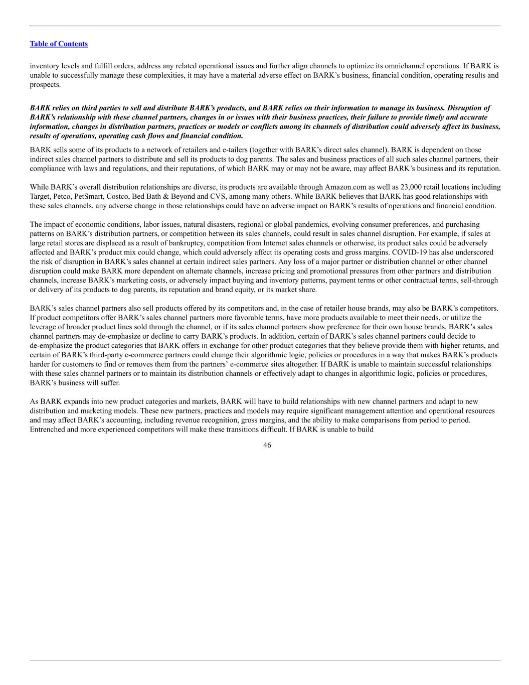 Table of Contents inventory levels and fulfill orders, address any related operational issues and further align channels to optimize its omnichannel operations. If BARK is unable to successfully manage these complexities, it may have a material adverse effect on BARK’s business, financial condition, operating results and prospects. BARK relies on third parties to sell and distribute BARK’s products, and BARK relies on their information to manage its business. Disruption of BARK’s relationship with these channel partners, changes in or issues with their business practices, their failure to provide timely and accurate information, changes in distribution partners, practices or models or conflicts among its channels of distribution could adversely affect its business, results of operations, operating cash flows and financial condition. BARK sells some of its products to a network of retailers and e-tailers (together with BARK’s direct sales channel). BARK is dependent on those indirect sales channel partners to distribute and sell its products to dog parents. The sales and business practices of all such sales channel partners, their compliance with laws and regulations, and their reputations, of which BARK may or may not be aware, may affect BARK’s business and its reputation. While BARK’s overall distribution relationships are diverse, its products are available through Amazon.com as well as 23,000 retail locations including Target, Petco, PetSmart, Costco, Bed Bath & Beyond and CVS, among many others. While BARK believes that BARK has good relationships with these sales channels, any adverse change in those relationships could have an adverse impact on BARK’s results of operations and financial condition. The impact of economic conditions, labor issues, natural disasters, regional or global pandemics, evolving consumer preferences, and purchasing patterns on BARK’s distribution partners, or competition between its sales channels, could result in sales channel disruption. For example, if sales at large retail stores are displaced as a result of bankruptcy, competition from Internet sales channels or otherwise, its product sales could be adversely affected and BARK’s product mix could change, which could adversely affect its operating costs and gross margins. COVID-19 has also underscored the risk of disruption in BARK’s sales channel at certain indirect sales partners. Any loss of a major partner or distribution channel or other channel disruption could make BARK more dependent on alternate channels, increase pricing and promotional pressures from other partners and distribution channels, increase BARK’s marketing costs, or adversely impact buying and inventory patterns, payment terms or other contractual terms, sell-through or delivery of its products to dog parents, its reputation and brand equity, or its market share. BARK’s sales channel partners also sell products offered by its competitors and, in the case of retailer house brands, may also be BARK’s competitors. If product competitors offer BARK’s sales channel partners more favorable terms, have more products available to meet their needs, or utilize the leverage of broader product lines sold through the channel, or if its sales channel partners show preference for their own house brands, BARK’s sales channel partners may de-emphasize or decline to carry BARK’s products. In addition, certain of BARK’s sales channel partners could decide to de-emphasize the product categories that BARK offers in exchange for other product categories that they believe provide them with higher returns, and certain of BARK’s third-party e-commerce partners could change their algorithmic logic, policies or procedures in a way that makes BARK’s products harder for customers to find or removes them from the partners’ e-commerce sites altogether. If BARK is unable to maintain successful relationships with these sales channel partners or to maintain its distribution channels or effectively adapt to changes in algorithmic logic, policies or procedures, BARK’s business will suffer. As BARK expands into new product categories and markets, BARK will have to build relationships with new channel partners and adapt to new distribution and marketing models. These new partners, practices and models may require significant management attention and operational resources and may affect BARK’s accounting, including revenue recognition, gross margins, and the ability to make comparisons from period to period. Entrenched and more experienced competitors will make these transitions difficult. If BARK is unable to build   46