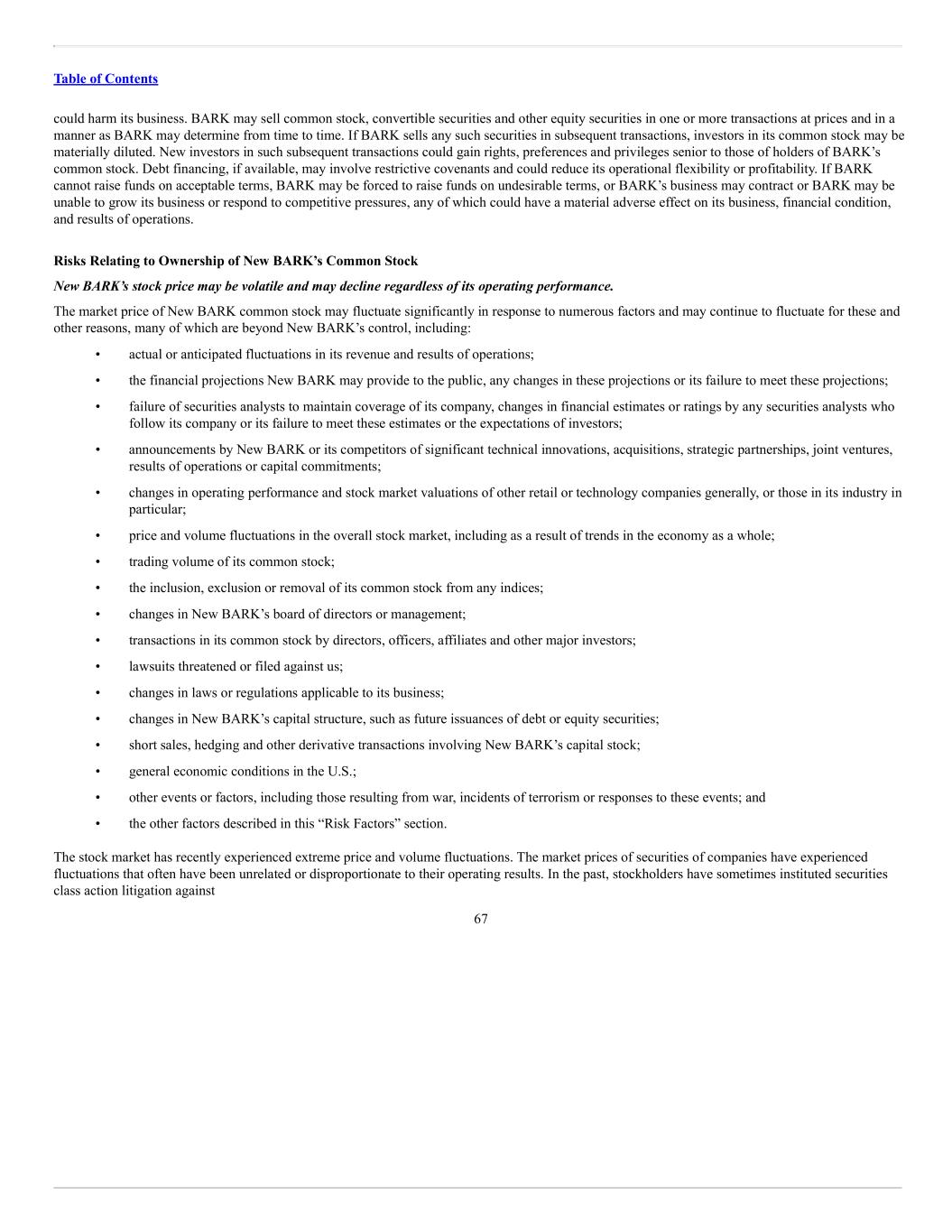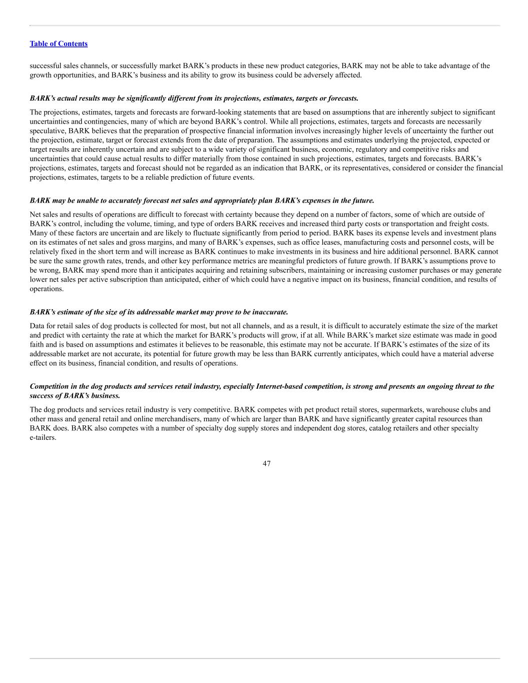 Table of Contents successful sales channels, or successfully market BARK’s products in these new product categories, BARK may not be able to take advantage of the growth opportunities, and BARK’s business and its ability to grow its business could be adversely affected. BARK’s actual results may be significantly different from its projections, estimates, targets or forecasts. The projections, estimates, targets and forecasts are forward-looking statements that are based on assumptions that are inherently subject to significant uncertainties and contingencies, many of which are beyond BARK’s control. While all projections, estimates, targets and forecasts are necessarily speculative, BARK believes that the preparation of prospective financial information involves increasingly higher levels of uncertainty the further out the projection, estimate, target or forecast extends from the date of preparation. The assumptions and estimates underlying the projected, expected or target results are inherently uncertain and are subject to a wide variety of significant business, economic, regulatory and competitive risks and uncertainties that could cause actual results to differ materially from those contained in such projections, estimates, targets and forecasts. BARK’s projections, estimates, targets and forecast should not be regarded as an indication that BARK, or its representatives, considered or consider the financial projections, estimates, targets to be a reliable prediction of future events. BARK may be unable to accurately forecast net sales and appropriately plan BARK’s expenses in the future. Net sales and results of operations are difficult to forecast with certainty because they depend on a number of factors, some of which are outside of BARK’s control, including the volume, timing, and type of orders BARK receives and increased third party costs or transportation and freight costs. Many of these factors are uncertain and are likely to fluctuate significantly from period to period. BARK bases its expense levels and investment plans on its estimates of net sales and gross margins, and many of BARK’s expenses, such as office leases, manufacturing costs and personnel costs, will be relatively fixed in the short term and will increase as BARK continues to make investments in its business and hire additional personnel. BARK cannot be sure the same growth rates, trends, and other key performance metrics are meaningful predictors of future growth. If BARK’s assumptions prove to be wrong, BARK may spend more than it anticipates acquiring and retaining subscribers, maintaining or increasing customer purchases or may generate lower net sales per active subscription than anticipated, either of which could have a negative impact on its business, financial condition, and results of operations. BARK’s estimate of the size of its addressable market may prove to be inaccurate. Data for retail sales of dog products is collected for most, but not all channels, and as a result, it is difficult to accurately estimate the size of the market and predict with certainty the rate at which the market for BARK’s products will grow, if at all. While BARK’s market size estimate was made in good faith and is based on assumptions and estimates it believes to be reasonable, this estimate may not be accurate. If BARK’s estimates of the size of its addressable market are not accurate, its potential for future growth may be less than BARK currently anticipates, which could have a material adverse effect on its business, financial condition, and results of operations. Competition in the dog products and services retail industry, especially Internet-based competition, is strong and presents an ongoing threat to the success of BARK’s business. The dog products and services retail industry is very competitive. BARK competes with pet product retail stores, supermarkets, warehouse clubs and other mass and general retail and online merchandisers, many of which are larger than BARK and have significantly greater capital resources than BARK does. BARK also competes with a number of specialty dog supply stores and independent dog stores, catalog retailers and other specialty e-tailers.     47