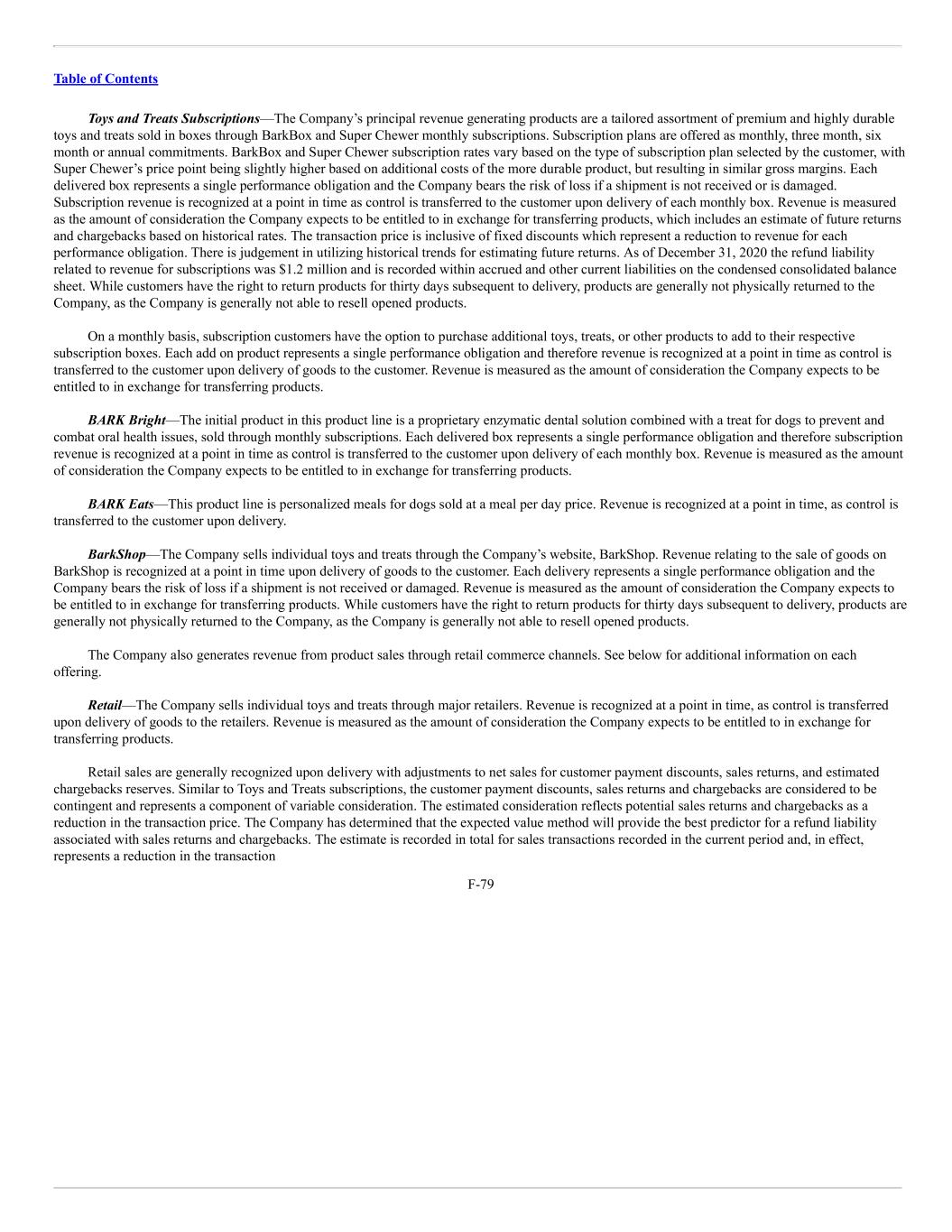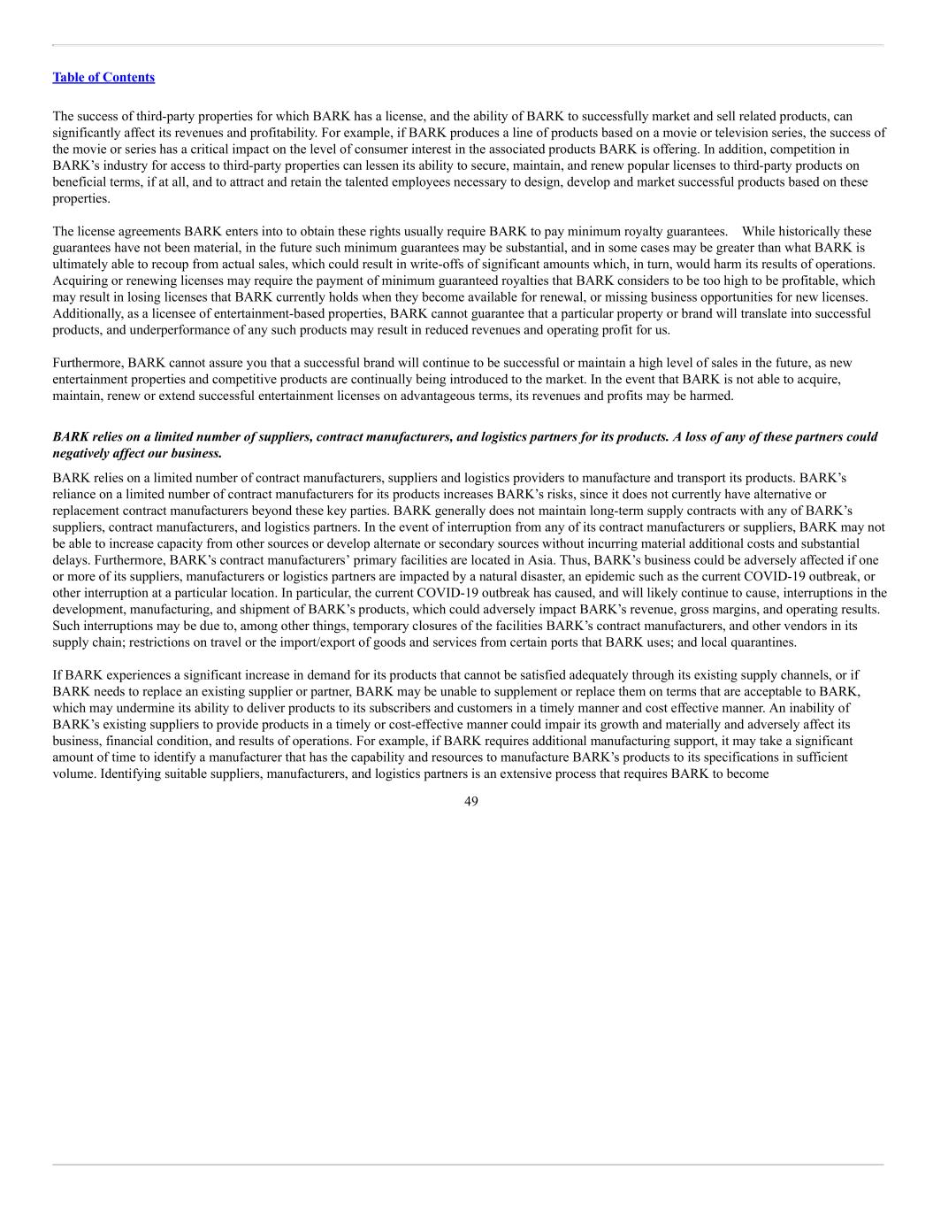 Table of Contents The success of third-party properties for which BARK has a license, and the ability of BARK to successfully market and sell related products, can significantly affect its revenues and profitability. For example, if BARK produces a line of products based on a movie or television series, the success of the movie or series has a critical impact on the level of consumer interest in the associated products BARK is offering. In addition, competition in BARK’s industry for access to third-party properties can lessen its ability to secure, maintain, and renew popular licenses to third-party products on beneficial terms, if at all, and to attract and retain the talented employees necessary to design, develop and market successful products based on these properties. The license agreements BARK enters into to obtain these rights usually require BARK to pay minimum royalty guarantees.    While historically these guarantees have not been material, in the future such minimum guarantees may be substantial, and in some cases may be greater than what BARK is ultimately able to recoup from actual sales, which could result in write-offs of significant amounts which, in turn, would harm its results of operations. Acquiring or renewing licenses may require the payment of minimum guaranteed royalties that BARK considers to be too high to be profitable, which may result in losing licenses that BARK currently holds when they become available for renewal, or missing business opportunities for new licenses. Additionally, as a licensee of entertainment-based properties, BARK cannot guarantee that a particular property or brand will translate into successful products, and underperformance of any such products may result in reduced revenues and operating profit for us. Furthermore, BARK cannot assure you that a successful brand will continue to be successful or maintain a high level of sales in the future, as new entertainment properties and competitive products are continually being introduced to the market. In the event that BARK is not able to acquire, maintain, renew or extend successful entertainment licenses on advantageous terms, its revenues and profits may be harmed. BARK relies on a limited number of suppliers, contract manufacturers, and logistics partners for its products. A loss of any of these partners could negatively affect our business. BARK relies on a limited number of contract manufacturers, suppliers and logistics providers to manufacture and transport its products. BARK’s reliance on a limited number of contract manufacturers for its products increases BARK’s risks, since it does not currently have alternative or replacement contract manufacturers beyond these key parties. BARK generally does not maintain long-term supply contracts with any of BARK’s suppliers, contract manufacturers, and logistics partners. In the event of interruption from any of its contract manufacturers or suppliers, BARK may not be able to increase capacity from other sources or develop alternate or secondary sources without incurring material additional costs and substantial delays. Furthermore, BARK’s contract manufacturers’ primary facilities are located in Asia. Thus, BARK’s business could be adversely affected if one or more of its suppliers, manufacturers or logistics partners are impacted by a natural disaster, an epidemic such as the current COVID-19 outbreak, or other interruption at a particular location. In particular, the current COVID-19 outbreak has caused, and will likely continue to cause, interruptions in the development, manufacturing, and shipment of BARK’s products, which could adversely impact BARK’s revenue, gross margins, and operating results. Such interruptions may be due to, among other things, temporary closures of the facilities BARK’s contract manufacturers, and other vendors in its supply chain; restrictions on travel or the import/export of goods and services from certain ports that BARK uses; and local quarantines. If BARK experiences a significant increase in demand for its products that cannot be satisfied adequately through its existing supply channels, or if BARK needs to replace an existing supplier or partner, BARK may be unable to supplement or replace them on terms that are acceptable to BARK, which may undermine its ability to deliver products to its subscribers and customers in a timely manner and cost effective manner. An inability of BARK’s existing suppliers to provide products in a timely or cost-effective manner could impair its growth and materially and adversely affect its business, financial condition, and results of operations. For example, if BARK requires additional manufacturing support, it may take a significant amount of time to identify a manufacturer that has the capability and resources to manufacture BARK’s products to its specifications in sufficient volume. Identifying suitable suppliers, manufacturers, and logistics partners is an extensive process that requires BARK to become   49
