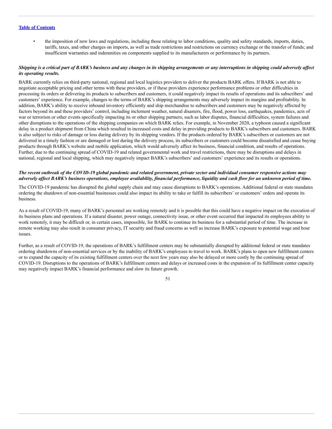 Table of Contents   •   the imposition of new laws and regulations, including those relating to labor conditions, quality and safety standards, imports, duties, tariffs, taxes, and other charges on imports, as well as trade restrictions and restrictions on currency exchange or the transfer of funds; and insufficient warranties and indemnities on components supplied to its manufacturers or performance by its partners. Shipping is a critical part of BARK’s business and any changes in its shipping arrangements or any interruptions in shipping could adversely affect its operating results. BARK currently relies on third-party national, regional and local logistics providers to deliver the products BARK offers. If BARK is not able to negotiate acceptable pricing and other terms with these providers, or if these providers experience performance problems or other difficulties in processing its orders or delivering its products to subscribers and customers, it could negatively impact its results of operations and its subscribers’ and customers’ experience. For example, changes to the terms of BARK’s shipping arrangements may adversely impact its margins and profitability. In addition, BARK’s ability to receive inbound inventory efficiently and ship merchandise to subscribers and customers may be negatively affected by factors beyond its and these providers’ control, including inclement weather, natural disasters, fire, flood, power loss, earthquakes, pandemics, acts of war or terrorism or other events specifically impacting its or other shipping partners, such as labor disputes, financial difficulties, system failures and other disruptions to the operations of the shipping companies on which BARK relies. For example, in November 2020, a typhoon caused a significant delay in a product shipment from China which resulted in increased costs and delay in providing products to BARK’s subscribers and customers. BARK is also subject to risks of damage or loss during delivery by its shipping vendors. If the products ordered by BARK’s subscribers or customers are not delivered in a timely fashion or are damaged or lost during the delivery process, its subscribers or customers could become dissatisfied and cease buying products through BARK’s website and mobile application, which would adversely affect its business, financial condition, and results of operations. Further, due to the continuing spread of COVID-19 and related governmental work and travel restrictions, there may be disruptions and delays in national, regional and local shipping, which may negatively impact BARK’s subscribers’ and customers’ experience and its results or operations. The recent outbreak of the COVID-19 global pandemic and related government, private sector and individual consumer responsive actions may adversely affect BARK’s business operations, employee availability, financial performance, liquidity and cash flow for an unknown period of time. The COVID-19 pandemic has disrupted the global supply chain and may cause disruptions to BARK’s operations. Additional federal or state mandates ordering the shutdown of non-essential businesses could also impact its ability to take or fulfill its subscribers’ or customers’ orders and operate its business. As a result of COVID-19, many of BARK’s personnel are working remotely and it is possible that this could have a negative impact on the execution of its business plans and operations. If a natural disaster, power outage, connectivity issue, or other event occurred that impacted its employees ability to work remotely, it may be difficult or, in certain cases, impossible, for BARK to continue its business for a substantial period of time. The increase in remote working may also result in consumer privacy, IT security and fraud concerns as well as increase BARK’s exposure to potential wage and hour issues. Further, as a result of COVID-19, the operations of BARK’s fulfillment centers may be substantially disrupted by additional federal or state mandates ordering shutdowns of non-essential services or by the inability of BARK’s employees to travel to work. BARK’s plans to open new fulfillment centers or to expand the capacity of its existing fulfillment centers over the next few years may also be delayed or more costly by the continuing spread of COVID-19. Disruptions to the operations of BARK’s fulfillment centers and delays or increased costs in the expansion of its fulfillment center capacity may negatively impact BARK’s financial performance and slow its future growth.   51