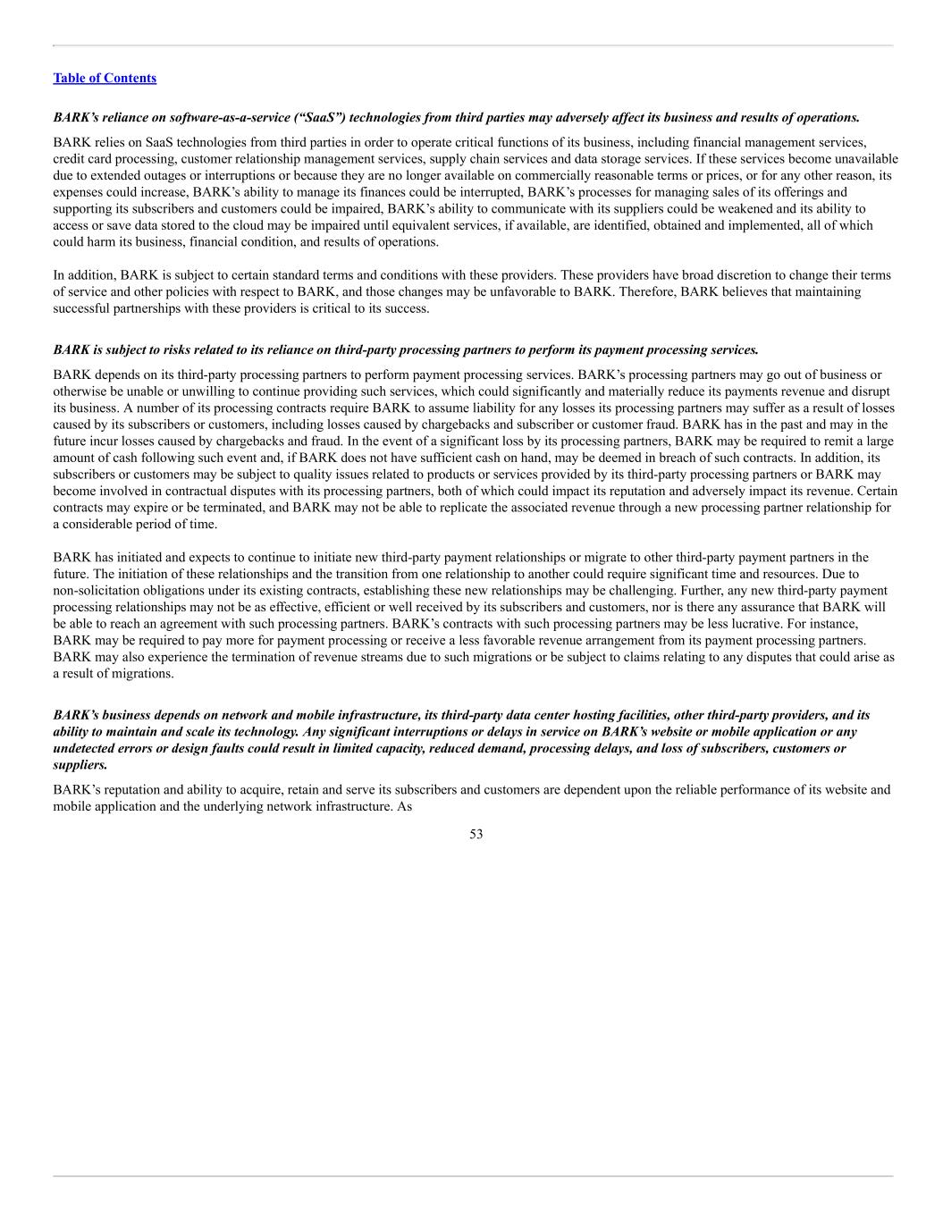 Table of Contents BARK’s reliance on software-as-a-service (“SaaS”) technologies from third parties may adversely affect its business and results of operations. BARK relies on SaaS technologies from third parties in order to operate critical functions of its business, including financial management services, credit card processing, customer relationship management services, supply chain services and data storage services. If these services become unavailable due to extended outages or interruptions or because they are no longer available on commercially reasonable terms or prices, or for any other reason, its expenses could increase, BARK’s ability to manage its finances could be interrupted, BARK’s processes for managing sales of its offerings and supporting its subscribers and customers could be impaired, BARK’s ability to communicate with its suppliers could be weakened and its ability to access or save data stored to the cloud may be impaired until equivalent services, if available, are identified, obtained and implemented, all of which could harm its business, financial condition, and results of operations. In addition, BARK is subject to certain standard terms and conditions with these providers. These providers have broad discretion to change their terms of service and other policies with respect to BARK, and those changes may be unfavorable to BARK. Therefore, BARK believes that maintaining successful partnerships with these providers is critical to its success. BARK is subject to risks related to its reliance on third-party processing partners to perform its payment processing services. BARK depends on its third-party processing partners to perform payment processing services. BARK’s processing partners may go out of business or otherwise be unable or unwilling to continue providing such services, which could significantly and materially reduce its payments revenue and disrupt its business. A number of its processing contracts require BARK to assume liability for any losses its processing partners may suffer as a result of losses caused by its subscribers or customers, including losses caused by chargebacks and subscriber or customer fraud. BARK has in the past and may in the future incur losses caused by chargebacks and fraud. In the event of a significant loss by its processing partners, BARK may be required to remit a large amount of cash following such event and, if BARK does not have sufficient cash on hand, may be deemed in breach of such contracts. In addition, its subscribers or customers may be subject to quality issues related to products or services provided by its third-party processing partners or BARK may become involved in contractual disputes with its processing partners, both of which could impact its reputation and adversely impact its revenue. Certain contracts may expire or be terminated, and BARK may not be able to replicate the associated revenue through a new processing partner relationship for a considerable period of time. BARK has initiated and expects to continue to initiate new third-party payment relationships or migrate to other third-party payment partners in the future. The initiation of these relationships and the transition from one relationship to another could require significant time and resources. Due to non-solicitation obligations under its existing contracts, establishing these new relationships may be challenging. Further, any new third-party payment processing relationships may not be as effective, efficient or well received by its subscribers and customers, nor is there any assurance that BARK will be able to reach an agreement with such processing partners. BARK’s contracts with such processing partners may be less lucrative. For instance, BARK may be required to pay more for payment processing or receive a less favorable revenue arrangement from its payment processing partners. BARK may also experience the termination of revenue streams due to such migrations or be subject to claims relating to any disputes that could arise as a result of migrations. BARK’s business depends on network and mobile infrastructure, its third-party data center hosting facilities, other third-party providers, and its ability to maintain and scale its technology. Any significant interruptions or delays in service on BARK’s website or mobile application or any undetected errors or design faults could result in limited capacity, reduced demand, processing delays, and loss of subscribers, customers or suppliers. BARK’s reputation and ability to acquire, retain and serve its subscribers and customers are dependent upon the reliable performance of its website and mobile application and the underlying network infrastructure. As   53