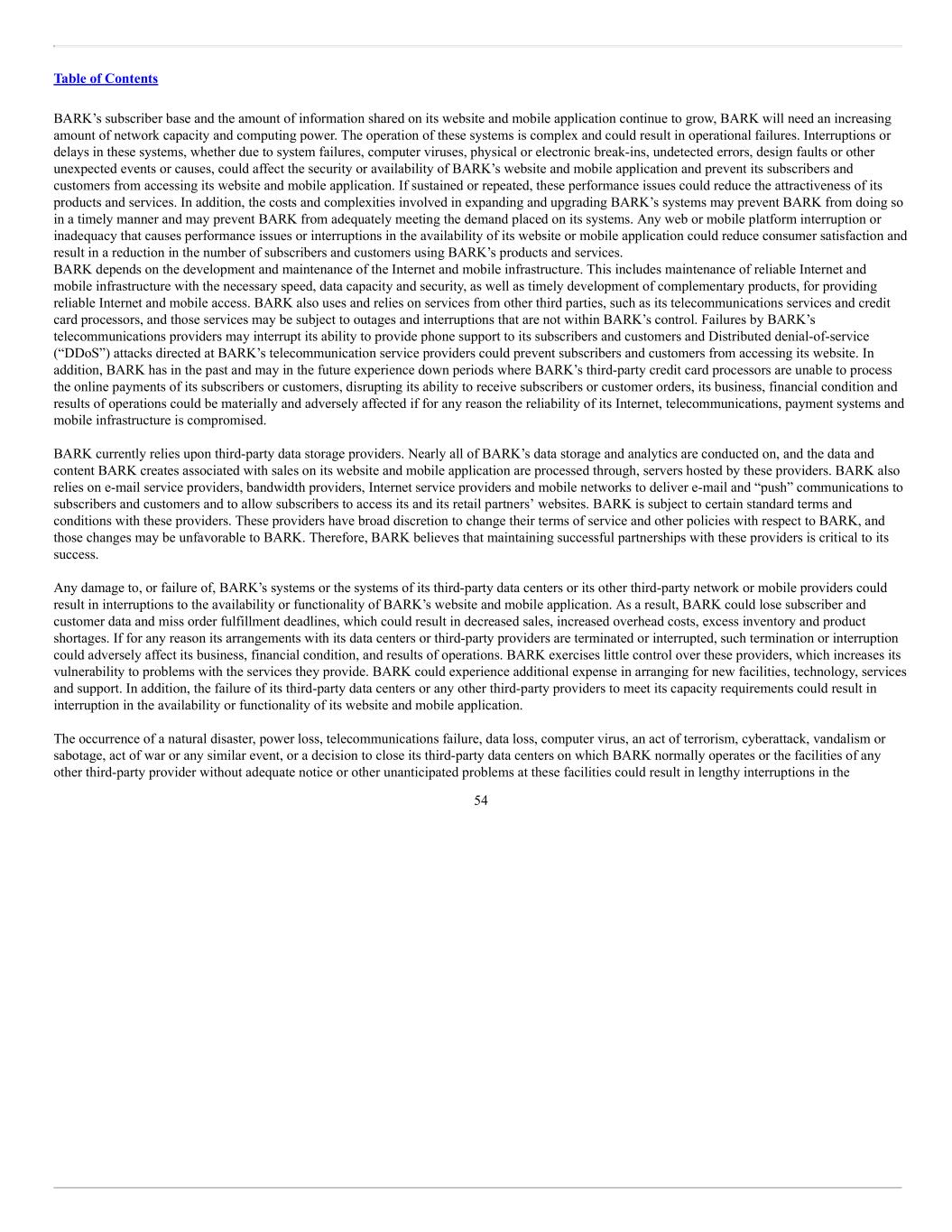 Table of Contents BARK’s subscriber base and the amount of information shared on its website and mobile application continue to grow, BARK will need an increasing amount of network capacity and computing power. The operation of these systems is complex and could result in operational failures. Interruptions or delays in these systems, whether due to system failures, computer viruses, physical or electronic break-ins, undetected errors, design faults or other unexpected events or causes, could affect the security or availability of BARK’s website and mobile application and prevent its subscribers and customers from accessing its website and mobile application. If sustained or repeated, these performance issues could reduce the attractiveness of its products and services. In addition, the costs and complexities involved in expanding and upgrading BARK’s systems may prevent BARK from doing so in a timely manner and may prevent BARK from adequately meeting the demand placed on its systems. Any web or mobile platform interruption or inadequacy that causes performance issues or interruptions in the availability of its website or mobile application could reduce consumer satisfaction and result in a reduction in the number of subscribers and customers using BARK’s products and services. BARK depends on the development and maintenance of the Internet and mobile infrastructure. This includes maintenance of reliable Internet and mobile infrastructure with the necessary speed, data capacity and security, as well as timely development of complementary products, for providing reliable Internet and mobile access. BARK also uses and relies on services from other third parties, such as its telecommunications services and credit card processors, and those services may be subject to outages and interruptions that are not within BARK’s control. Failures by BARK’s telecommunications providers may interrupt its ability to provide phone support to its subscribers and customers and Distributed denial-of-service (“DDoS”) attacks directed at BARK’s telecommunication service providers could prevent subscribers and customers from accessing its website. In addition, BARK has in the past and may in the future experience down periods where BARK’s third-party credit card processors are unable to process the online payments of its subscribers or customers, disrupting its ability to receive subscribers or customer orders, its business, financial condition and results of operations could be materially and adversely affected if for any reason the reliability of its Internet, telecommunications, payment systems and mobile infrastructure is compromised. BARK currently relies upon third-party data storage providers. Nearly all of BARK’s data storage and analytics are conducted on, and the data and content BARK creates associated with sales on its website and mobile application are processed through, servers hosted by these providers. BARK also relies on e-mail service providers, bandwidth providers, Internet service providers and mobile networks to deliver e-mail and “push” communications to subscribers and customers and to allow subscribers to access its and its retail partners’ websites. BARK is subject to certain standard terms and conditions with these providers. These providers have broad discretion to change their terms of service and other policies with respect to BARK, and those changes may be unfavorable to BARK. Therefore, BARK believes that maintaining successful partnerships with these providers is critical to its success. Any damage to, or failure of, BARK’s systems or the systems of its third-party data centers or its other third-party network or mobile providers could result in interruptions to the availability or functionality of BARK’s website and mobile application. As a result, BARK could lose subscriber and customer data and miss order fulfillment deadlines, which could result in decreased sales, increased overhead costs, excess inventory and product shortages. If for any reason its arrangements with its data centers or third-party providers are terminated or interrupted, such termination or interruption could adversely affect its business, financial condition, and results of operations. BARK exercises little control over these providers, which increases its vulnerability to problems with the services they provide. BARK could experience additional expense in arranging for new facilities, technology, services and support. In addition, the failure of its third-party data centers or any other third-party providers to meet its capacity requirements could result in interruption in the availability or functionality of its website and mobile application. The occurrence of a natural disaster, power loss, telecommunications failure, data loss, computer virus, an act of terrorism, cyberattack, vandalism or sabotage, act of war or any similar event, or a decision to close its third-party data centers on which BARK normally operates or the facilities of any other third-party provider without adequate notice or other unanticipated problems at these facilities could result in lengthy interruptions in the   54