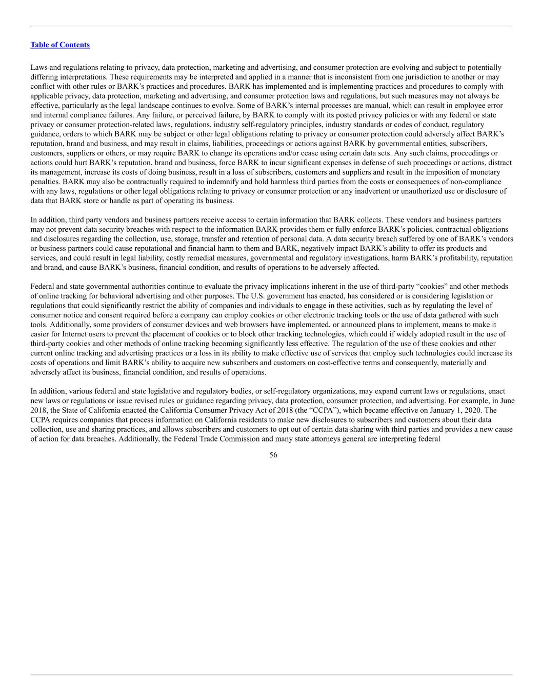 Table of Contents Laws and regulations relating to privacy, data protection, marketing and advertising, and consumer protection are evolving and subject to potentially differing interpretations. These requirements may be interpreted and applied in a manner that is inconsistent from one jurisdiction to another or may conflict with other rules or BARK’s practices and procedures. BARK has implemented and is implementing practices and procedures to comply with applicable privacy, data protection, marketing and advertising, and consumer protection laws and regulations, but such measures may not always be effective, particularly as the legal landscape continues to evolve. Some of BARK’s internal processes are manual, which can result in employee error and internal compliance failures. Any failure, or perceived failure, by BARK to comply with its posted privacy policies or with any federal or state privacy or consumer protection-related laws, regulations, industry self-regulatory principles, industry standards or codes of conduct, regulatory guidance, orders to which BARK may be subject or other legal obligations relating to privacy or consumer protection could adversely affect BARK’s reputation, brand and business, and may result in claims, liabilities, proceedings or actions against BARK by governmental entities, subscribers, customers, suppliers or others, or may require BARK to change its operations and/or cease using certain data sets. Any such claims, proceedings or actions could hurt BARK’s reputation, brand and business, force BARK to incur significant expenses in defense of such proceedings or actions, distract its management, increase its costs of doing business, result in a loss of subscribers, customers and suppliers and result in the imposition of monetary penalties. BARK may also be contractually required to indemnify and hold harmless third parties from the costs or consequences of non-compliance with any laws, regulations or other legal obligations relating to privacy or consumer protection or any inadvertent or unauthorized use or disclosure of data that BARK store or handle as part of operating its business. In addition, third party vendors and business partners receive access to certain information that BARK collects. These vendors and business partners may not prevent data security breaches with respect to the information BARK provides them or fully enforce BARK’s policies, contractual obligations and disclosures regarding the collection, use, storage, transfer and retention of personal data. A data security breach suffered by one of BARK’s vendors or business partners could cause reputational and financial harm to them and BARK, negatively impact BARK’s ability to offer its products and services, and could result in legal liability, costly remedial measures, governmental and regulatory investigations, harm BARK’s profitability, reputation and brand, and cause BARK’s business, financial condition, and results of operations to be adversely affected. Federal and state governmental authorities continue to evaluate the privacy implications inherent in the use of third-party “cookies” and other methods of online tracking for behavioral advertising and other purposes. The U.S. government has enacted, has considered or is considering legislation or regulations that could significantly restrict the ability of companies and individuals to engage in these activities, such as by regulating the level of consumer notice and consent required before a company can employ cookies or other electronic tracking tools or the use of data gathered with such tools. Additionally, some providers of consumer devices and web browsers have implemented, or announced plans to implement, means to make it easier for Internet users to prevent the placement of cookies or to block other tracking technologies, which could if widely adopted result in the use of third-party cookies and other methods of online tracking becoming significantly less effective. The regulation of the use of these cookies and other current online tracking and advertising practices or a loss in its ability to make effective use of services that employ such technologies could increase its costs of operations and limit BARK’s ability to acquire new subscribers and customers on cost-effective terms and consequently, materially and adversely affect its business, financial condition, and results of operations. In addition, various federal and state legislative and regulatory bodies, or self-regulatory organizations, may expand current laws or regulations, enact new laws or regulations or issue revised rules or guidance regarding privacy, data protection, consumer protection, and advertising. For example, in June 2018, the State of California enacted the California Consumer Privacy Act of 2018 (the “CCPA”), which became effective on January 1, 2020. The CCPA requires companies that process information on California residents to make new disclosures to subscribers and customers about their data collection, use and sharing practices, and allows subscribers and customers to opt out of certain data sharing with third parties and provides a new cause of action for data breaches. Additionally, the Federal T