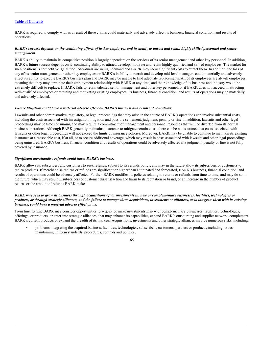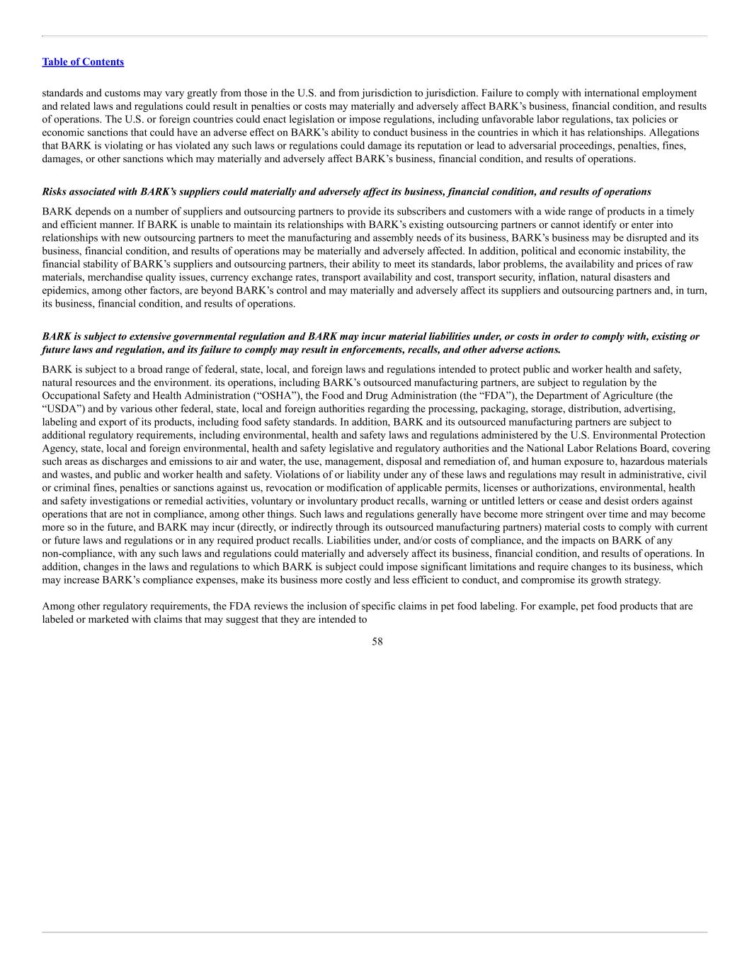 Table of Contents standards and customs may vary greatly from those in the U.S. and from jurisdiction to jurisdiction. Failure to comply with international employment and related laws and regulations could result in penalties or costs may materially and adversely affect BARK’s business, financial condition, and results of operations. The U.S. or foreign countries could enact legislation or impose regulations, including unfavorable labor regulations, tax policies or economic sanctions that could have an adverse effect on BARK’s ability to conduct business in the countries in which it has relationships. Allegations that BARK is violating or has violated any such laws or regulations could damage its reputation or lead to adversarial proceedings, penalties, fines, damages, or other sanctions which may materially and adversely affect BARK’s business, financial condition, and results of operations. Risks associated with BARK’s suppliers could materially and adversely affect its business, financial condition, and results of operations BARK depends on a number of suppliers and outsourcing partners to provide its subscribers and customers with a wide range of products in a timely and efficient manner. If BARK is unable to maintain its relationships with BARK’s existing outsourcing partners or cannot identify or enter into relationships with new outsourcing partners to meet the manufacturing and assembly needs of its business, BARK’s business may be disrupted and its business, financial condition, and results of operations may be materially and adversely affected. In addition, political and economic instability, the financial stability of BARK’s suppliers and outsourcing partners, their ability to meet its standards, labor problems, the availability and prices of raw materials, merchandise quality issues, currency exchange rates, transport availability and cost, transport security, inflation, natural disasters and epidemics, among other factors, are beyond BARK’s control and may materially and adversely affect its suppliers and outsourcing partners and, in turn, its business, financial condition, and results of operations. BARK is subject to extensive governmental regulation and BARK may incur material liabilities under, or costs in order to comply with, existing or future laws and regulation, and its failure to comply may result in enforcements, recalls, and other adverse actions. BARK is subject to a broad range of federal, state, local, and foreign laws and regulations intended to protect public and worker health and safety, natural resources and the environment. its operations, including BARK’s outsourced manufacturing partners, are subject to regulation by the Occupational Safety and Health Administration (“OSHA”), the Food and Drug Administration (the “FDA”), the Department of Agriculture (the “USDA”) and by various other federal, state, local and foreign authorities regarding the processing, packaging, storage, distribution, advertising, labeling and export of its products, including food safety standards. In addition, BARK and its outsourced manufacturing partners are subject to additional regulatory requirements, including environmental, health and safety laws and regulations administered by the U.S. Environmental Protection Agency, state, local and foreign environmental, health and safety legislative and regulatory authorities and the National Labor Relations Board, covering such areas as discharges and emissions to air and water, the use, management, disposal and remediation of, and human exposure to, hazardous materials and wastes, and public and worker health and safety. Violations of or liability under any of these laws and regulations may result in administrative, civil or criminal fines, penalties or sanctions against us, revocation or modification of applicable permits, licenses or authorizations, environmental, health and safety investigations or remedial activities, voluntary or involuntary product recalls, warning or untitled letters or cease and desist orders against operations that are not in compliance, among other things. Such laws and regulations generally have become more stringent over time and may become more so in the future, and BARK may incur (directly, or indirectly through its outsourced manufacturing partners) material costs to comply with current or future laws and regulations or in any required product recalls. Liabilities under, and/or costs of compliance, and the impacts on BARK of any non-compliance, with any such laws and regulations could materially and adversely affect its business, financial condition, and results of operations. In addition, changes in the laws and regulations to which BARK is subject could impose significant limitations and require changes to its business, which may increase BARK’s compliance expenses, make its business more costly and less efficient to conduct, and compromise its growth strategy. Among other regulatory requirements, the FDA reviews the inclusion of specific claims in pet food labeling. For example, pet food products that are labeled or marketed with claims that may suggest that they are intended to   58