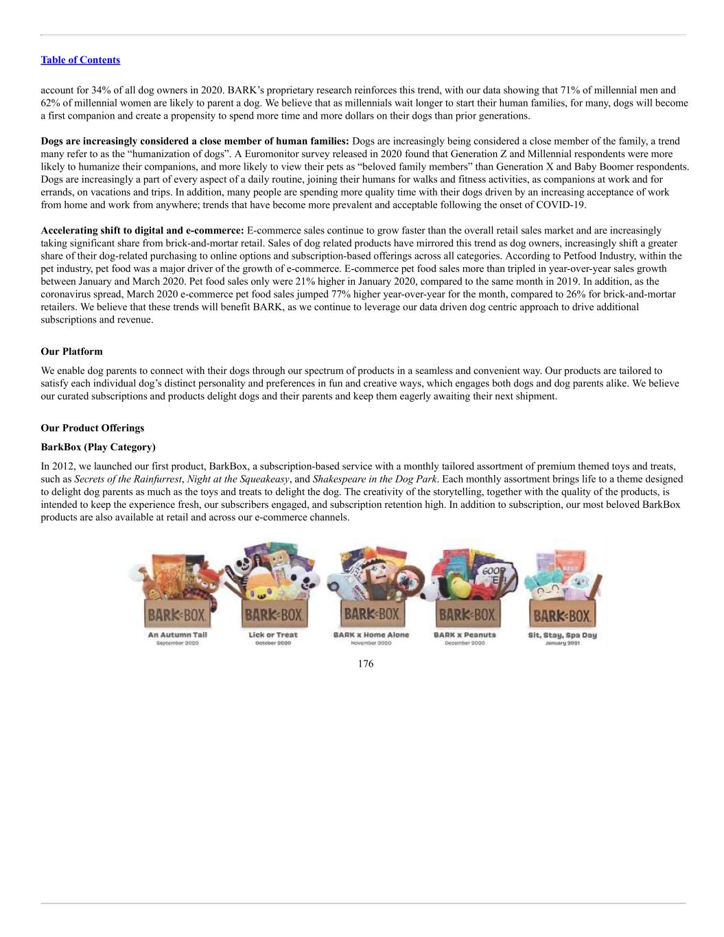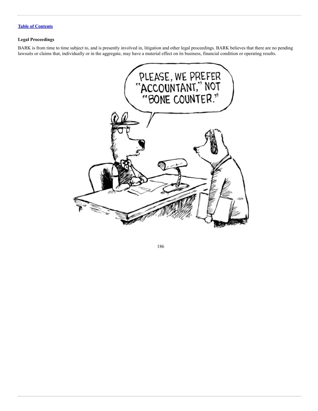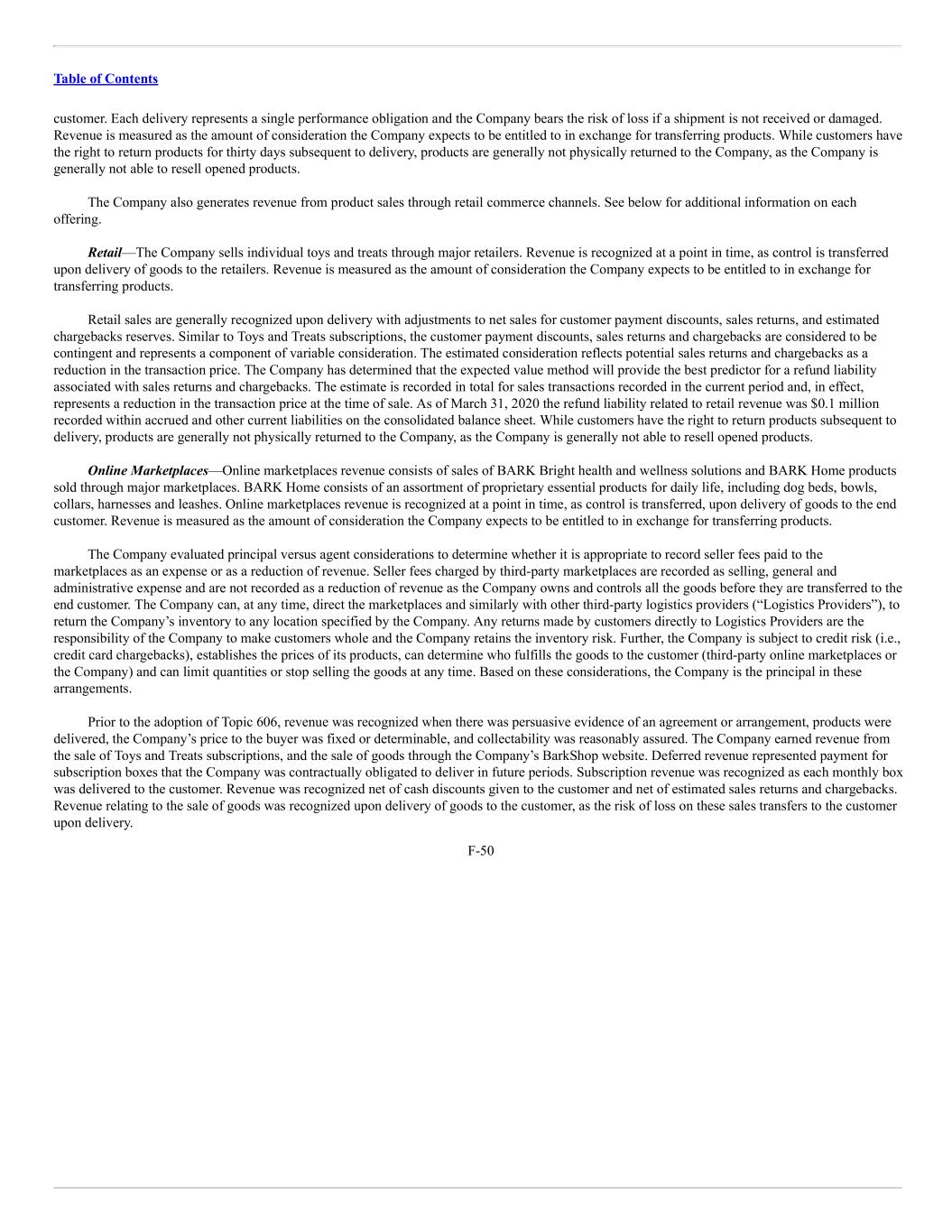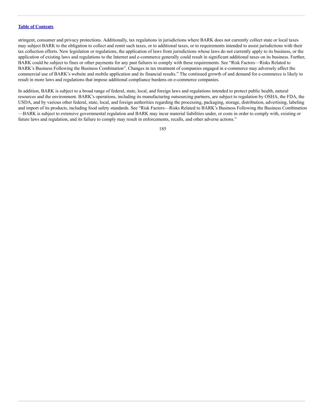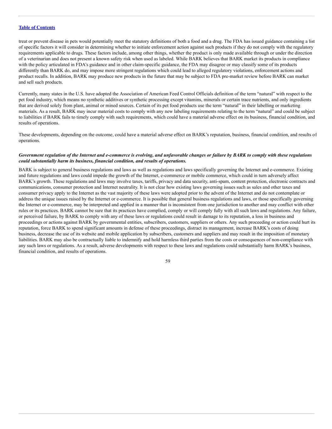 Table of Contents treat or prevent disease in pets would potentially meet the statutory definitions of both a food and a drug. The FDA has issued guidance containing a list of specific factors it will consider in determining whether to initiate enforcement action against such products if they do not comply with the regulatory requirements applicable to drugs. These factors include, among other things, whether the product is only made available through or under the direction of a veterinarian and does not present a known safety risk when used as labeled. While BARK believes that BARK market its products in compliance with the policy articulated in FDA’s guidance and in other claim-specific guidance, the FDA may disagree or may classify some of its products differently than BARK do, and may impose more stringent regulations which could lead to alleged regulatory violations, enforcement actions and product recalls. In addition, BARK may produce new products in the future that may be subject to FDA pre-market review before BARK can market and sell such products. Currently, many states in the U.S. have adopted the Association of American Feed Control Officials definition of the term “natural” with respect to the pet food industry, which means no synthetic additives or synthetic processing except vitamins, minerals or certain trace nutrients, and only ingredients that are derived solely from plant, animal or mined sources. Certain of its pet food products use the term “natural” in their labelling or marketing materials. As a result, BARK may incur material costs to comply with any new labeling requirements relating to the term “natural” and could be subject to liabilities if BARK fails to timely comply with such requirements, which could have a material adverse effect on its business, financial condition, and results of operations. These developments, depending on the outcome, could have a material adverse effect on BARK’s reputation, business, financial condition, and results of operations. Government regulation of the Internet and e-commerce is evolving, and unfavorable changes or failure by BARK to comply with these regulations could substantially harm its business, financial condition, and results of operations. BARK is subject to general business regulations and laws as well as regulations and laws specifically governing the Internet and e-commerce. Existing and future regulations and laws could impede the growth of the Internet, e-commerce or mobile commerce, which could in turn adversely affect BARK’s growth. These regulations and laws may involve taxes, tariffs, privacy and data security, anti-spam, content protection, electronic contracts and communications, consumer protection and Internet neutrality. It is not clear how existing laws governing issues such as sales and other taxes and consumer privacy apply to the Internet as the vast majority of these laws were adopted prior to the advent of the Internet and do not contemplate or address the unique issues raised by the Internet or e-commerce. It is possible that general business regulations and laws, or those specifically governing the Internet or e-commerce, may be interpreted and applied in a manner that is inconsistent from one jurisdiction to another and may conflict with other rules or its practices. BARK cannot be sure that its practices have complied, comply or will comply fully with all such laws and regulations. Any failure, or perceived failure, by BARK to comply with any of these laws or regulations could result in damage to its reputation, a loss in business and proceedings or actions against BARK by governmental entities, subscribers, customers, suppliers or others. Any such proceeding or action could hurt its reputation, force BARK to spend significant amounts in defense of these proceedings, distract its management, increase BARK’s costs of doing business, decrease the use of its website and mobile application by subscribers, customers and suppliers and may result in the imposition of monetary liabilities. BARK may also be contractually liable to indemnify and hold harmless third parties from the costs or consequences of non-compliance with any such laws or regulations. As a result, adverse developments with respect to these laws and regulations could substantially harm BARK’s business, financial condition, and results of operations.   59