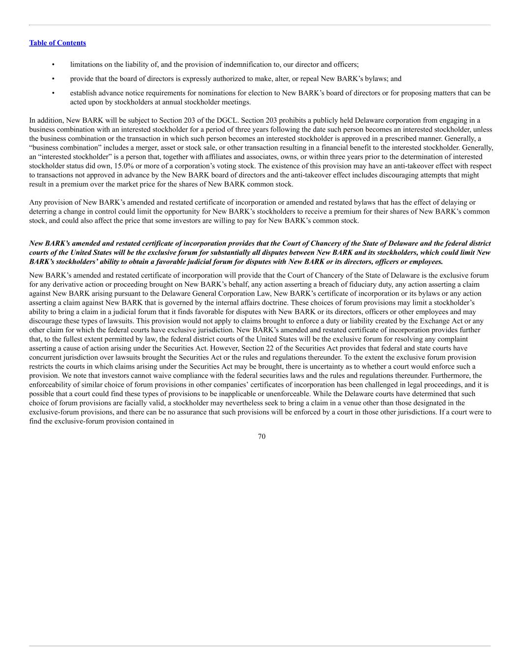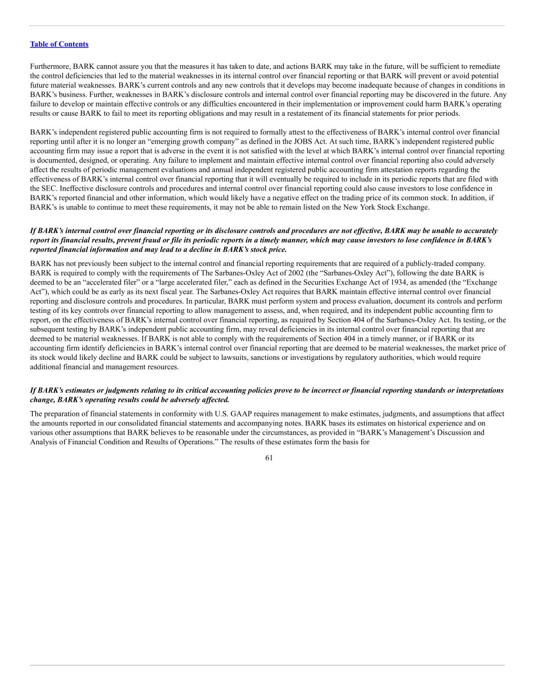 Table of Contents Furthermore, BARK cannot assure you that the measures it has taken to date, and actions BARK may take in the future, will be sufficient to remediate the control deficiencies that led to the material weaknesses in its internal control over financial reporting or that BARK will prevent or avoid potential future material weaknesses. BARK’s current controls and any new controls that it develops may become inadequate because of changes in conditions in BARK’s business. Further, weaknesses in BARK’s disclosure controls and internal control over financial reporting may be discovered in the future. Any failure to develop or maintain effective controls or any difficulties encountered in their implementation or improvement could harm BARK’s operating results or cause BARK to fail to meet its reporting obligations and may result in a restatement of its financial statements for prior periods. BARK’s independent registered public accounting firm is not required to formally attest to the effectiveness of BARK’s internal control over financial reporting until after it is no longer an “emerging growth company” as defined in the JOBS Act. At such time, BARK’s independent registered public accounting firm may issue a report that is adverse in the event it is not satisfied with the level at which BARK’s internal control over financial reporting is documented, designed, or operating. Any failure to implement and maintain effective internal control over financial reporting also could adversely affect the results of periodic management evaluations and annual independent registered public accounting firm attestation reports regarding the effectiveness of BARK’s internal control over financial reporting that it will eventually be required to include in its periodic reports that are filed with the SEC. Ineffective disclosure controls and procedures and internal control over financial reporting could also cause investors to lose confidence in BARK’s reported financial and other information, which would likely have a negative effect on the trading price of its common stock. In addition, if BARK’s is unable to continue to meet these requirements, it may not be able to remain listed on the New York Stock Exchange. If BARK’s internal control over financial reporting or its disclosure controls and procedures are not effective, BARK may be unable to accurately report its financial results, prevent fraud or file its periodic reports in a timely manner, which may cause investors to lose confidence in BARK’s reported financial information and may lead to a decline in BARK’s stock price. BARK has not previously been subject to the internal control and financial reporting requirements that are required of a publicly-traded company. BARK is required to comply with the requirements of The Sarbanes-Oxley Act of 2002 (the “Sarbanes-Oxley Act”), following the date BARK is deemed to be an “accelerated filer” or a “large accelerated filer,” each as defined in the Securities Exchange Act of 1934, as amended (the “Exchange Act”), which could be as early as its next fiscal year. The Sarbanes-Oxley Act requires that BARK maintain effective internal control over financial reporting and disclosure controls and procedures. In particular, BARK must perform system and process evaluation, document its controls and perform testing of its key controls over financial reporting to allow management to assess, and, when required, and its independent public accounting firm to report, on the effectiveness of BARK’s internal control over financial reporting, as required by Section 404 of the Sarbanes-Oxley Act. Its testing, or the subsequent testing by BARK’s independent public accounting firm, may reveal deficiencies in its internal control over financial reporting that are deemed to be material weaknesses. If BARK is not able to comply with the requirements of Section 404 in a timely manner, or if BARK or its accounting firm identify deficiencies in BARK’s internal control over financial reporting that are deemed to be material weaknesses, the market price of its stock would likely decline and BARK could be subject to lawsuits, sanctions or investigations by regulatory authorities, which would require additional financial and management resources. If BARK’s estimates or judgments relating to its critical accounting policies prove to be incorrect or financial reporting standards or interpretations change, BARK’s operating results could be adversely affected. The preparation of financial statements in conformity with U.S. GAAP requires management to make estimates, judgments, and assumptions that affect the amounts reported in our consolidated financial statements and accompanying notes. BARK bases its estimates on historical experience and on various other assumptions that BARK believes to be reasonable under the circumstances, as provided in “BARK’s Management’s Discussion and Analysis of Financial Condition and Results of Operations.” The results of these estimates form the basis for   61
