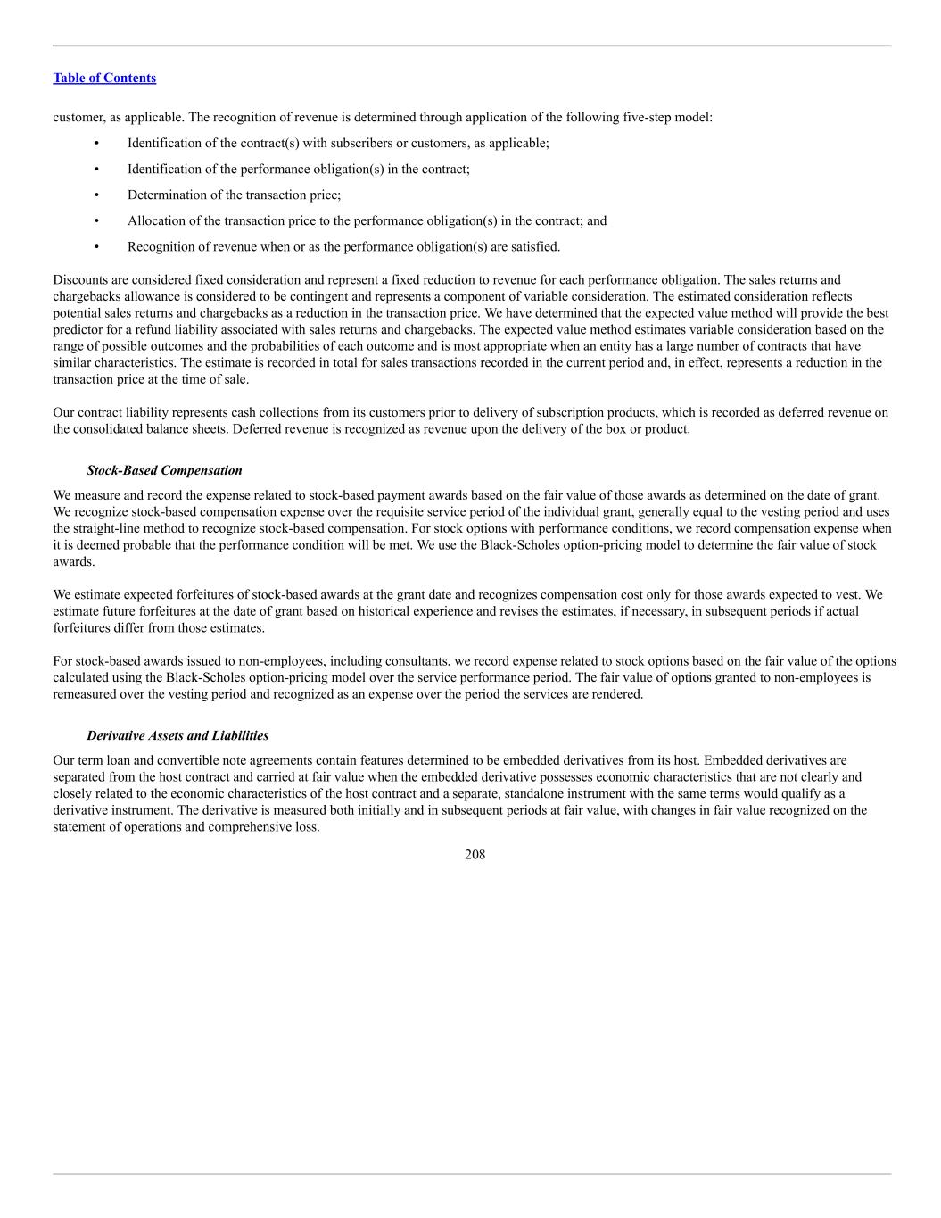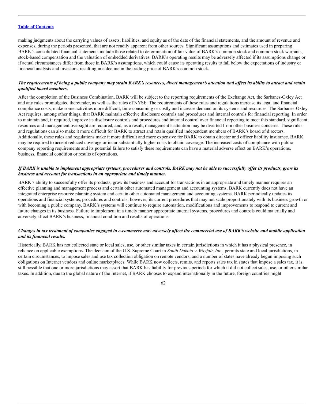 Table of Contents making judgments about the carrying values of assets, liabilities, and equity as of the date of the financial statements, and the amount of revenue and expenses, during the periods presented, that are not readily apparent from other sources. Significant assumptions and estimates used in preparing BARK’s consolidated financial statements include those related to determination of fair value of BARK’s common stock and common stock warrants, stock-based compensation and the valuation of embedded derivatives. BARK’s operating results may be adversely affected if its assumptions change or if actual circumstances differ from those in BARK’s assumptions, which could cause its operating results to fall below the expectations of industry or financial analysts and investors, resulting in a decline in the trading price of BARK’s common stock. The requirements of being a public company may strain BARK’s resources, divert management’s attention and affect its ability to attract and retain qualified board members. After the completion of the Business Combination, BARK will be subject to the reporting requirements of the Exchange Act, the Sarbanes-Oxley Act and any rules promulgated thereunder, as well as the rules of NYSE. The requirements of these rules and regulations increase its legal and financial compliance costs, make some activities more difficult, time-consuming or costly and increase demand on its systems and resources. The Sarbanes-Oxley Act requires, among other things, that BARK maintain effective disclosure controls and procedures and internal controls for financial reporting. In order to maintain and, if required, improve its disclosure controls and procedures and internal control over financial reporting to meet this standard, significant resources and management oversight are required, and, as a result, management’s attention may be diverted from other business concerns. These rules and regulations can also make it more difficult for BARK to attract and retain qualified independent members of BARK’s board of directors. Additionally, these rules and regulations make it more difficult and more expensive for BARK to obtain director and officer liability insurance. BARK may be required to accept reduced coverage or incur substantially higher costs to obtain coverage. The increased costs of compliance with public company reporting requirements and its potential failure to satisfy these requirements can have a material adverse effect on BARK’s operations, business, financial condition or results of operations. If BARK is unable to implement appropriate systems, procedures and controls, BARK may not be able to successfully offer its products, grow its business and account for transactions in an appropriate and timely manner. BARK’s ability to successfully offer its products, grow its business and account for transactions in an appropriate and timely manner requires an effective planning and management process and certain other automated management and accounting systems. BARK currently does not have an integrated enterprise resource planning system and certain other automated management and accounting systems. BARK periodically updates its operations and financial systems, procedures and controls; however; its current procedures that may not scale proportionately with its business growth or with becoming a public company. BARK’s systems will continue to require automation, modifications and improvements to respond to current and future changes in its business. Failure to implement in a timely manner appropriate internal systems, procedures and controls could materially and adversely affect BARK’s business, financial condition and results of operations. Changes in tax treatment of companies engaged in e-commerce may adversely affect the commercial use of BARK’s website and mobile application and its financial results. Historically, BARK has not collected state or local sales, use, or other similar taxes in certain jurisdictions in which it has a physical presence, in reliance on applicable exemptions. The decision of the U.S. Supreme Court in South Dakota v. Wayfair, Inc., permits state and local jurisdictions, in certain circumstances, to impose sales and use tax collection obligation on remote vendors, and a number of states have already begun imposing such obligations on Internet vendors and online marketplaces. While BARK now collects, remits, and reports sales tax in states that impose a sales tax, it is still possible that one or more jurisdictions may assert that BARK has liability for previous periods for which it did not collect sales, use, or other similar taxes. In addition, due to the global nature of the Internet, if BARK chooses to expand internationally in the future, foreign countries might   62
