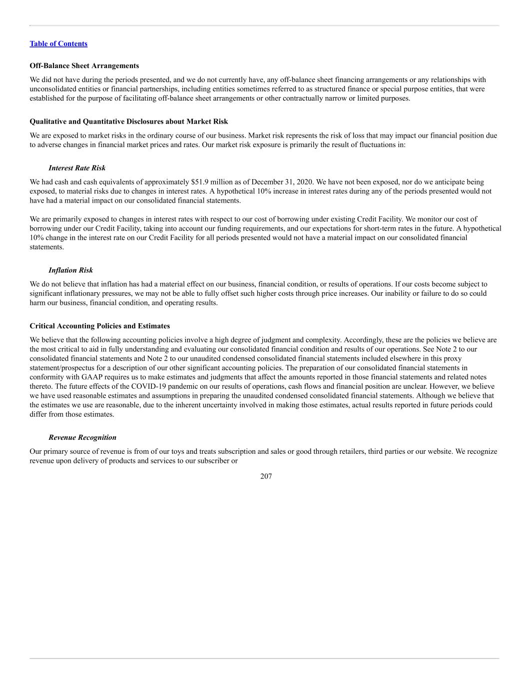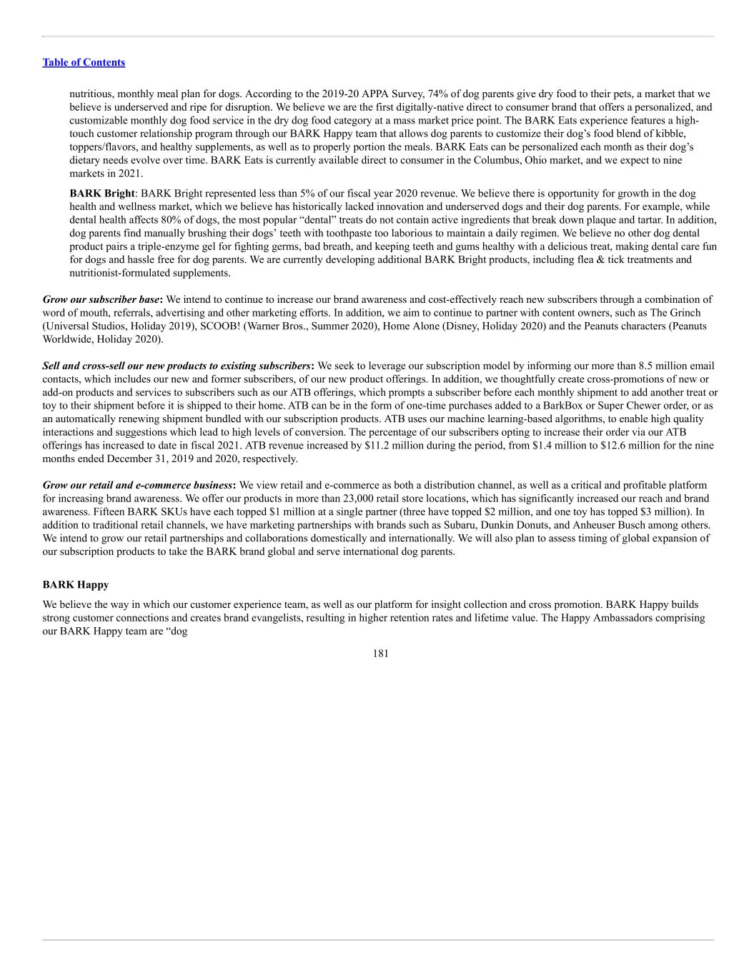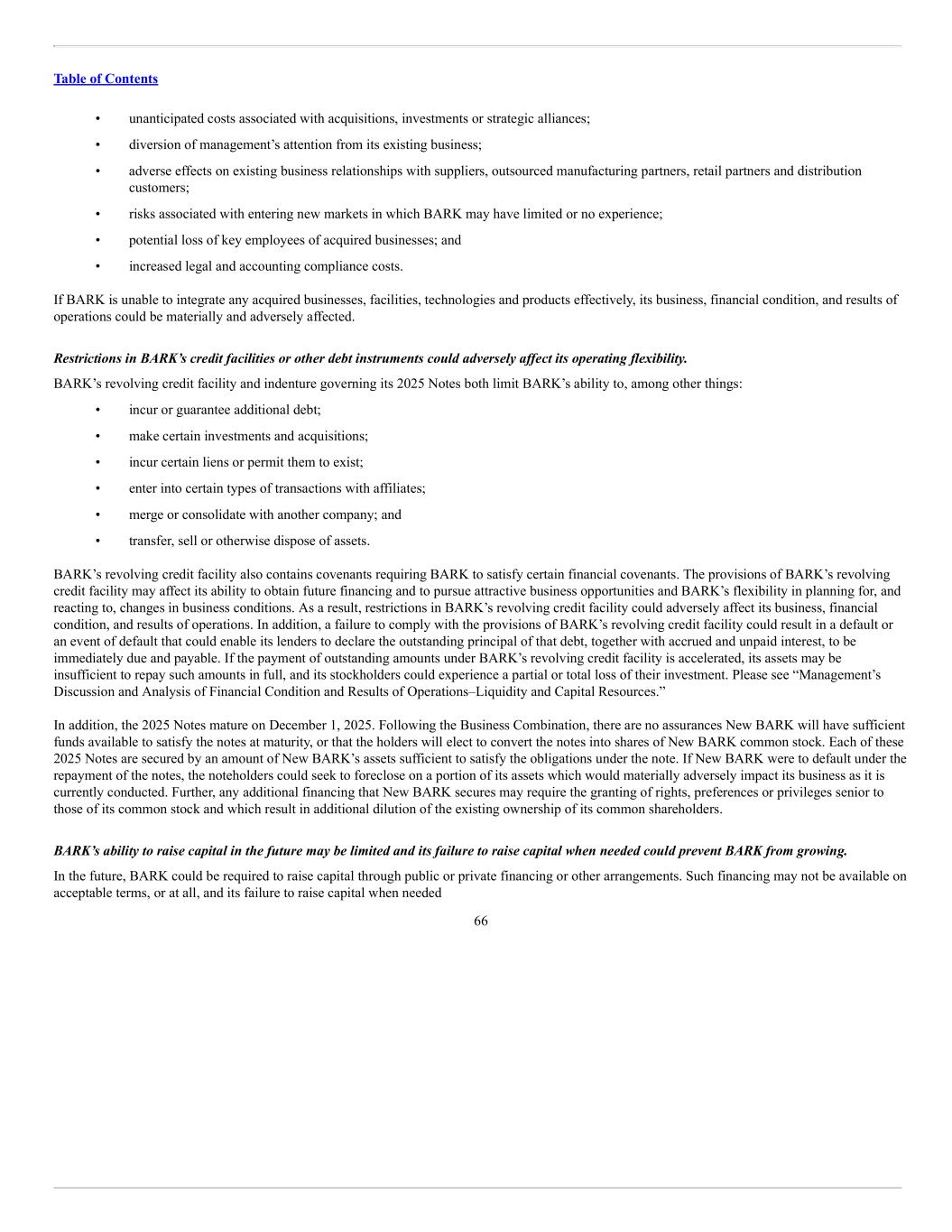 Table of Contents RISK FACTORS Stockholders should carefully consider the following risk factors, together with all of the other information included elsewhere in this proxy statement/prospectus, before they decide whether to vote or instruct their vote to be cast to approve the proposals described in this proxy statement/prospectus. Risks Related to New BARK’s Business Following the Business Combination The value of your investment in New BARK following consummation of the Business Combination will be subject to the significant risks affecting BARK and inherent to the industry in which it operates. You should carefully consider the risks and uncertainties described below and other information included elsewhere in this proxy statement/prospectus. If any of the events described below occur, the post-acquisition business and financial results could be adversely affected in a material way. This could cause the trading price of its common stock to decline, perhaps significantly, and you therefore may lose all or part of your investment. Unless the context otherwise requires, all references in this section to the “Company,” “we,” “us” or “our” refer to the business of BARK prior to the consummation of the Business Combination, which will be the business of New BARK following the consummation of the Business Combination. Accordingly, the risks described below relating to BARK could also materially and adversely affect the combined company after the consummation of the Business Combination. BARK relies significantly on revenue from subscribers purchasing subscription-based products, such as BarkBox and Super Chewer, and may not be successful in expanding its subscription-based offerings. To date the vast majority of BARK’s revenue has been derived from subscribers who purchase subscription-based offerings. In BARK’s subscription arrangements, subscribers select a duration over which they wish to receive product shipments. BARK significantly relies, and expects to continue to significantly rely, on these subscribers for a substantial majority of BARK’s revenue. The introduction of competitors’ offerings with lower prices for consumers, fluctuations in prices, a lack of subscriber satisfaction with BARK’s monthly themes or products, changes in consumer purchasing habits, including an increase in the use of competitors’ products or offerings and other factors could result in declines in BARK’s subscriptions and in BARK’s revenue, which would have an adverse effect on its business, financial condition and results of operations. Because BARK derives a vast majority of its revenue from subscribers who purchase these subscription-based products, any material decline in demand for these offerings could have an adverse impact on BARK’s future revenue and results of operations. In addition, if BARK is unable to successfully introduce new subscription-based offerings, such as its BARK Eats personalized food blend subscription, which it expects to launch in nine Midwest markets in fiscal 2022, BARK’s revenue growth may decline, which could have a material adverse effect on BARK’s business, financial condition, and results of operations. BARK has a short operating history at its current scale in a rapidly evolving industry and, as a result, its past results may not be indicative of future operating performance. BARK has a short history operating at its current scale in a rapidly evolving industry that may not develop in a manner favorable to BARK’s business. This relatively short operating history makes it difficult to assess BARK’s future performance with certainty. You should consider BARK’s business and prospects in light of the risks and difficulties BARK may encounter. BARK’s future success will depend in large part upon its ability to, among other things:     •   cost-effectively acquire new subscribers and customers and engage with and retain existing subscribers and customers;     •   withstand the impacts of the COVID-19 pandemic;     •   increase its market share;     39