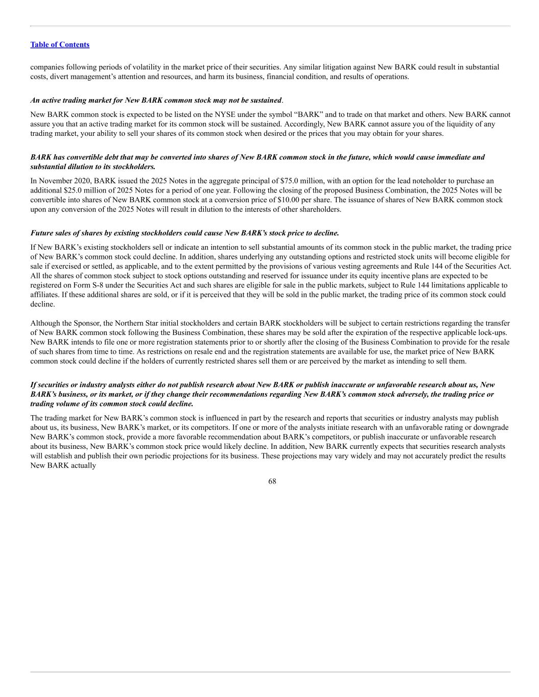 Table of Contents   •   the ability to comply with the anti-corruption laws of the United States and various international jurisdictions;     •   potential impairment charges related to identified intangible assets and fixed assets;     •   the effects of economic downturns and other macroeconomic conditions or trends on BARK’s business and consumer spending;     •   the effects of the COVID-19 pandemic on BARK’s business and the actions BARK may take in response thereto;     •   potential litigation, product liability claims, regulatory proceedings and/or adverse publicity involving New BARK or BARK;     •   expectations regarding BARK’s ability to obtain and maintain intellectual property protection and not infringe on the rights of others;     •   costs related to the Business Combination;     •   in accordance with recent statements from the SEC on accounting treatment of the warrants, Northern Star management determined that its outstanding warrants should be accounted for as liabilities rather than as equity and such requirement resulted in a restatement of Northern Star’s previously issued financial statements, which has resulted in unanticipated costs and diversion of management resources and has subjected us to additional risks and uncertainties, including an increased possibility of legal proceedings and a potential loss of investor confidence;     •   expectations regarding the time during which New BARK will be an “emerging growth company” under the JOBS Act; and     •   other risks and uncertainties indicated in this proxy statement/prospectus, including those set forth under the section entitled “Risk Factors.”   31
