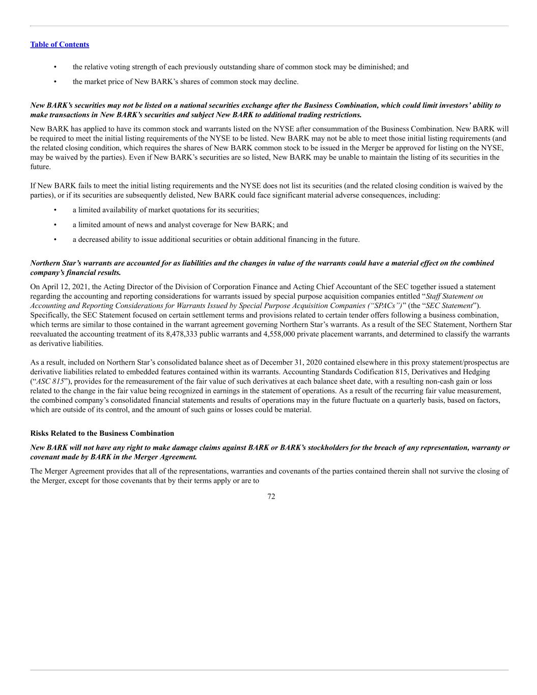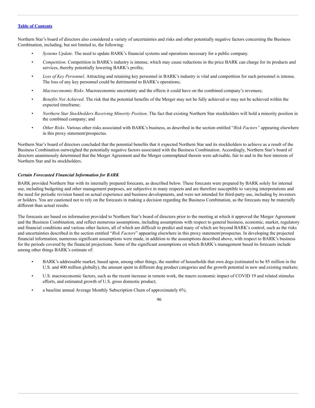 Table of Contents Regulatory Matters The Merger is not subject to any additional federal or state regulatory requirement or approval, except for the filings with the State of Delaware necessary to effectuate the Merger and the filing of required notifications and the expiration or termination of the required waiting periods under the HSR Act. On February 16, 2021, the parties filed with the Federal Trade Commission (the “FTC”) the notice required under the HSR Act and requested early termination of the waiting period under the HSR Act. On March 18, 2021, the waiting period under the HSR Act expired. Risk Factors and Risk Factor Summary In evaluating the proposals to be presented at the annual meeting, a stockholder should carefully read this proxy statement/prospectus and especially consider the factors discussed in the sections entitled “Forward-Looking Statements” and “Risk Factors.” Set forth below is only a summary of principal risks associated with BARK, Northern Star and New BARK.     •   the ability to complete the Merger or a delay in the closing of the Business Combination or the PIPE Transaction;     •   the occurrence of any event, change or other circumstances that could give rise to the termination of the Merger Agreement;     •   the ability to maintain the listing of New BARK’s securities on the New York Stock Exchange or an alternative national securities exchange following the Business Combination;     •   the potential liquidity and trading of New BARK’s public securities;     •   the inability to recognize the anticipated benefits of the proposed Business Combination, which may be affected by, among other things, the amount of cash available following any redemption of public shares by Northern Star stockholders;     •   BARK’s financial and business performance following the Business Combination, including financial projections and business metrics;     •   changes in BARK’s strategy, future operations, expansion plans and opportunities, financial position, estimated revenues and losses, projected costs, prospects and plans, capital requirements and sources and uses of cash;     •   the implementation, market acceptance and success of BARK’s business model and its ability to scale in a cost-effective manner;     •   BARK’s significant reliance on revenue from customers purchasing subscription-based products, such as BarkBox and Super Chewer, and its ability to successfully expand its offerings;     •   BARK’s short history operating at its current scale in a rapidly evolving industry;     •   the effectiveness and efficiency of BARK’s marketing and cross-selling efforts;     •   BARK’s ability to compete in the highly competitive dog products and services retail industry;     •   BARK’s ability to maintain and grow its strong brand and reputation;     •   adverse changes in BARK’s shipping arrangements or any interruptions in shipping;     •   the ability to maintain effective controls over disclosure and financial reporting that enable BARK to comply with regulations and produce accurate financial statements;     •   potential failure to comply with privacy and information security regulations;   30