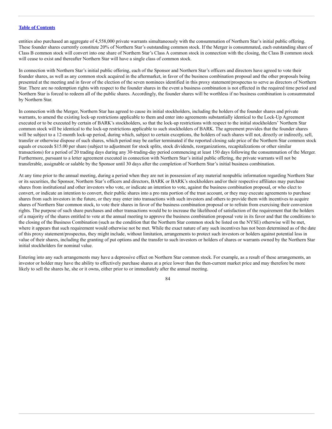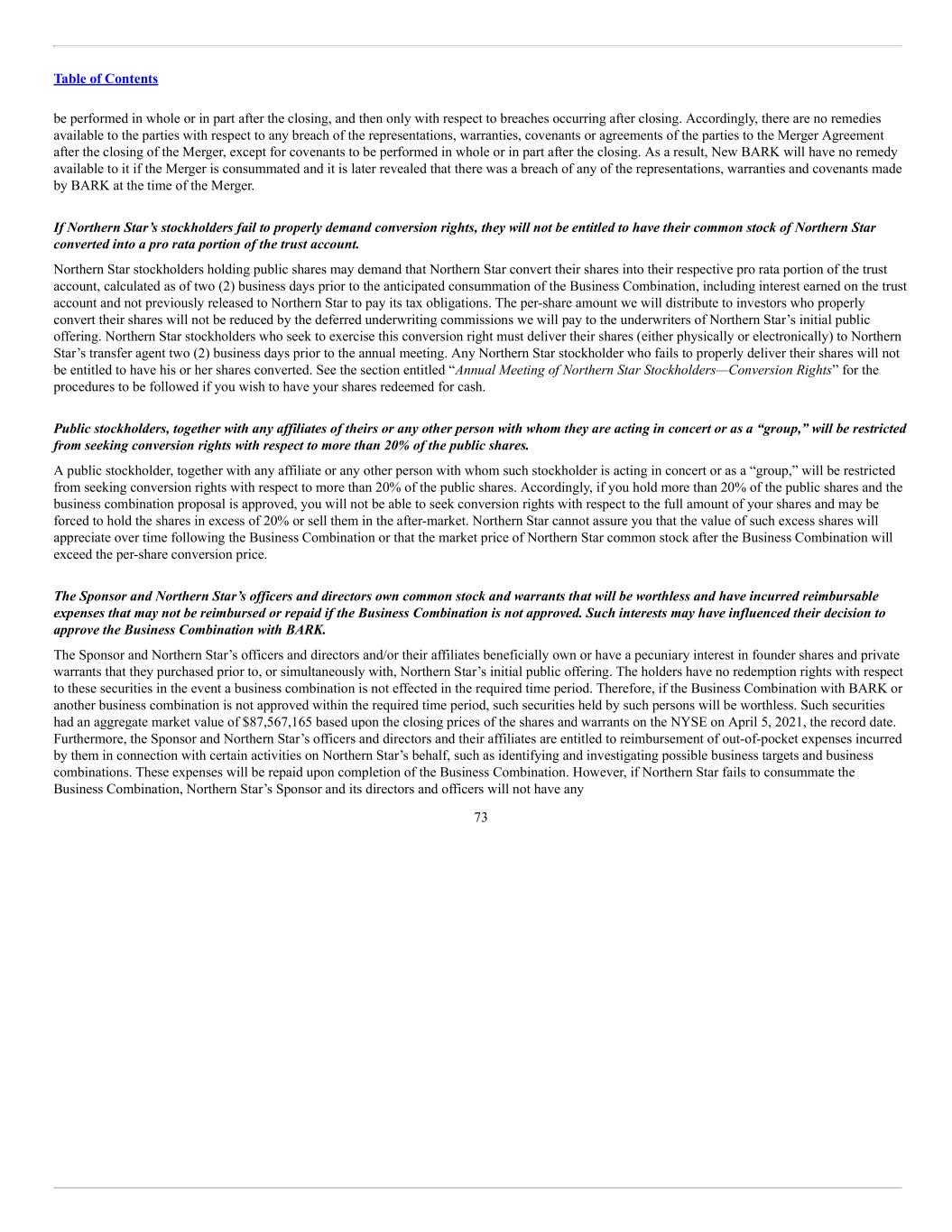 Table of Contents Holders of Northern Star warrants will not have conversion rights with respect to such securities. Appraisal Rights Neither stockholders of Northern Star nor holders of units or warrants of Northern Star have appraisal rights in connection with the Merger under Delaware law. Proxy Solicitation Proxies may be solicited by mail, telephone or in person. Northern Star has engaged D.F. King & Co., Inc. to assist in the solicitation of proxies. If a stockholder of record grants a proxy, it may still change its vote by sending a later-dated, signed proxy card to Northern Star’s transfer agent so that it is received prior to the vote at the annual meeting, or by submitting a ballot through the meeting web portal during the annual meeting webcast. A stockholder of record also may revoke its proxy by sending a notice of revocation to Northern Star’s transfer agent, which must be received prior to the vote at the annual meeting. If you hold your shares in “street name,” you should contact your broker, bank or nominee to change your instructions on how to vote. See the section entitled “Annual Meeting of Northern Star Stockholders—Revoking Your Proxy.” Interests of the Sponsor and Northern Star’s Directors and Officers in the Business Combination When you consider the recommendation of Northern Star’s board of directors in favor of approval of the business combination proposal and the other proposals, you should keep in mind that the Sponsor (which is affiliated with certain of Northern Star’s officers and directors) and Northern Star’s directors and officers have interests in such proposal that may be different from, or in addition to, your interests as a stockholder or warrantholder. These interests include, among other things:     •   If the Business Combination with BARK or another business combination is not consummated by November 13, 2022 (or such later date as may be approved by Northern Star’s stockholders), Northern Star will cease all operations except for the purpose of winding up, redeeming 100% of the outstanding public shares for cash and, subject to the approval of its remaining stockholders and its board of directors, dissolving and liquidating. In such event, the 6,358,750 founder shares held by the Sponsor and Northern Star’s directors and officers, which were acquired for an aggregate purchase price of $25,000 prior to Northern Star’s initial public offering, would be worthless because the holders are not entitled to participate in any redemption or distribution with respect to such shares. On the other hand, if the Merger is consummated, each outstanding founder share will convert into one share of Northern Star common stock at the closing. Such shares had an aggregate market value of $72,616,925 based upon the closing price of $11.42 per share on the NYSE on April 5, 2021.     •   The Sponsor, which is affiliated with certain of Northern Star’s directors and officers, purchased an aggregate of 4,558,000 private warrants from Northern Star for an aggregate purchase price of approximately $6.837 million (or $1.50 per warrant). These purchases took place on a private placement basis simultaneously with the consummation of Northern Star’s initial public offering. All of the proceeds Northern Star received from these purchases were placed in the trust account. Such warrants had an aggregate market value of $14,950,240 based upon the closing price of $3.28 per warrant on the NYSE on April 5, 2021. The private warrants will become worthless if Northern Star does not consummate a business combination by November 13, 2022 (or such later date as may be approved by Northern Star stockholders in an amendment to its amended and restated certificate of incorporation).     •   If Northern Star is unable to complete a business combination within the required time period, the Sponsor will be personally liable under certain circumstances described herein to ensure that the proceeds in the trust account are not reduced by the claims of target businesses or claims of vendors or   23