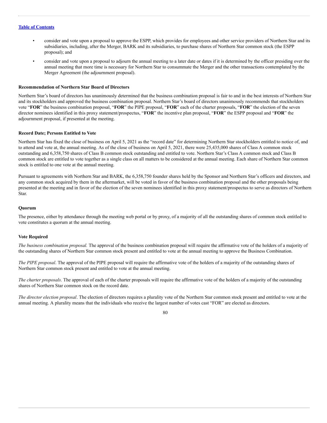 Table of Contents   (4) Proposal No. 7—The Director Election Proposal—to elect seven directors who, upon the closing of the Business Combination, will be the directors of New BARK—we refer to this proposal as the “director election proposal”;     (5) Proposal No. 8—The Incentive Plan Proposal—to consider and vote upon a proposal to approve the 2021 Equity Incentive Plan (the “2021 Plan”), which is an incentive compensation plan for employees and other service providers of Northern Star and its subsidiaries, including, after the Merger, BARK and its subsidiaries—we refer to this proposal as the “incentive plan proposal”;     (6) Proposal No. 9—The ESPP Proposal—to consider and vote upon a proposal to approve the 2021 Employee Stock Purchase Plan (the “ESPP”), which provides for employees and other service providers of Northern Star and its subsidiaries, including, after the Merger, BARK and its subsidiaries, to purchase shares of Northern Star common stock—we refer to this proposal as the “ESPP proposal”; and     (7) Proposal No. 10—The Adjournment Proposal—to consider and vote upon a proposal to adjourn the annual meeting to a later date or dates if it is determined by the officer presiding over the annual meeting that more time is necessary for Northern Star to consummate the Merger and the other transactions contemplated by the Merger Agreement—we refer to this proposal as the “adjournment proposal.” We also will transact any other business as may properly come before the annual meeting or any adjournment or postponement thereof. The items of business listed above are more fully described elsewhere in the proxy statement/prospectus. Whether or not you intend to attend the annual meeting, we urge you to read the attached proxy statement/prospectus in its entirety, including the annexes and accompanying financial statements, before voting. IN PARTICULAR, WE URGE YOU TO CAREFULLY READ THE SECTION IN THE PROXY STATEMENT/PROSPECTUS ENTITLED “RISK FACTORS.” Only holders of record of Northern Star’s Class A and Class B common stock (collectively, “Northern Star common stock”) at the close of business on April 5, 2021 (the “record date”) are entitled to notice of the annual meeting and to vote and have their votes counted at the annual meeting and any adjournments or postponements of the annual meeting. After careful consideration, Northern Star’s board of directors has determined that each of the business combination proposal, the PIPE proposal, the charter proposals, the election of the seven nominees identified in this proxy statement/prospectus to serve as directors, the incentive plan proposal, the ESPP proposal, and the adjournment proposal is fair to and in the best interests of Northern Star and its stockholders and unanimously recommends that you vote or give instruction to vote “FOR” the business combination proposal, “FOR” the PIPE proposal, “FOR” each of the charter proposals, “FOR” the election of the seven director nominees identified in this proxy statement/prospectus, “FOR” the incentive plan proposal, “FOR” the ESPP proposal and “FOR” the adjournment proposal, if presented. When you consider the recommendations of Northern Star’s board of directors, you should keep in mind that Northern Star’s directors and officers may have interests in the Business Combination that conflict with, or are different from, your interests as a stockholder of Northern Star. See the section entitled “The Business Combination Proposal—Interests of the Sponsor and Northern Star’s Directors and Officers in the Business Combination.” The closing of the Business Combination is conditioned on approval of the business combination proposal, the PIPE proposal, the charter proposals, the incentive plan proposal and the ESPP proposal and on the election of the seven nominees identified in this proxy statement/prospectus to serve as directors of Northern Star. If any of the proposals is not approved or the seven nominees identified in this proxy statement/prospectus to serve as directors of Northern Star after the closing of the Business Combination are not elected, and the applicable closing condition in the Merger Agreement is not waived, the remaining proposals will not be presented to stockholders for a vote. All Northern Star stockholders are cordially invited to attend and participate in the annual meeting by accessing the meeting web portal located at http://www.virtualshareholdermeeting.com/STIC2021. To ensure your representation at the annual meeting, however, you are urged to complete, sign, date and return the enclosed