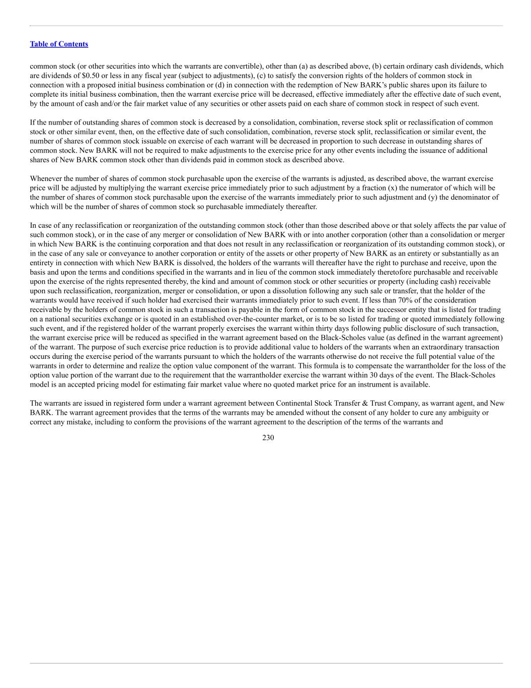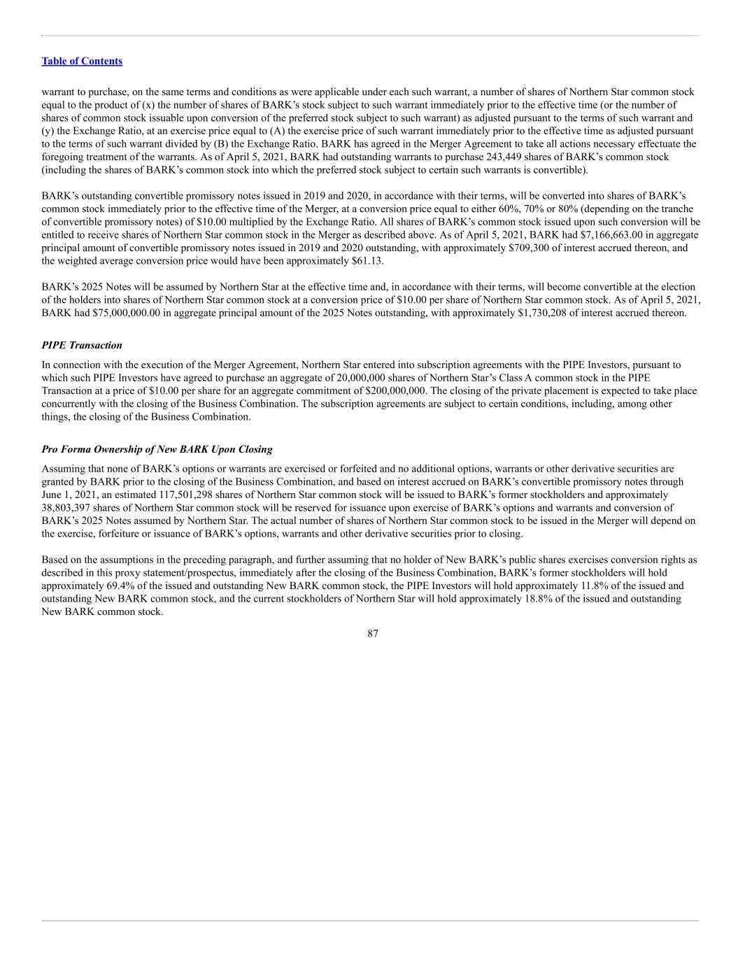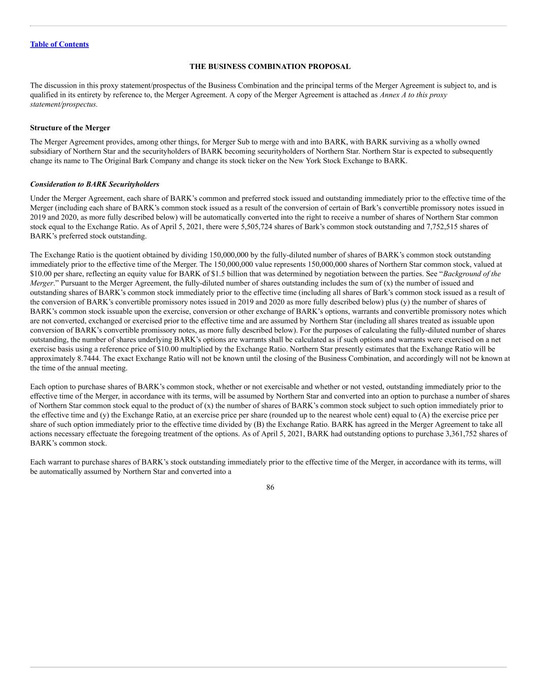 Table of Contents wholly owned subsidiary of Northern Star and the securityholders of BARK becoming securityholders of Northern Star, and the issuance of shares of Northern Star common stock to BARK’s stockholders in the Merger. After consideration of the factors identified and discussed in the section entitled “The Business Combination Proposal—Northern Star’s Board of Directors’ Reasons for Approval of the Business Combination,” Northern Star’s board of directors concluded that the Merger met all of the requirements disclosed in the prospectus for Northern Star’s initial public offering, including that BARK has a fair market value equal to at least 80% of the balance of the funds in the trust account (net of amounts previously disbursed to management for tax obligations and working capital purposes and excluding the amount of deferred underwriting discounts held in trust) at the time of the execution of the Merger Agreement. A copy of the Merger Agreement is attached to this proxy statement/prospectus as Annex A. You are encouraged to read the Merger Agreement in its entirety. See the section entitled “The Business Combination Proposal—Structure of the Merger” for more information. Consideration to BARK Securityholders Under the Merger Agreement, each share of BARK’s common and preferred stock issued and outstanding immediately prior to the effective time of the Merger (including each share of BARK’s common stock issued as a result of the conversion of certain of BARK’s convertible promissory notes, as more fully described in this proxy statement/prospectus) will be automatically converted into the right to receive a number of shares of Northern Star common stock equal to the Exchange Ratio. The Exchange Ratio is the quotient obtained by dividing 150,000,000 by the fully-diluted number of shares of BARK’s common stock outstanding immediately prior to the effective time of the Merger (as determined in accordance with the Merger Agreement and more fully described in this proxy statement/prospectus). Northern Star presently estimates that the Exchange Ratio will be approximately 8.7444. The exact Exchange Ratio will not be known until the closing of the Business Combination, and accordingly will not be known at the time of the annual meeting. Each of the options to purchase BARK’s common stock, whether or not exercisable and whether or not vested, and each of the warrants to purchase BARK’s common and preferred stock, in each case that is outstanding immediately prior to the effective time of the Merger, will be assumed by Northern Star and converted into an option or warrant, as the case may be, to purchase a number of shares of Northern Star common stock equal to the number of shares of BARK’s common stock subject to such option or warrant immediately prior to the effective time (or the number of shares of common stock issuable upon conversion of the preferred stock subject to such warrant) multiplied by the Exchange Ratio, at an exercise price equal to the exercise price immediately prior to the effective time divided by the Exchange Ratio. BARK has agreed in the Merger Agreement to take all actions necessary to effectuate the foregoing treatment of the options and warrants. BARK’s outstanding convertible promissory notes issued in 2019 and 2020 will be converted into shares of BARK’s common stock immediately prior to the effective time of the Merger. All shares of BARK’s common stock issued upon such conversion will be entitled to receive shares of Northern Star common stock in the Merger as described above. BARK’s 2025 Notes will be assumed by Northern Star at the effective time and will become convertible at the election of the holder into shares of Northern Star common stock. See the section entitled “The Business Combination Proposal—Structure of the Merger.” PIPE Transaction In connection with the execution of the Merger Agreement, Northern Star entered into subscription agreements with the PIPE Investors pursuant to which such PIPE Investors have agreed to purchase an aggregate of   17