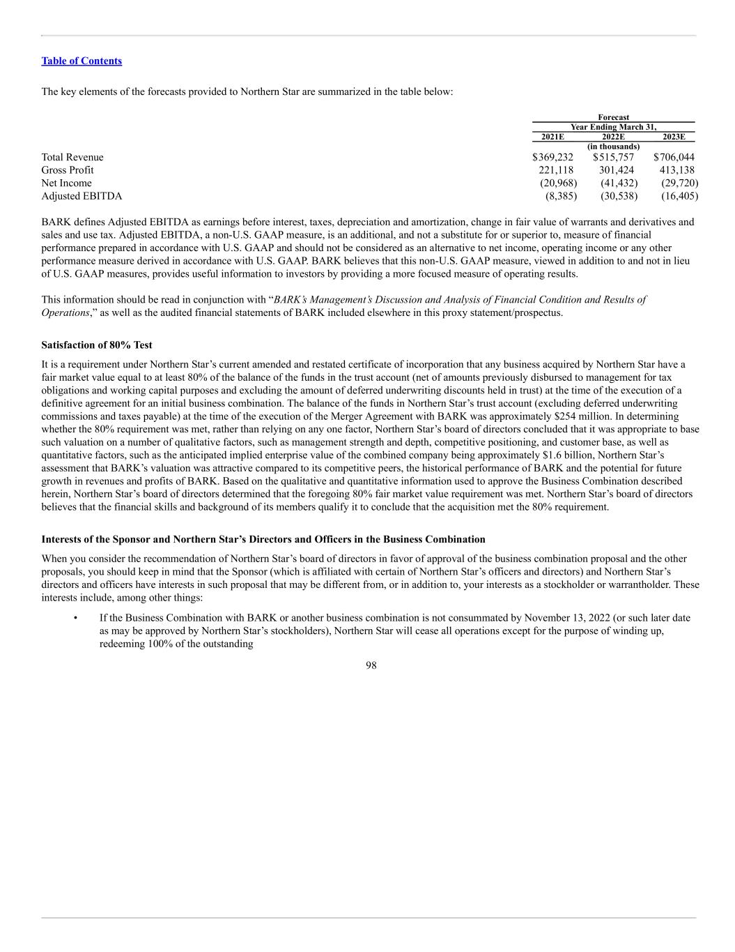 Table of Contents SELECTED UNAUDITED PRO FORMA CONDENSED COMBINED FINANCIAL INFORMATION The following selected unaudited pro forma condensed combined financial data is derived from the unaudited pro forma condensed combined balance sheet and unaudited pro forma condensed combined statements of operations included elsewhere in this proxy statement/prospectus. The unaudited pro forma condensed combined financial statements are based on Northern Star’s historical restated financial statements and BARK’s historical consolidated financial statements as adjusted to give effect to the Business Combination and the PIPE Transaction. The restatement of Northern Star’s financial statements is more fully described in Note 2 of the notes to Northern Star’s financial statements included herein. The unaudited pro forma condensed combined balance sheet gives pro forma effect to the Business Combination, treated as a reverse recapitalization for accounting purposes, and the PIPE Transaction as if they had been consummated on December 31, 2020. The unaudited pro forma condensed combined statements of operations for the nine months ended December 31, 2020 and for the year ended March 31, 2020, give effect to the Business Combination and the PIPE Transaction as if they had occurred on April 1, 2019, the beginning of the earliest period presented. The unaudited pro forma condensed combined statements of operations for the year ended March 31, 2020 do not include Northern Star’s historical financial statements since Northern Star was not in existence during such period. The unaudited pro forma condensed combined financial statements were prepared in accordance with Article 11 of SEC Regulation S-X, as amended by the final rule, Release No. 33-10786 “Amendments to Financial Disclosures about Acquired and Disposed Businesses.” Release No. 33-10786 replaces the existing pro forma adjustment criteria with simplified requirements to depict the accounting for the transaction (“Transaction Accounting Adjustments”) and present the reasonably estimable synergies and other transaction effects that have occurred or are reasonably expected to occur (“Management’s Adjustments”). Northern Star has elected not to present Management’s Adjustments and will only be presenting Transaction Accounting Adjustments in the unaudited pro forma condensed combined financial information. The adjustments presented in the unaudited pro forma condensed combined financial statements have been identified and presented to provide relevant information necessary for an understanding of the combined company upon consummation of the Business Combination and the PIPE Transaction. The unaudited pro forma condensed combined financial information is for illustrative purposes only. The financial results may have been different had the companies always been combined. You should not rely on the unaudited pro forma condensed combined financial information as being indicative of the historical results that would have been achieved had the companies always been combined or the future results that the combined company will experience. Northern Star and BARK have not had any historical relationship prior to the Business Combination. Accordingly, no pro forma adjustments were required to eliminate activities between the companies. This information should be read together with Northern Star and BARK’s historical financial statements and related notes, “Unaudited Pro Forma Condensed Combined Financial Information,” “Northern Star’s Management’s Discussion and Analysis of Financial Condition and Results of Operations”, “BARK’s Management’s Discussion and Analysis of Financial Condition and Results of Operations” and other financial statements of Northern Star and BARK included elsewhere in this proxy statement/prospectus. The selected unaudited pro forma condensed combined financial data below presents two redemption scenarios as follows:     •   Assuming No Redemptions: This presentation assumes that no Northern Star public stockholders exercise their right to have their Northern Star Public Shares converted into their pro rata share of the trust account; and   35