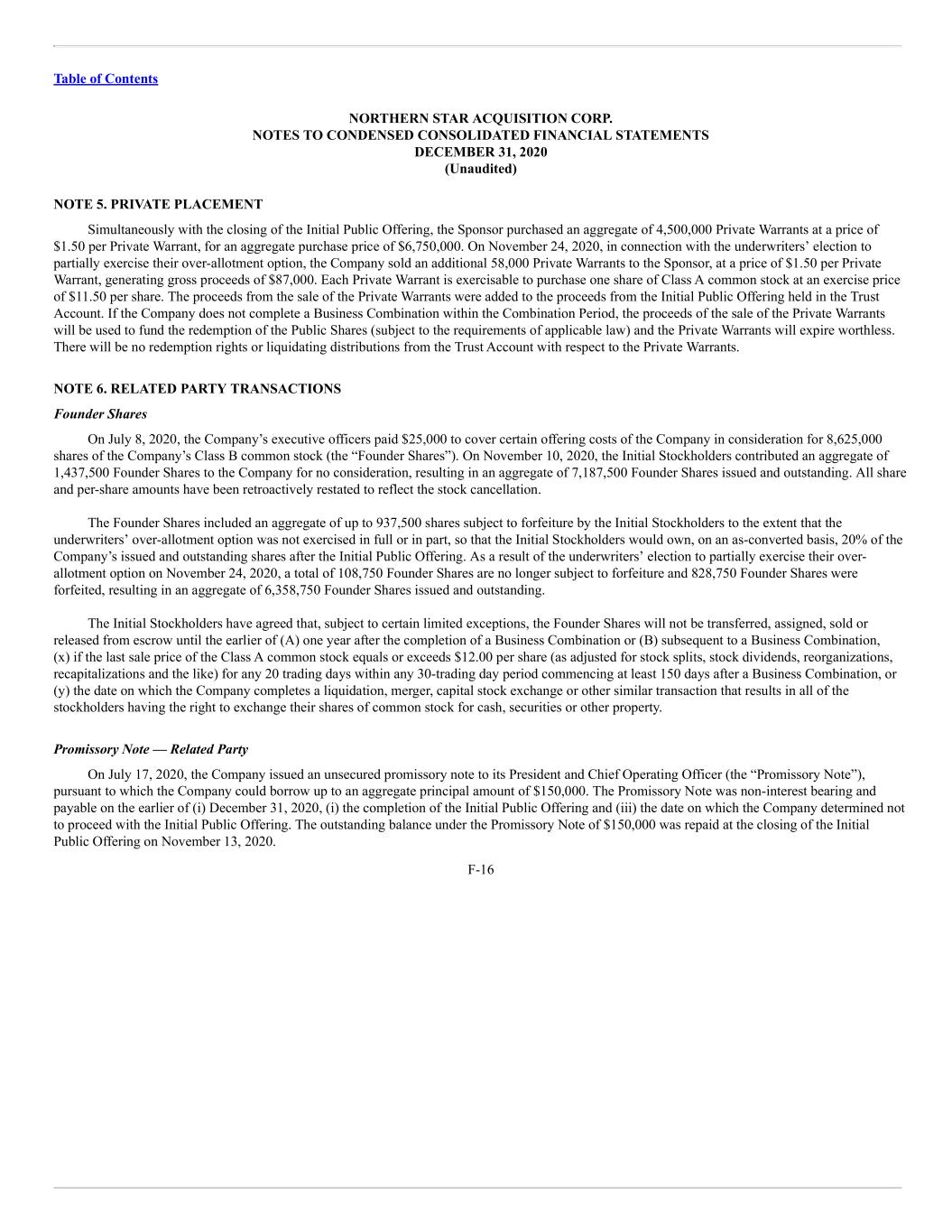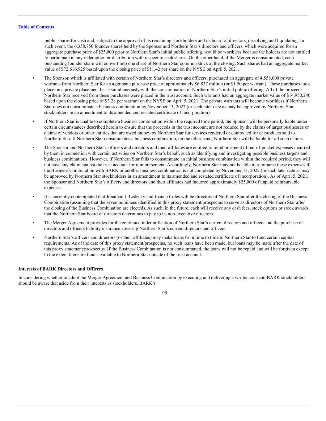 Table of Contents Q. What interests do the Sponsor and the current officers and directors of Northern Star have in the Business Combination?   A. In considering the recommendation of Northern Star’s board of directors to vote in favor of the Business Combination, stockholders should be aware that, aside from their interests as stockholders, our Sponsor and certain of our directors and officers have interests in the business combination that are different from, or in addition to, those of other stockholders generally. Our directors were aware of and considered these interests, among other matters, in evaluating the Business Combination, and in recommending to stockholders that they approve the Business Combination and in agreeing to vote their shares in favor of the Business Combination. Stockholders should take these interests into account in deciding whether to approve the Business Combination. These interests include, among other things, the fact that:     •   If the Business Combination with BARK or another business combination is not consummated by November 13, 2022 (or such later date as may be approved by Northern Star’s stockholders), Northern Star will cease all operations except for the purpose of winding up, redeeming 100% of the outstanding public shares for cash and, subject to the approval of its remaining stockholders and its board of directors, dissolving and liquidating. In such event, the 6,358,750 founder shares held by the Sponsor and Northern Star’s directors and officers, which were acquired for an aggregate purchase price of $25,000 prior to Northern Star’s initial public offering, would be worthless because the holders are not entitled to participate in any redemption or distribution with respect to such shares. On the other hand, if the Merger is consummated, each outstanding founder share will convert into one share of Northern Star common stock at the closing. Such shares had an aggregate market value of $72,616,925 based upon the closing price of $11.42 per share on the NYSE on April 5, 2021.     •   The Sponsor, which is affiliated with certain of Northern Star’s directors and officers, purchased an aggregate of 4,558,000 private warrants from Northern Star for an aggregate purchase price of approximately $6.837 million (or $1.50 per warrant). These purchases took place on a private placement basis simultaneously with the consummation of Northern Star’s initial public offering. All of the proceeds Northern Star received from these purchases were placed in the trust account. Such warrants had an aggregate market value of $14,950,240 based upon the closing price of $3.28 per warrant on the NYSE on April 5, 2021. The private warrants will become worthless if Northern Star does not consummate a business combination by November 13, 2022 (or such later date as may be approved by Northern Star stockholders in an amendment to its amended and restated certificate of incorporation).     •   If Northern Star is unable to complete a business combination within the required time period, the Sponsor will be personally liable under certain circumstances described herein to ensure that the proceeds in the trust account are not reduced by the claims of target businesses or claims of vendors or other entities that are owed money by Northern Star for services rendered or contracted for or products sold to Northern Star. If Northern Star consummates a business combination, on the other hand, Northern Star will be liable for all such claims.     •   The Sponsor and Northern Star’s officers and directors and their affiliates are entitled to reimbursement of out-of-pocket expenses incurred by them in connection with certain activities on Northern Star’s behalf, such as identifying and investigating possible business targets and business combinations. However, if Northern Star fails to consummate an initial business combination within the required period, they will not have any claim against the trust account for reimbursement. Accordingly, Northern Star may not be able to reimburse these expenses if the Business Combination with BARK or another business combination is not completed by November 13, 2022 (or such later date as may be approved by Northern Star stockholders in an amendment to its amended and restated certificate of incorporation). As of April 5, 2021, the Sponsor and Northern Star’s officers and directors and their affiliates had incurred approximately $25,000 of unpaid reimbursable expenses.     •   It is currently contemplated that Jonathan J. Ledecky and Joanna Coles will be directors of New BARK after the closing of the Business Combination (assuming that the seven nominees identified in this   10