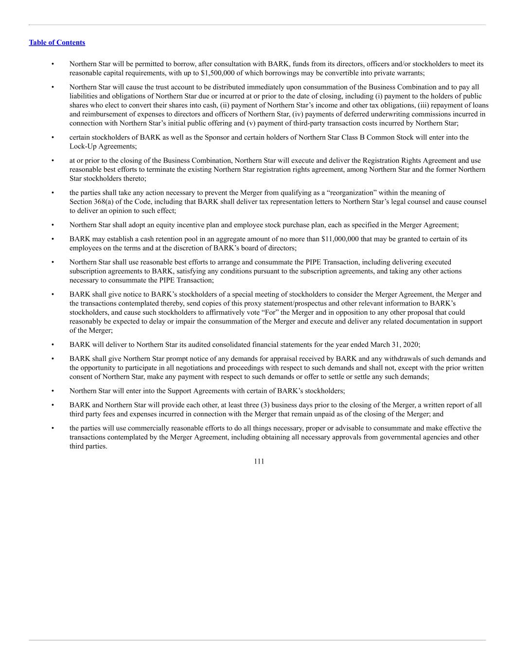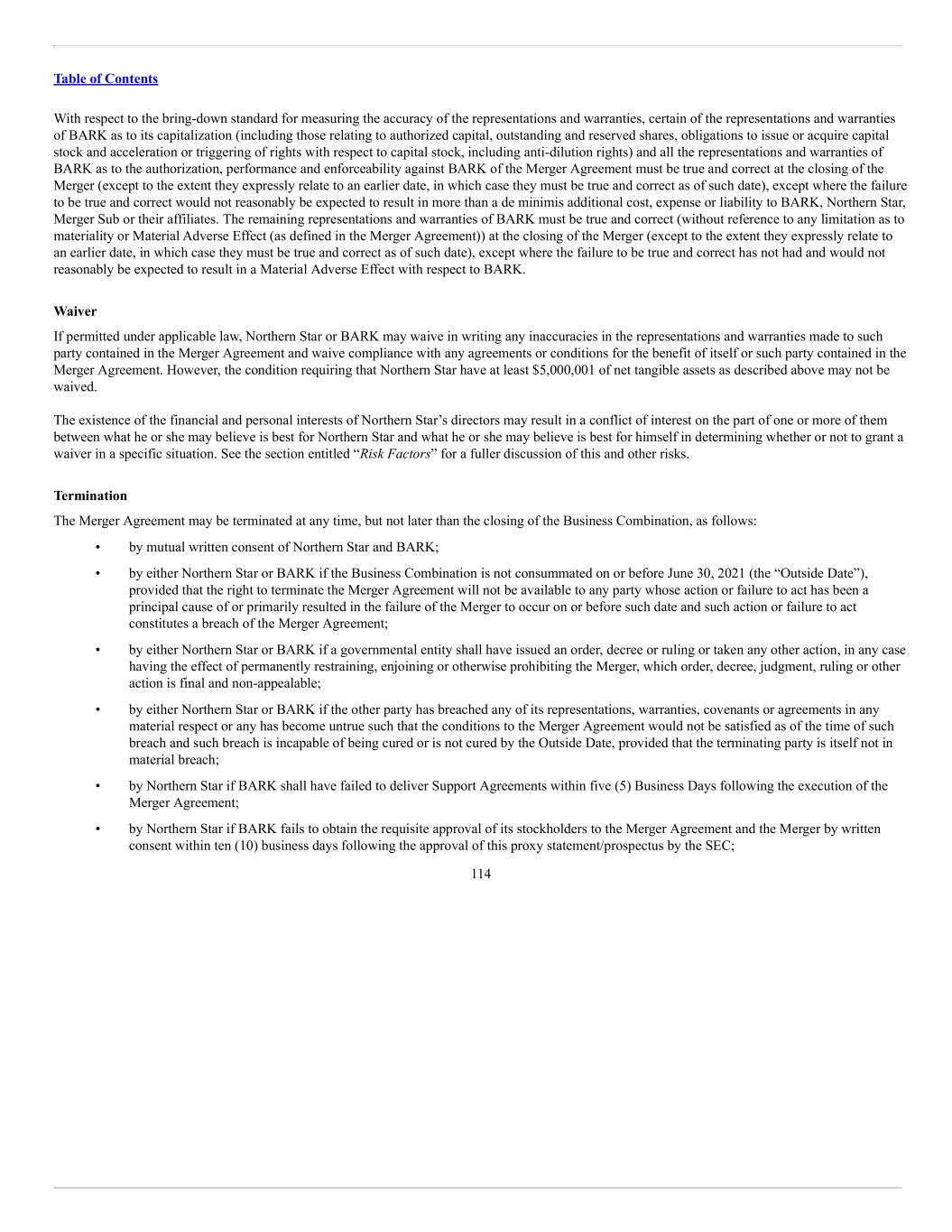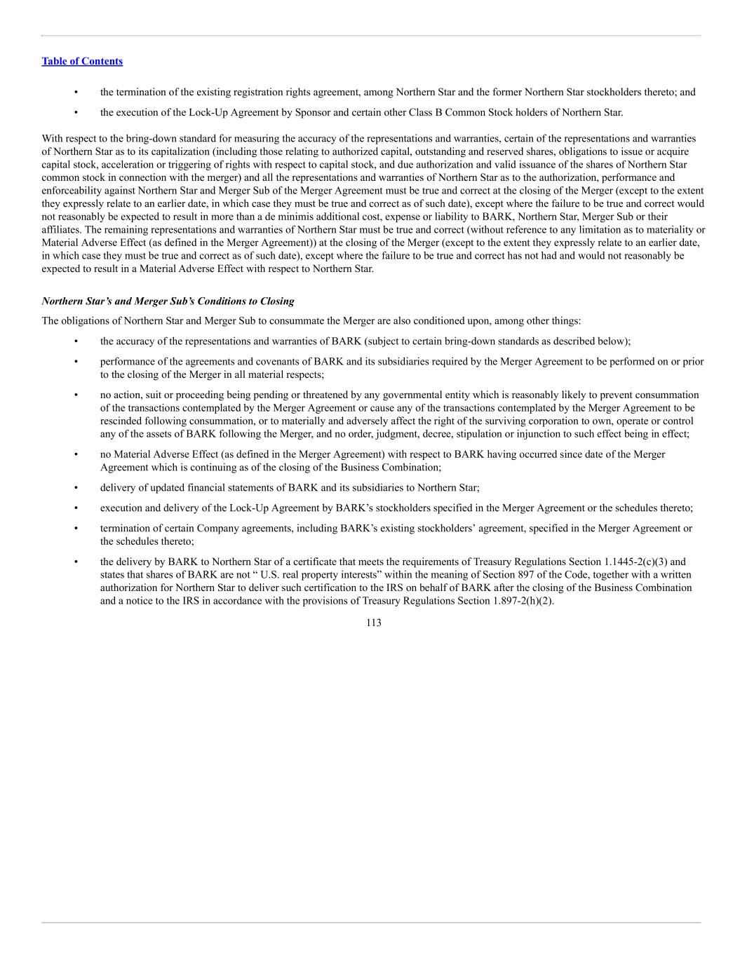 Table of Contents   •   Northern Star executing the Registration Rights Agreement;     •   the filing of Northern Star’s amended and restated certificate of incorporation with the Secretary of State of the State of Delaware and the adoption of the amended and restated bylaws;     •   the resignation of all persons employed by Northern Star, except for those specified in the Merger Agreement or the schedules thereto;     •   the termination of the existing registration rights agreement, among Northern Star and the former Northern Star stockholders thereto; and     •   the execution of the Lock-Up Agreement by Sponsor and certain other Class B Common stockholders of Northern Star. Northern Star’s and Merger Sub’s Conditions to Closing The obligations of Northern Star and Merger Sub to consummate the Merger are also conditioned upon, among other things:     •   the accuracy of the representations and warranties of BARK (subject to certain bring-down standards);     •   performance of the agreements and covenants of BARK and its subsidiaries required by the Merger Agreement to be performed on or prior to the closing of the Merger in all material respects;     •   no action, suit or proceeding being pending or threatened by any governmental entity which is reasonably likely to prevent consummation of the transactions contemplated by the Merger Agreement or cause any of the transactions contemplated by the Merger Agreement to be rescinded following consummation, or to materially and adversely affect the right of the surviving corporation to own, operate or control any of the assets of BARK following the Merger, and no order, judgment, decree, stipulation or injunction to such effect being in effect;     •   no Material Adverse Effect (as defined in the Merger Agreement) with respect to BARK having occurred since date of the Merger Agreement which is continuing as of the closing of the Business Combination;     •   delivery of updated financial statements of BARK and its subsidiaries to Northern Star;     •   execution and delivery of the Lock-Up Agreement by BARK’s stockholders specified in the Merger Agreement or the schedules thereto;     •   termination of certain Company agreements, including BARK’s existing stockholders’ agreement, specified in the Merger Agreement or the schedules thereto;     •   the delivery by BARK to Northern Star of a certificate that meets the requirements of Treasury Regulations Section 1.1445-2(c)(3) and states that shares of BARK are not “ U.S. real property interests” within the meaning of Section 897 of the Code, together with a written authorization for Northern Star to deliver such certification to the IRS on behalf of BARK after the closing of the Business Combination and a notice to the IRS in accordance with the provisions of Treasury Regulations Section 1.897-2(h)(2). Waiver If permitted under applicable law, Northern Star or BARK may waive in writing any inaccuracies in the representations and warranties made to such party contained in the Merger Agreement and waive compliance with any agreements or conditions for the benefit of itself or such party contained in the Merger Agreement. However, the condition requiring that Northern Star have at least $5,000,001 of net tangible assets as described above may not be waived.   27