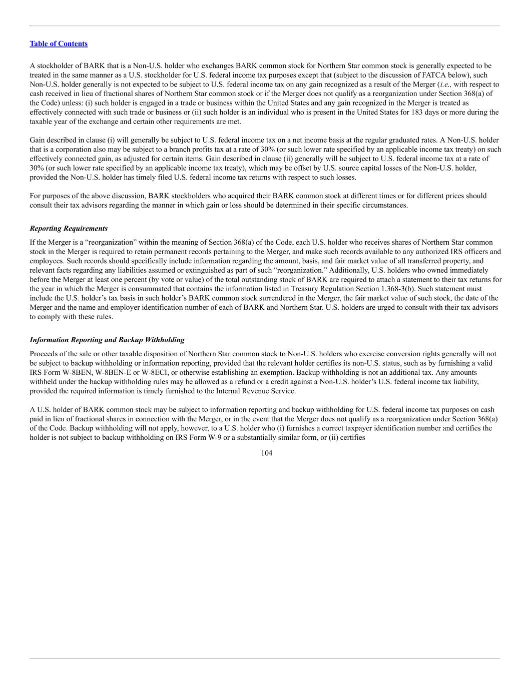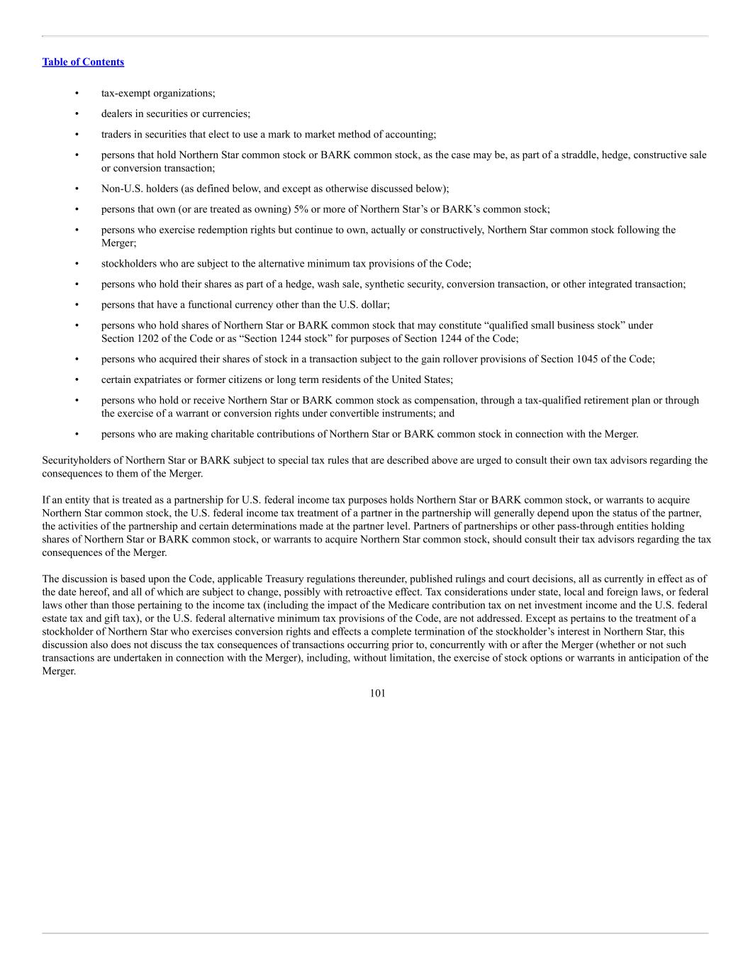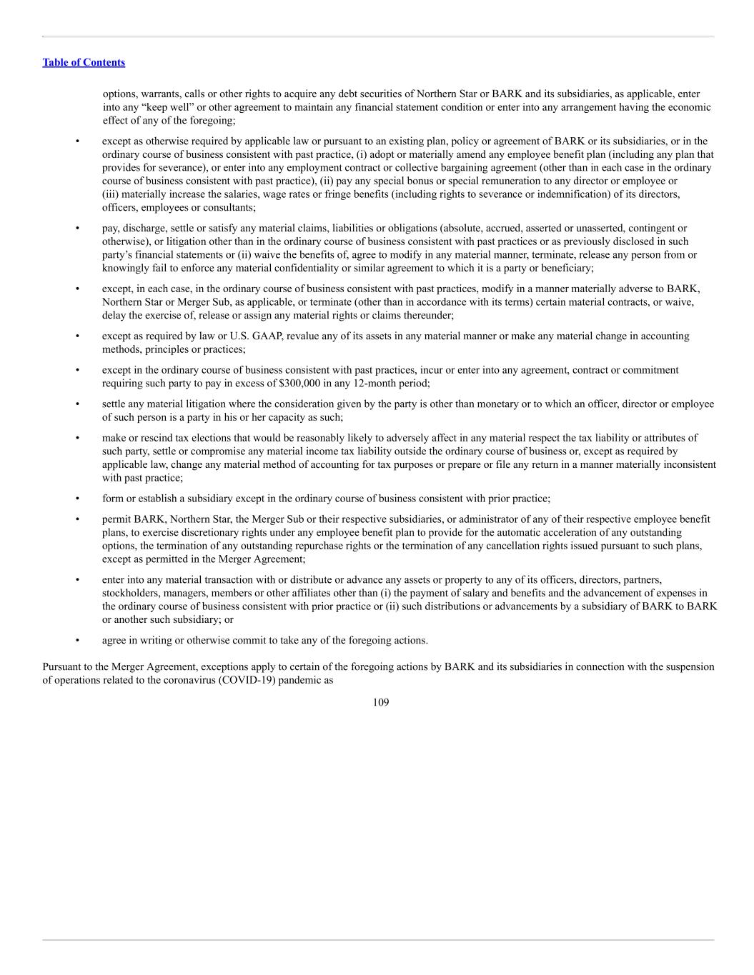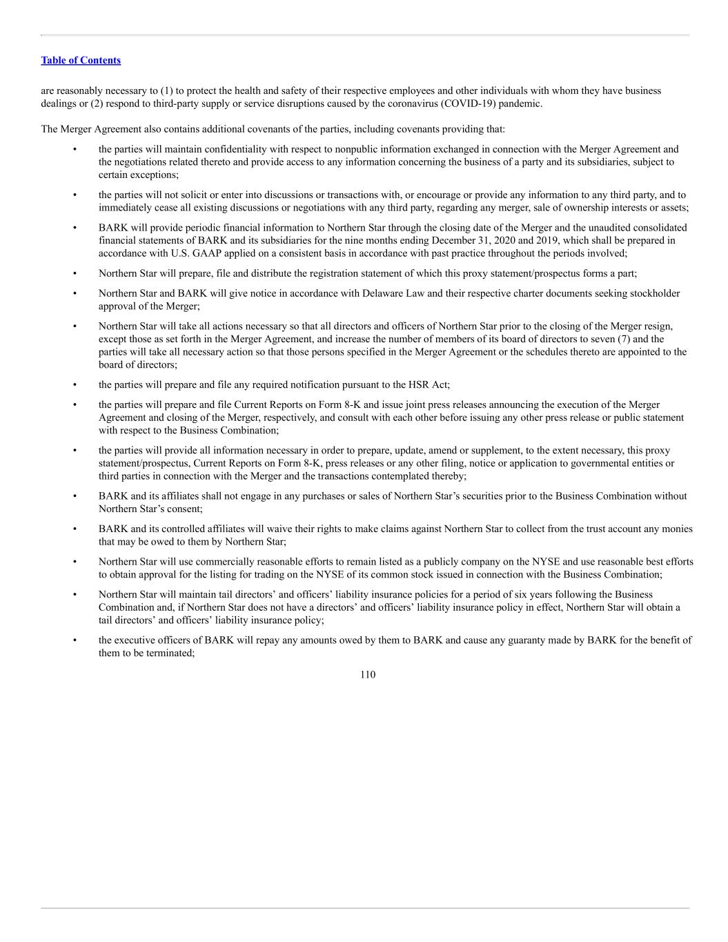 Table of Contents   •   Northern Star executing the Registration Rights Agreement;     •   the filing of Northern Star’s amended and restated certificate of incorporation with the Secretary of State of the State of Delaware and the adoption of the amended and restated bylaws;     •   the resignation of all persons employed by Northern Star, except for those specified in the Merger Agreement or the schedules thereto;     •   the termination of the existing registration rights agreement, among Northern Star and the former Northern Star stockholders thereto; and     •   the execution of the Lock-Up Agreement by Sponsor and certain other Class B Common stockholders of Northern Star. Northern Star’s and Merger Sub’s Conditions to Closing The obligations of Northern Star and Merger Sub to consummate the Merger are also conditioned upon, among other things:     •   the accuracy of the representations and warranties of BARK (subject to certain bring-down standards);     •   performance of the agreements and covenants of BARK and its subsidiaries required by the Merger Agreement to be performed on or prior to the closing of the Merger in all material respects;     •   no action, suit or proceeding being pending or threatened by any governmental entity which is reasonably likely to prevent consummation of the transactions contemplated by the Merger Agreement or cause any of the transactions contemplated by the Merger Agreement to be rescinded following consummation, or to materially and adversely affect the right of the surviving corporation to own, operate or control any of the assets of BARK following the Merger, and no order, judgment, decree, stipulation or injunction to such effect being in effect;     •   no Material Adverse Effect (as defined in the Merger Agreement) with respect to BARK having occurred since date of the Merger Agreement which is continuing as of the closing of the Business Combination;     •   delivery of updated financial statements of BARK and its subsidiaries to Northern Star;     •   execution and delivery of the Lock-Up Agreement by BARK’s stockholders specified in the Merger Agreement or the schedules thereto;     •   termination of certain Company agreements, including BARK’s existing stockholders’ agreement, specified in the Merger Agreement or the schedules thereto;     •   the delivery by BARK to Northern Star of a certificate that meets the requirements of Treasury Regulations Section 1.1445-2(c)(3) and states that shares of BARK are not “ U.S. real property interests” within the meaning of Section 897 of the Code, together with a written authorization for Northern Star to deliver such certification to the IRS on behalf of BARK after the closing of the Business Combination and a notice to the IRS in accordance with the provisions of Treasury Regulations Section 1.897-2(h)(2). Waiver If permitted under applicable law, Northern Star or BARK may waive in writing any inaccuracies in the representations and warranties made to such party contained in the Merger Agreement and waive compliance with any agreements or conditions for the benefit of itself or such party contained in the Merger Agreement. However, the condition requiring that Northern Star have at least $5,000,001 of net tangible assets as described above may not be waived.   27