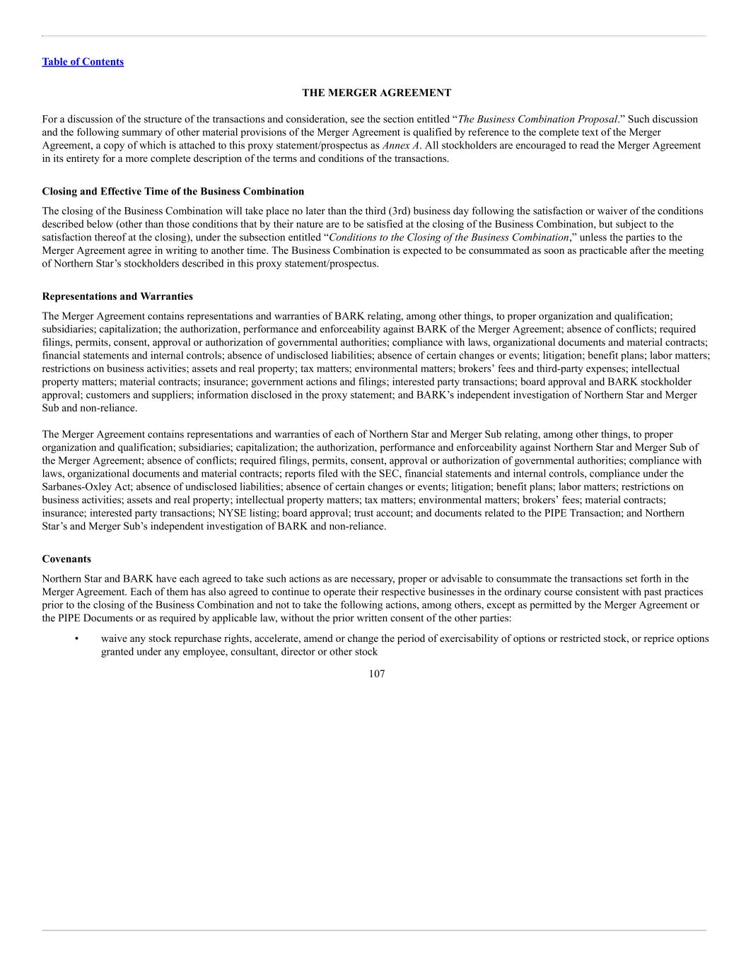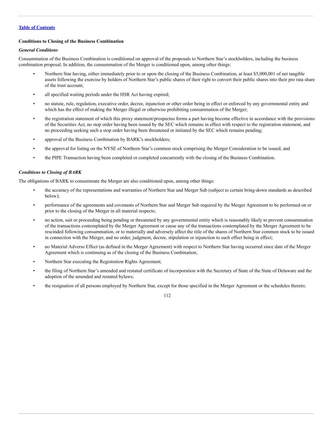 Table of Contents unanimously recommends that its stockholders vote “FOR” the business combination proposal, “FOR” the PIPE proposal, “FOR” each of the charter proposals, “FOR” the election of the seven director nominees identified in this proxy statement/prospectus, “FOR” the incentive plan proposal, “FOR” the ESPP proposal and “FOR” the adjournment proposal, if presented. Conditions to the Closing of the Business Combination General Conditions Consummation of the Business Combination is conditioned on approval of the proposals by Northern Star’s stockholders, including the business combination proposal. In addition, the consummation of the Merger is conditioned upon, among other things:     •   Northern Star having, either immediately prior to or upon the closing of the Business Combination, at least $5,000,001 of net tangible assets following the exercise by holders of Northern Star’s public shares of their right to convert their public shares into their pro rata share of the trust account;     •   all specified waiting periods under the HSR Act having expired;     •   no statute, rule, regulation, executive order, decree, injunction or other order being in effect or enforced by any governmental entity and which has the effect of making the Merger illegal or otherwise prohibiting consummation of the Merger;     •   the registration statement of which this proxy statement/prospectus forms a part having become effective in accordance with the provisions of the Securities Act, no stop order having been issued by the SEC which remains in effect with respect to the registration statement, and no proceeding seeking such a stop order having been threatened or initiated by the SEC which remains pending;     •   approval of the Business Combination by BARK’s stockholders;     •   the approval for listing on the NYSE of Northern Star’s common stock comprising the Merger Consideration to be issued; and     •   the PIPE Transaction having been completed or completed concurrently with the closing of the Business Combination. BARK’s Conditions to Closing The obligations of BARK to consummate the Merger are also conditioned upon, among other things:     •   the accuracy of the representations and warranties of Northern Star and Merger Sub (subject to certain bring-down standards);     •   performance of the agreements and covenants of Northern Star and Merger Sub required by the Merger Agreement to be performed on or prior to the closing of the Merger in all material respects;     •   no action, suit or proceeding being pending or threatened by any governmental entity which is reasonably likely to prevent consummation of the transactions contemplated by the Merger Agreement or cause any of the transactions contemplated by the Merger Agreement to be rescinded following consummation, or to materially and adversely affect the title of the shares of Northern Star common stock to be issued in connection with the Merger, and no order, judgment, decree, stipulation or injunction to such effect being in effect;     •   no Material Adverse Effect (as defined in the Merger Agreement) with respect to Northern Star having occurred since date of the Merger Agreement which is continuing as of the closing of the Business Combination;   26