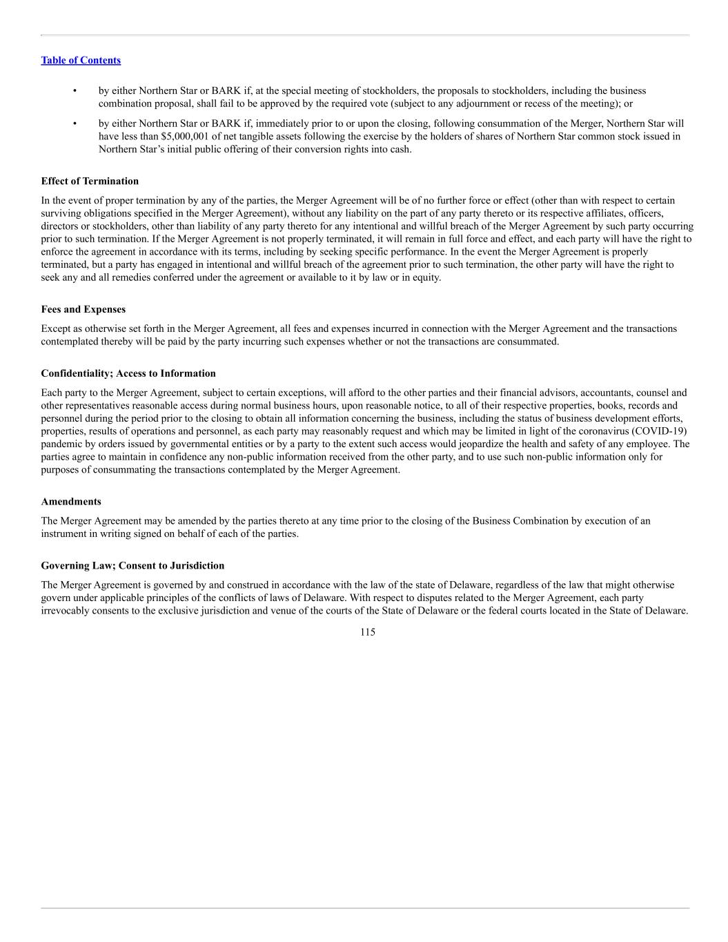 Table of Contents Termination The Merger Agreement may be terminated at any time, but not later than the closing of the Business Combination, as follows:     •   by mutual written consent of Northern Star and BARK;     •   by either Northern Star or BARK if the Business Combination is not consummated on or before June 30, 2021 (the “Outside Date”), provided that the right to terminate the Merger Agreement will not be available to any party whose action or failure to act has been a principal cause of or primarily resulted in the failure of the Merger to occur on or before such date and such action or failure to act constitutes a breach of the Merger Agreement;     •   by either Northern Star or BARK if a governmental entity shall have issued an order, decree or ruling or taken any other action, in any case having the effect of permanently restraining, enjoining or otherwise prohibiting the Merger, which order, decree, judgment, ruling or other action is final and non-appealable;     •   by either Northern Star or BARK if the other party has breached any of its representations, warranties, covenants or agreements in any material respect or any has become untrue such that the conditions to the Merger Agreement would not be satisfied as of the time of such breach and such breach is incapable of being cured or is not cured by the Outside Date, provided that the terminating party is itself not in material breach;     •   by Northern Star if BARK shall have failed to deliver Support Agreements within five (5) Business Days following the execution of the Merger Agreement;     •   by Northern Star if BARK fails to obtain the requisite approval of its stockholders to the Merger Agreement and the Merger by written consent within ten (10) business days following the approval of this proxy statement/prospectus by the SEC;     •   by either Northern Star or BARK if, at the special meeting of stockholders, the proposals to stockholders, including the business combination proposal, shall fail to be approved by the required vote (subject to any adjournment or recess of the meeting); or     •   by either Northern Star or BARK if, immediately prior to or upon the closing, following consummation of the Merger, Northern Star will have less than $5,000,001 of net tangible assets following the exercise by the holders of shares of Northern Star common stock issued in Northern Star’s initial public offering of their conversion rights into cash. Lock-Up Agreement Certain of BARK’s stockholders have entered or will enter into the Lock-Up Agreement, which provides that shares of Northern Star common stock to be issued to them in the Merger will be subject to a 12-month lock-up period, during which, subject to certain exceptions, they will not, directly or indirectly, sell, transfer or otherwise dispose of their shares to be issued in the Merger, which period may be earlier terminated if the reported closing sale price of the Northern Star common stock equals or exceeds $15.00 per share (subject to adjustment for stock splits, stock dividends, reorganizations, recapitalizations or other similar transactions) for a period of 20 trading days during any 30-trading-day period commencing at least 150 days following the consummation of the Merger. In addition, Northern Star has agreed to cause its initial stockholders to amend the existing lock-up restrictions applicable to them and enter into agreements substantially identical to the Lock-Up Agreement, so that the lock-up restrictions with respect to the initial stockholders’ Northern Star common stock will be identical to the lock-up restrictions applicable to BARK’s stockholders who have entered, or will enter, into the Lock-Up Agreement. Furthermore, pursuant to a letter agreement executed in connection with Northern Star’s initial   28