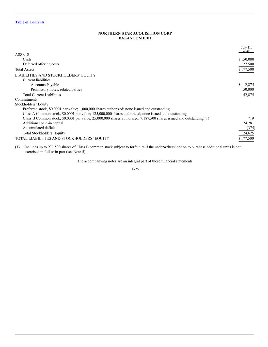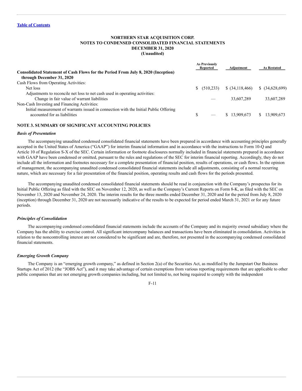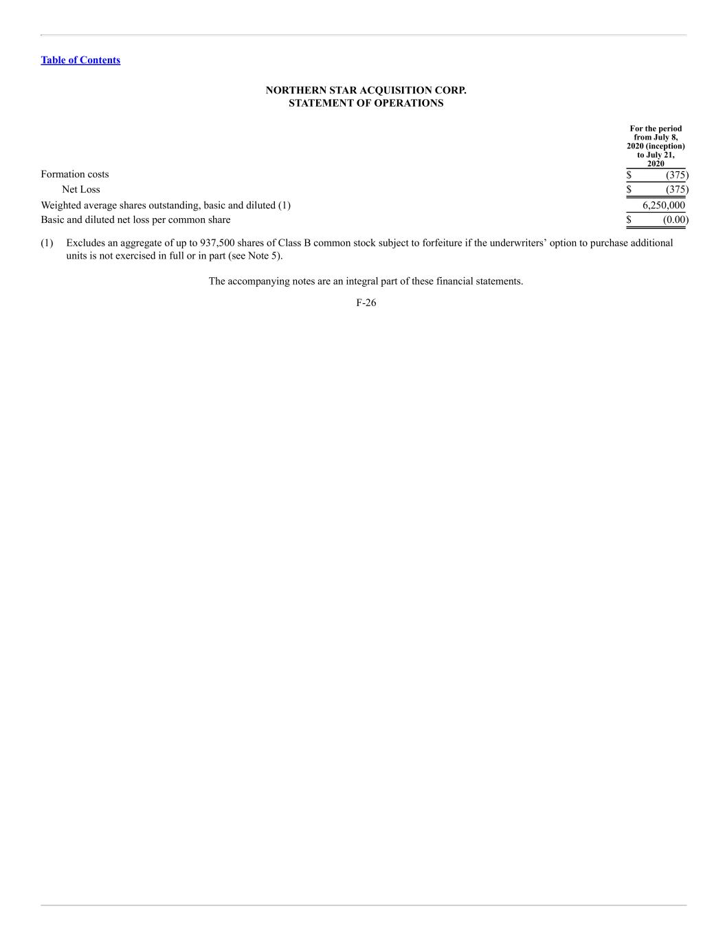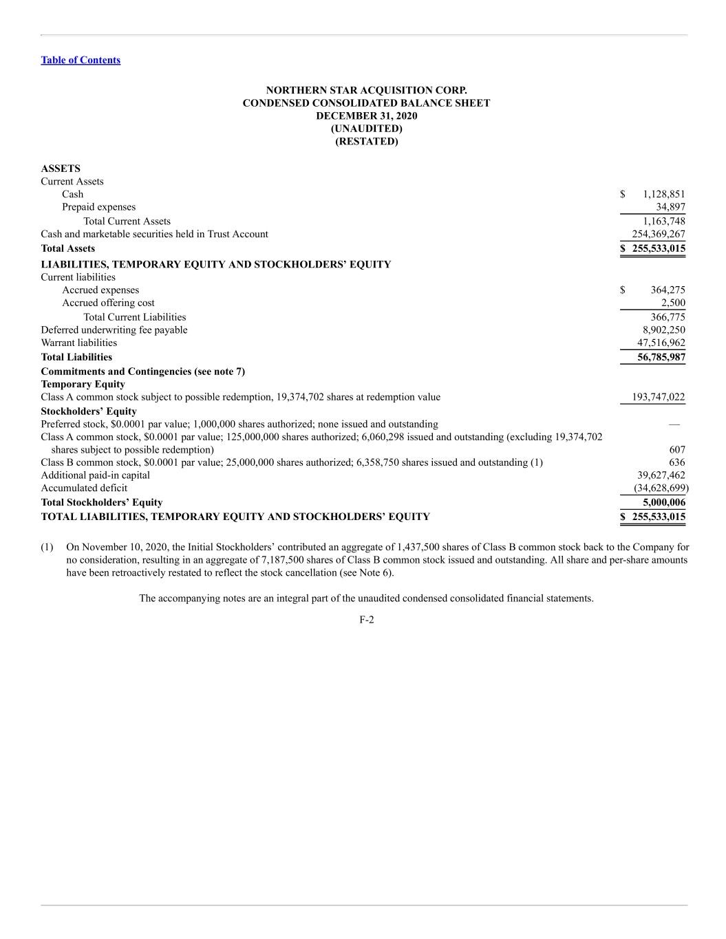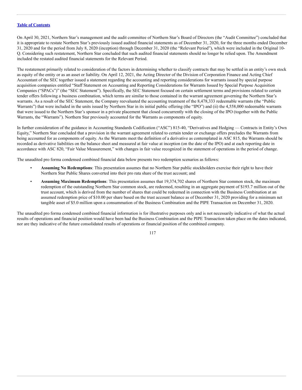 Table of Contents SUMMARY HISTORICAL FINANCIAL INFORMATION OF NORTHERN STAR Northern Star is providing the following selected historical financial information to assist you in your analysis of the financial aspects of the merger. The historical financial statements of Northern Star have been prepared in accordance with U.S. GAAP. Northern Star’s consolidated balance sheet data as of December 31, 2020 and consolidated statement of operations data for the period from July 8, 2020 (inception) through December 31, 2020 are derived from Northern Star’s unaudited restated financial statements included elsewhere in this proxy statement/prospectus. The restatement is more fully described in Note 2 of the notes to Northern Star’s financial statements included herein. The information is only a summary and should be read in conjunction with Northern Star’s consolidated financial statements and related notes and “Other Information Related to Northern Star — Northern Star’s Management’s Discussion and Analysis of Financial Condition and Results of Operations” contained elsewhere herein. The historical results included below and elsewhere in this proxy statement/prospectus are not indicative of the future performance of Northern Star. All amounts are in US dollars. This summary historical financial information has been amended and restated to give effect to the restatement of our financial statements, as more fully described in Note 2 to our financial statements entitled “Restatement of Previously Issued Financial Statements”.        Period from  July 8, 2020  (inception) to  December 31, 2020       (unaudited)        (in thousands,  except for share  data)   Statement of Operation Data:    Formation and operating costs    $ (1,041)  Other expense, net      (33,587)  Net Loss      (34,628)  Weighted average shares outstanding, basic and diluted      6,992,903       As of  December 31,  2020        (unaudited)        (in thousands)   Balance Sheet Data:    Total Assets    $ 255,533  Total Liabilities      56,786  Temporary Equity    $ 193,747  Stockholders’ Equity      5,000    32