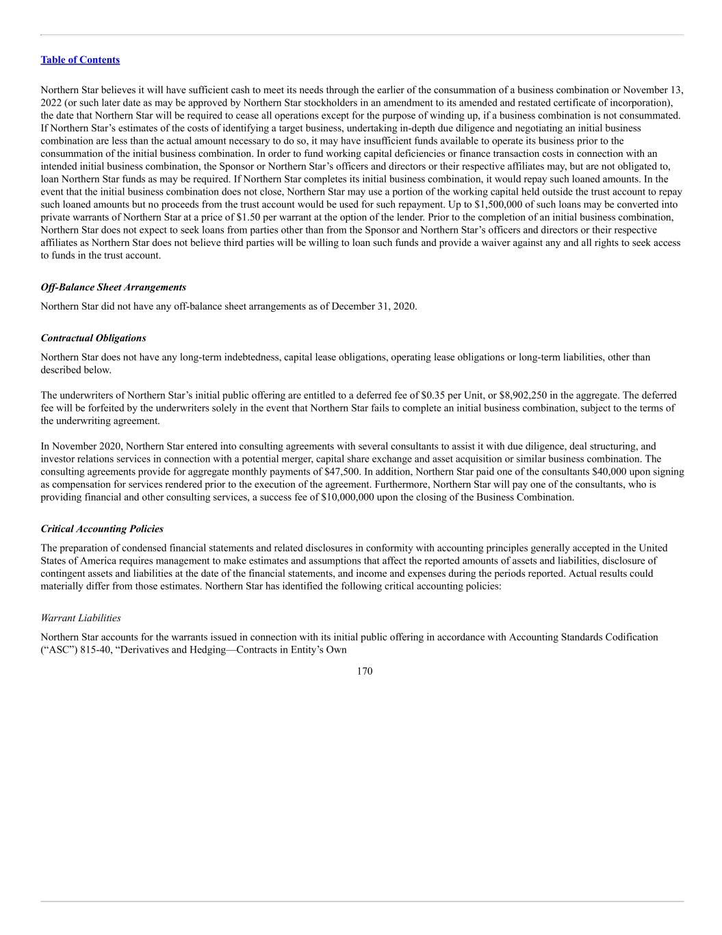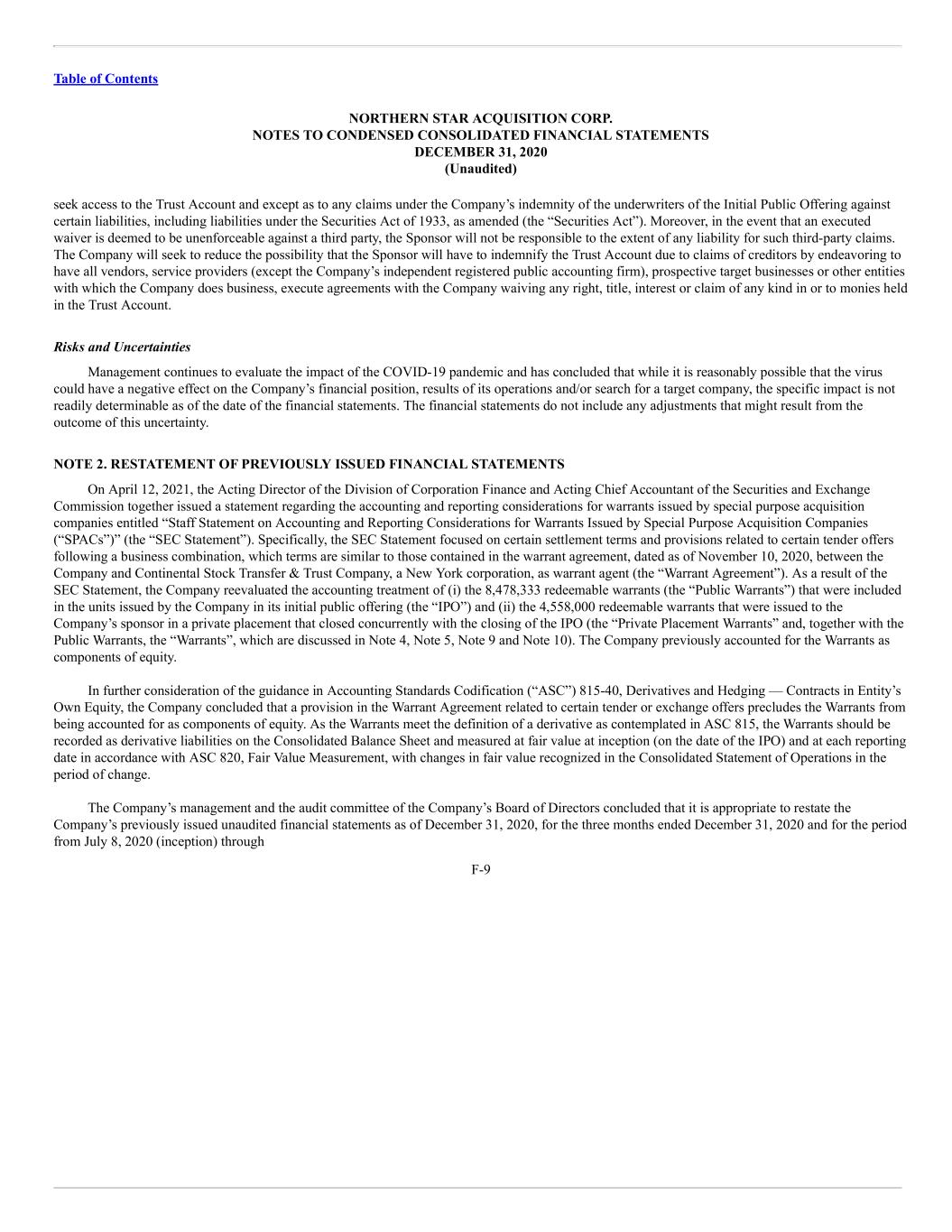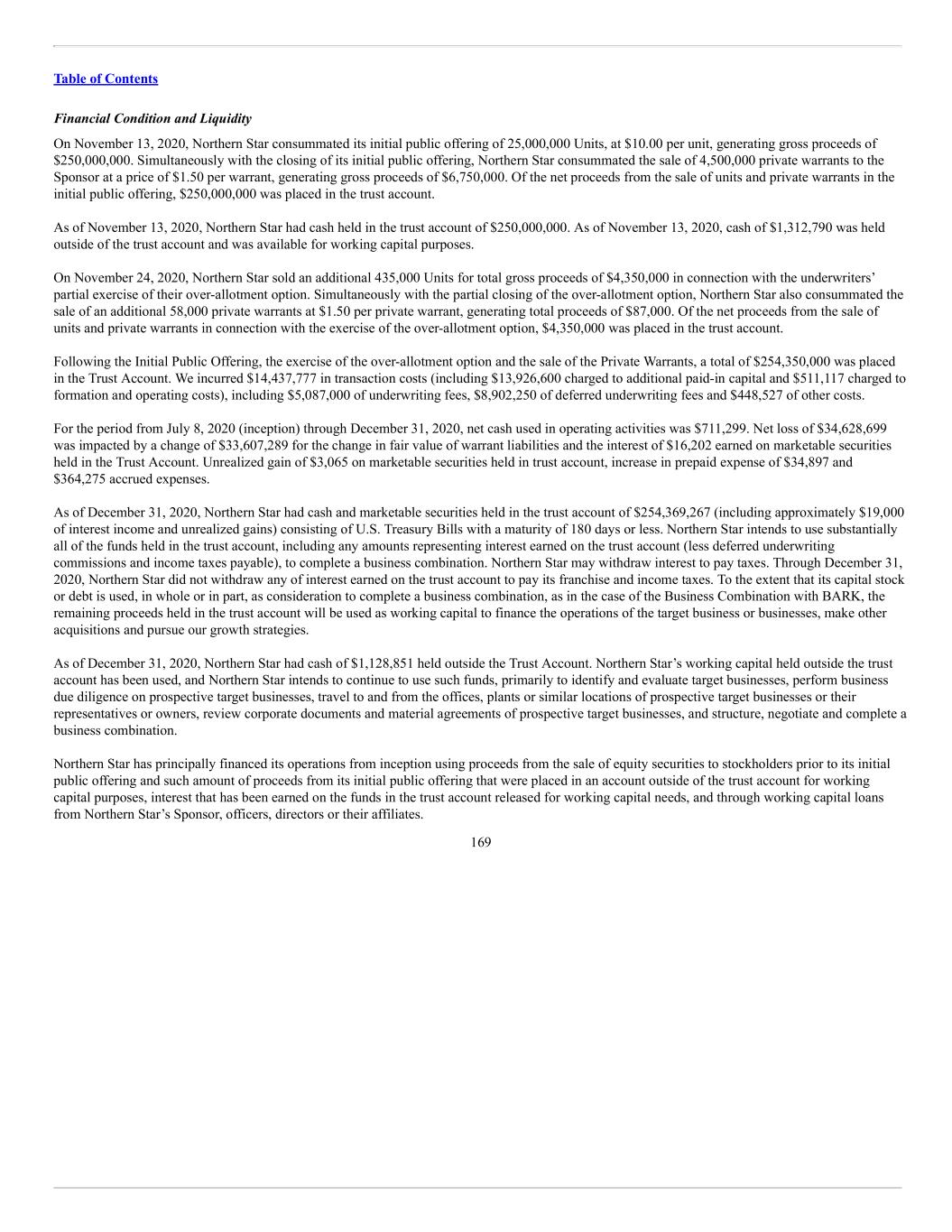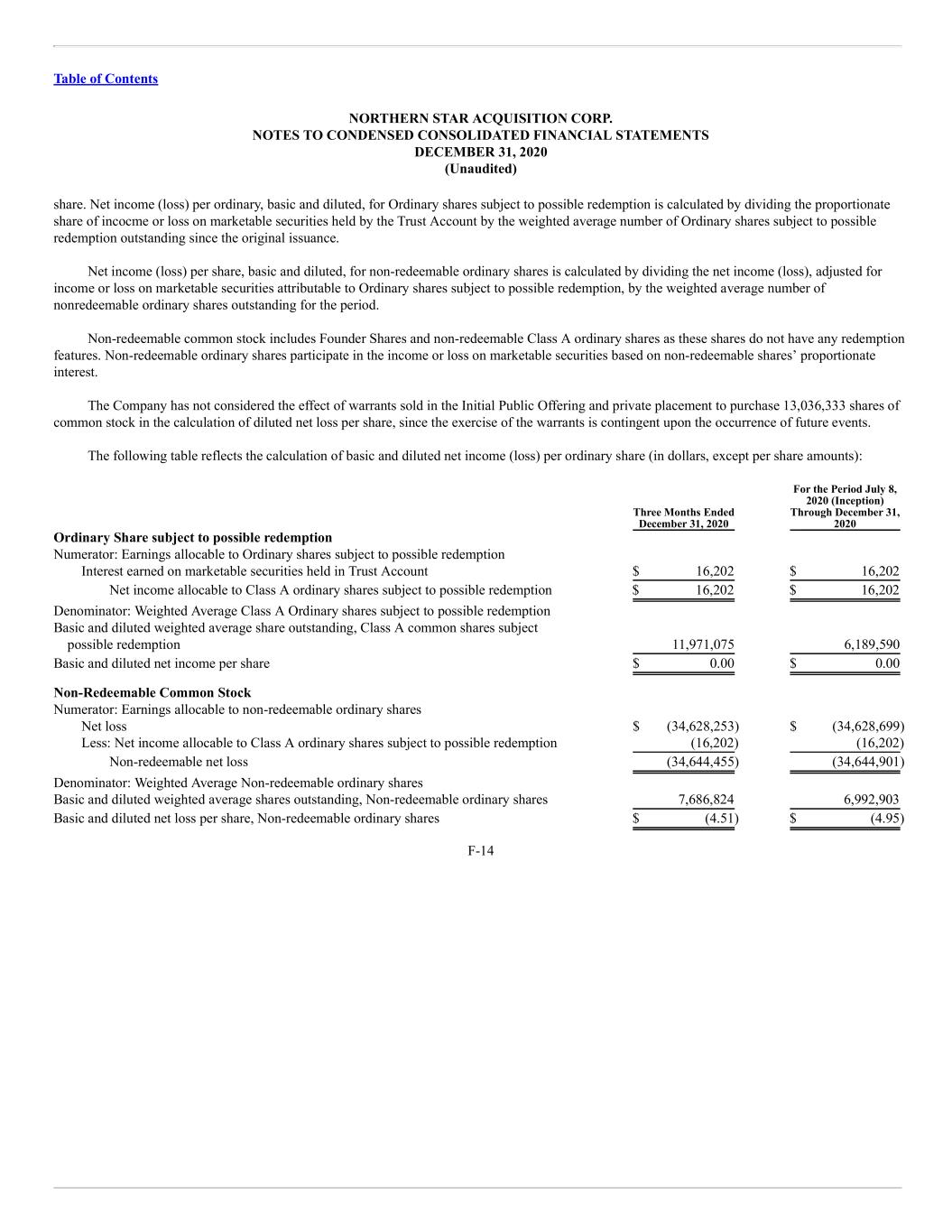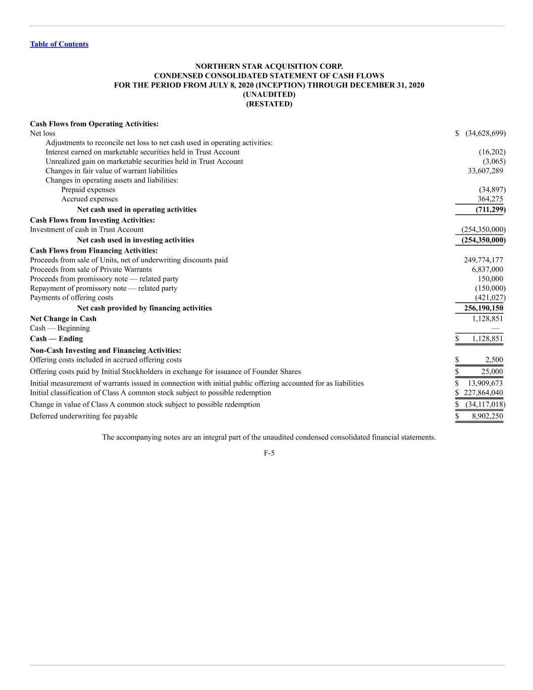 Table of Contents SUMMARY HISTORICAL FINANCIAL INFORMATION OF NORTHERN STAR Northern Star is providing the following selected historical financial information to assist you in your analysis of the financial aspects of the merger. The historical financial statements of Northern Star have been prepared in accordance with U.S. GAAP. Northern Star’s consolidated balance sheet data as of December 31, 2020 and consolidated statement of operations data for the period from July 8, 2020 (inception) through December 31, 2020 are derived from Northern Star’s unaudited restated financial statements included elsewhere in this proxy statement/prospectus. The restatement is more fully described in Note 2 of the notes to Northern Star’s financial statements included herein. The information is only a summary and should be read in conjunction with Northern Star’s consolidated financial statements and related notes and “Other Information Related to Northern Star — Northern Star’s Management’s Discussion and Analysis of Financial Condition and Results of Operations” contained elsewhere herein. The historical results included below and elsewhere in this proxy statement/prospectus are not indicative of the future performance of Northern Star. All amounts are in US dollars. This summary historical financial information has been amended and restated to give effect to the restatement of our financial statements, as more fully described in Note 2 to our financial statements entitled “Restatement of Previously Issued Financial Statements”.        Period from  July 8, 2020  (inception) to  December 31, 2020       (unaudited)        (in thousands,  except for share  data)   Statement of Operation Data:    Formation and operating costs    $ (1,041)  Other expense, net      (33,587)  Net Loss      (34,628)  Weighted average shares outstanding, basic and diluted      6,992,903       As of  December 31,  2020        (unaudited)        (in thousands)   Balance Sheet Data:    Total Assets    $ 255,533  Total Liabilities      56,786  Temporary Equity    $ 193,747  Stockholders’ Equity      5,000    32