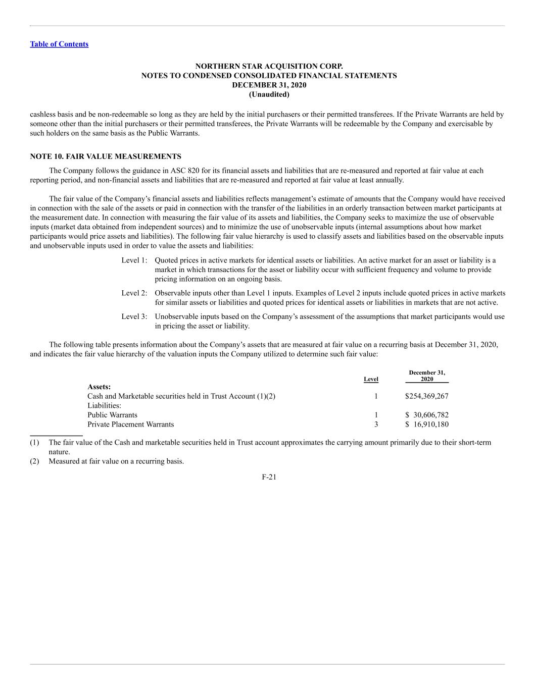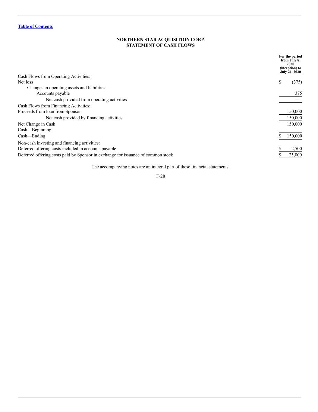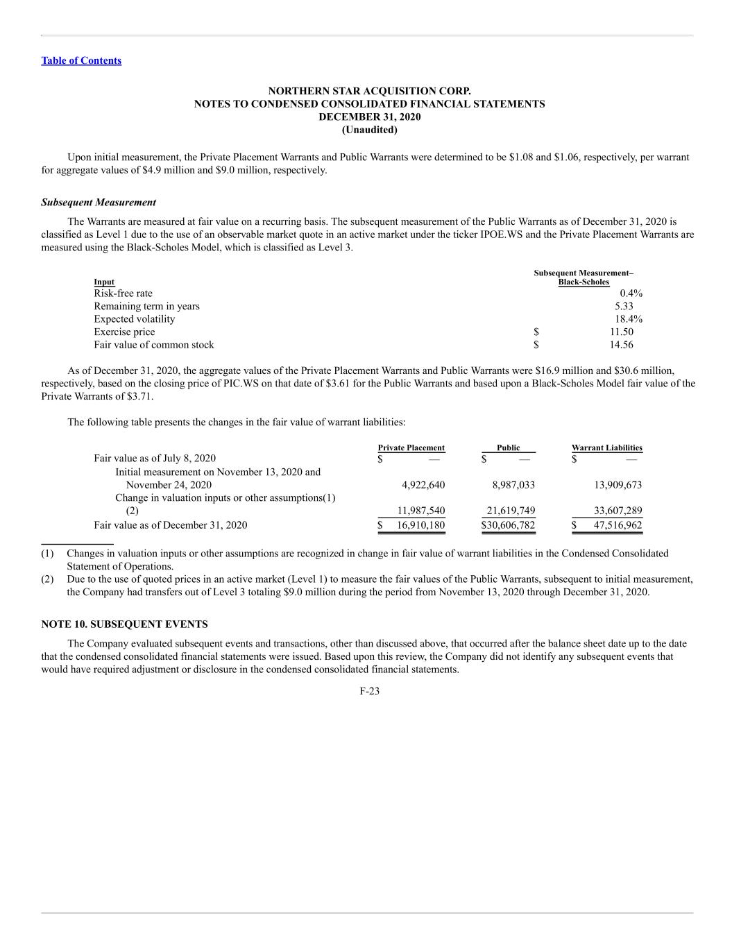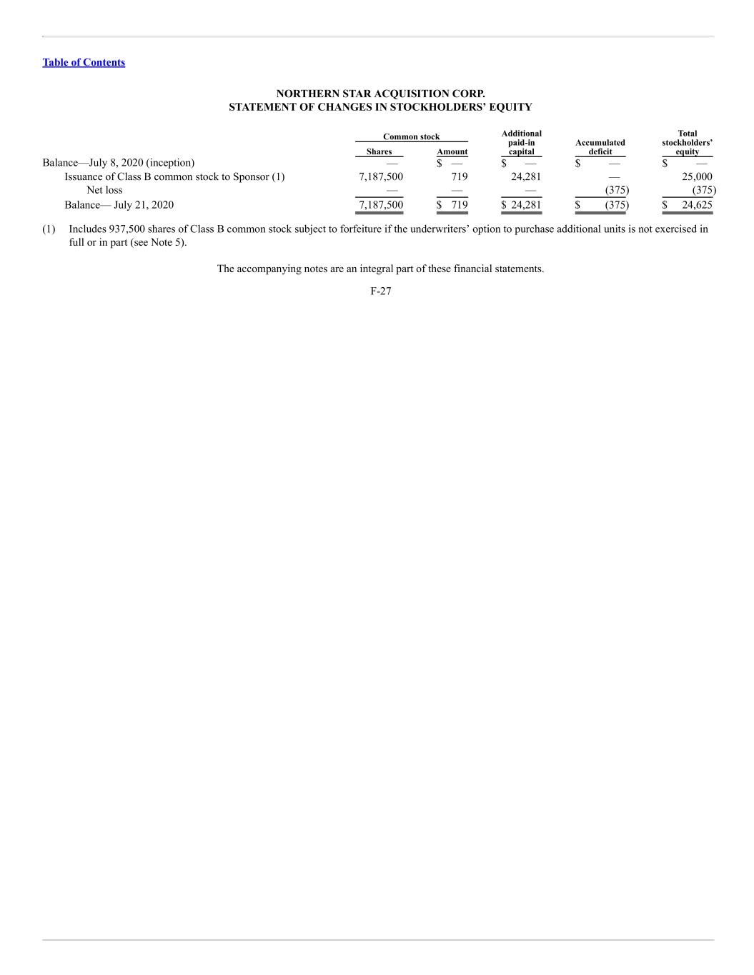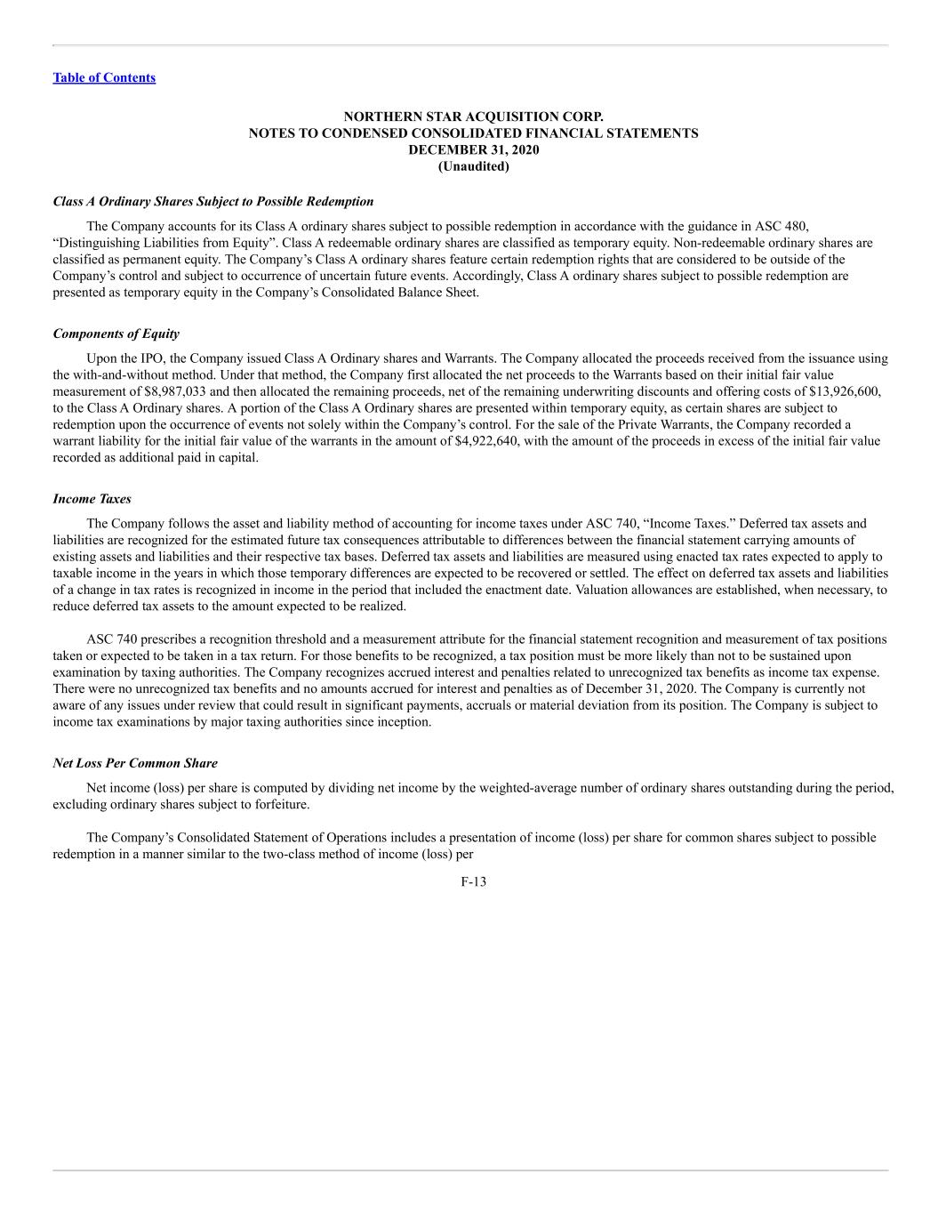 Table of Contents SUMMARY HISTORICAL FINANCIAL INFORMATION OF NORTHERN STAR Northern Star is providing the following selected historical financial information to assist you in your analysis of the financial aspects of the merger. The historical financial statements of Northern Star have been prepared in accordance with U.S. GAAP. Northern Star’s consolidated balance sheet data as of December 31, 2020 and consolidated statement of operations data for the period from July 8, 2020 (inception) through December 31, 2020 are derived from Northern Star’s unaudited restated financial statements included elsewhere in this proxy statement/prospectus. The restatement is more fully described in Note 2 of the notes to Northern Star’s financial statements included herein. The information is only a summary and should be read in conjunction with Northern Star’s consolidated financial statements and related notes and “Other Information Related to Northern Star — Northern Star’s Management’s Discussion and Analysis of Financial Condition and Results of Operations” contained elsewhere herein. The historical results included below and elsewhere in this proxy statement/prospectus are not indicative of the future performance of Northern Star. All amounts are in US dollars. This summary historical financial information has been amended and restated to give effect to the restatement of our financial statements, as more fully described in Note 2 to our financial statements entitled “Restatement of Previously Issued Financial Statements”.        Period from  July 8, 2020  (inception) to  December 31, 2020       (unaudited)        (in thousands,  except for share  data)   Statement of Operation Data:    Formation and operating costs    $ (1,041)  Other expense, net      (33,587)  Net Loss      (34,628)  Weighted average shares outstanding, basic and diluted      6,992,903       As of  December 31,  2020        (unaudited)        (in thousands)   Balance Sheet Data:    Total Assets    $ 255,533  Total Liabilities      56,786  Temporary Equity    $ 193,747  Stockholders’ Equity      5,000    32