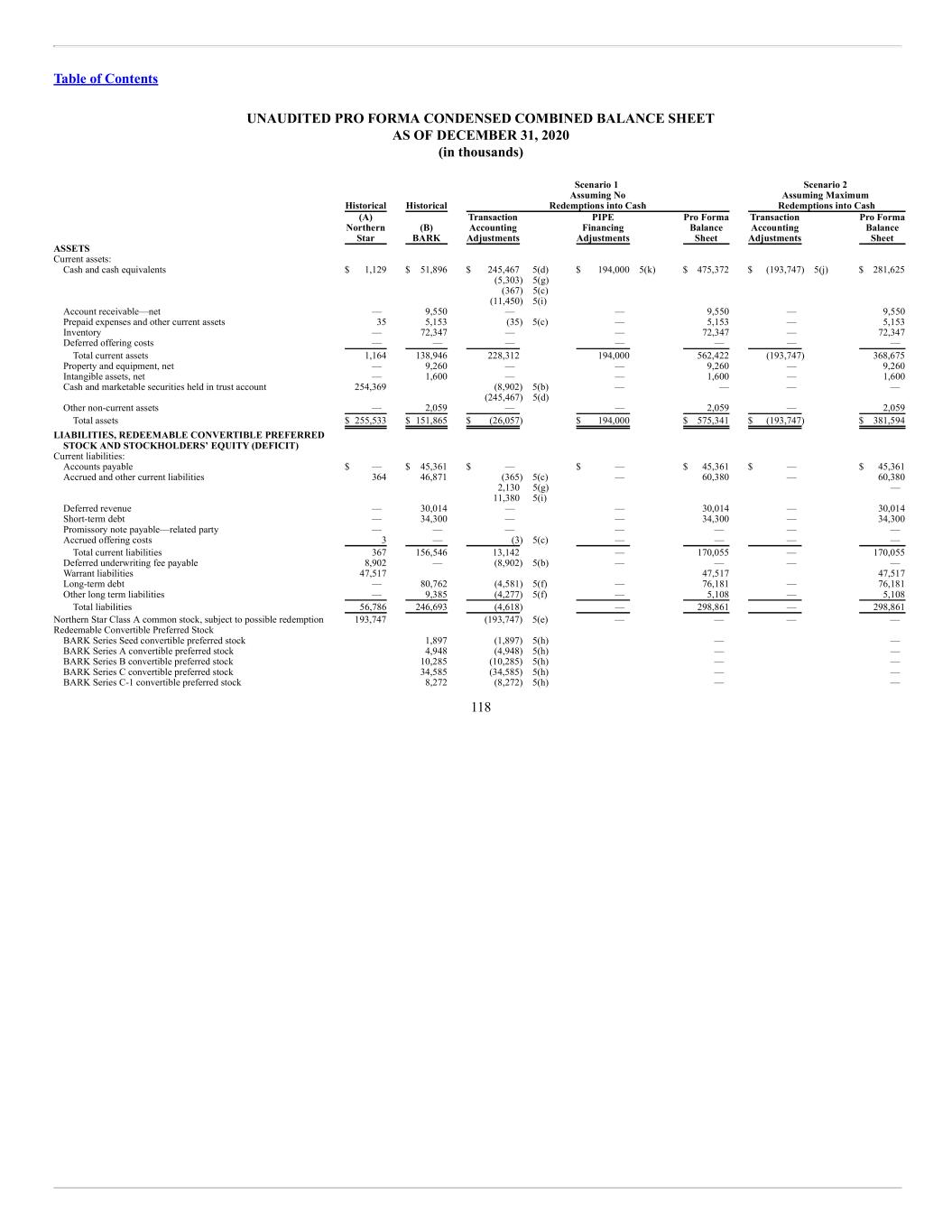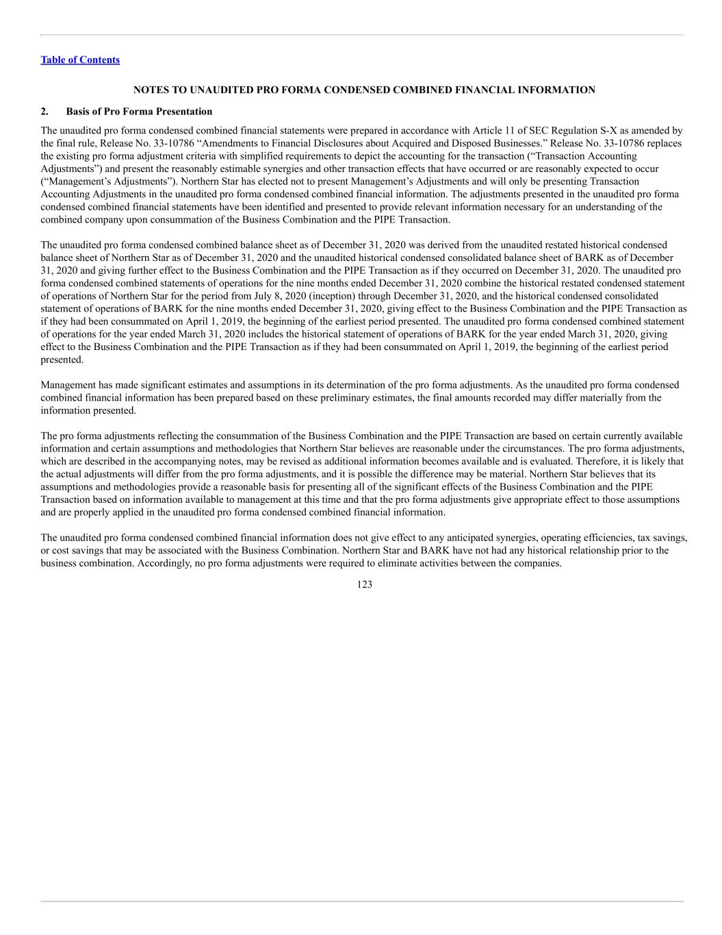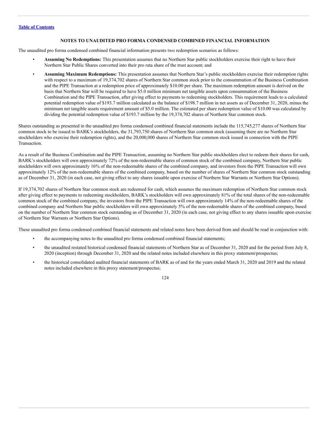 Table of Contents COMPARATIVE PER SHARE DATA The unaudited pro forma condensed combined balance sheet as of December 31, 2020, the unaudited pro forma condensed combined statement of operations for the nine months ended December 31, 2020 and the unaudited pro forma condensed statement of operations for the year ended March 31, 2020 have been prepared using two different assumptions regarding the number of public shares as to which the Northern Star public stockholders exercise their conversion rights, as follows:     •   Assuming No Redemptions: This presentation assumes that no Northern Star public stockholders exercise their right to have their Northern Star Public Shares converted into their pro rata share of the trust account; and     •   Assuming Maximum Redemptions: This presentation assumes that 19,374,702 shares of Northern Star common stock, the maximum redemption of the outstanding Northern Star common stock, are redeemed, resulting in an aggregate payment of $193.7 million out of the trust account, which is derived from the number of shares that could be redeemed in connection with the Business Combination at an assumed redemption price of $10.00 per share based on the trust account balance as of December 31, 2020 providing for a minimum net tangible asset of $5.0 million upon a consummation of the Business Combination and the PIPE Transaction on December 31, 2020. The unaudited pro forma condensed combined financial statements were prepared in accordance with Article 11 of SEC Regulation S-X as amended by the final rule, Release No. 33-10786 “Amendments to Financial Disclosures about Acquired and Disposed Businesses.” Release No. 33-10786 replaces the existing pro forma adjustment criteria with simplified requirements to depict the accounting for the transaction (“Transaction Accounting Adjustments”) and present the reasonably estimable synergies and other transaction effects that have occurred or are reasonably expected to occur (“Management’s Adjustments”). Northern Star has elected not to present Management’s Adjustments and will only be presenting Transaction Accounting Adjustments in the unaudited pro forma condensed combined financial information. The adjustments presented in the unaudited pro forma condensed combined financial statements have been identified and presented to provide relevant information necessary for an accurate understanding of the combined company upon consummation of the transactions. The historical financial statements of Northern Star and BARK have been prepared in accordance with U.S. GAAP. The historical financial information of Northern Star was derived from the unaudited restated condensed financial statements of Northern Star for the period from July 8, 2020 (inception) to December 31, 2020, which are included elsewhere in this proxy statement. The historical financial information of BARK was derived from the unaudited condensed consolidated financial statements of BARK for the nine months ended December 31, 2020 and the audited consolidated financial statements of BARK for the year ended March 31, 2020, included elsewhere in this proxy statement. This information should be read together with Northern Star’s and BARK’s financial statements and related notes, “Other Information Related to Northern Star—Northern Star’s Management’s Discussion and Analysis of Financial Condition and Results of Operations,” “BARK’s Management’s Discussion and Analysis of Financial Condition and Results of Operations” and other financial information included elsewhere in this proxy statement.   37