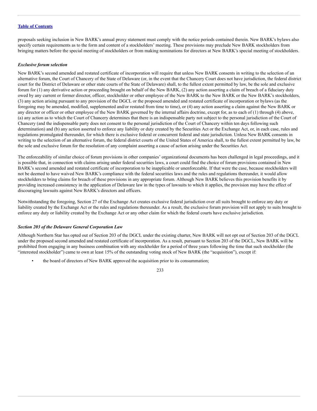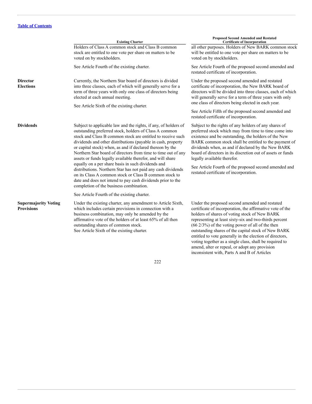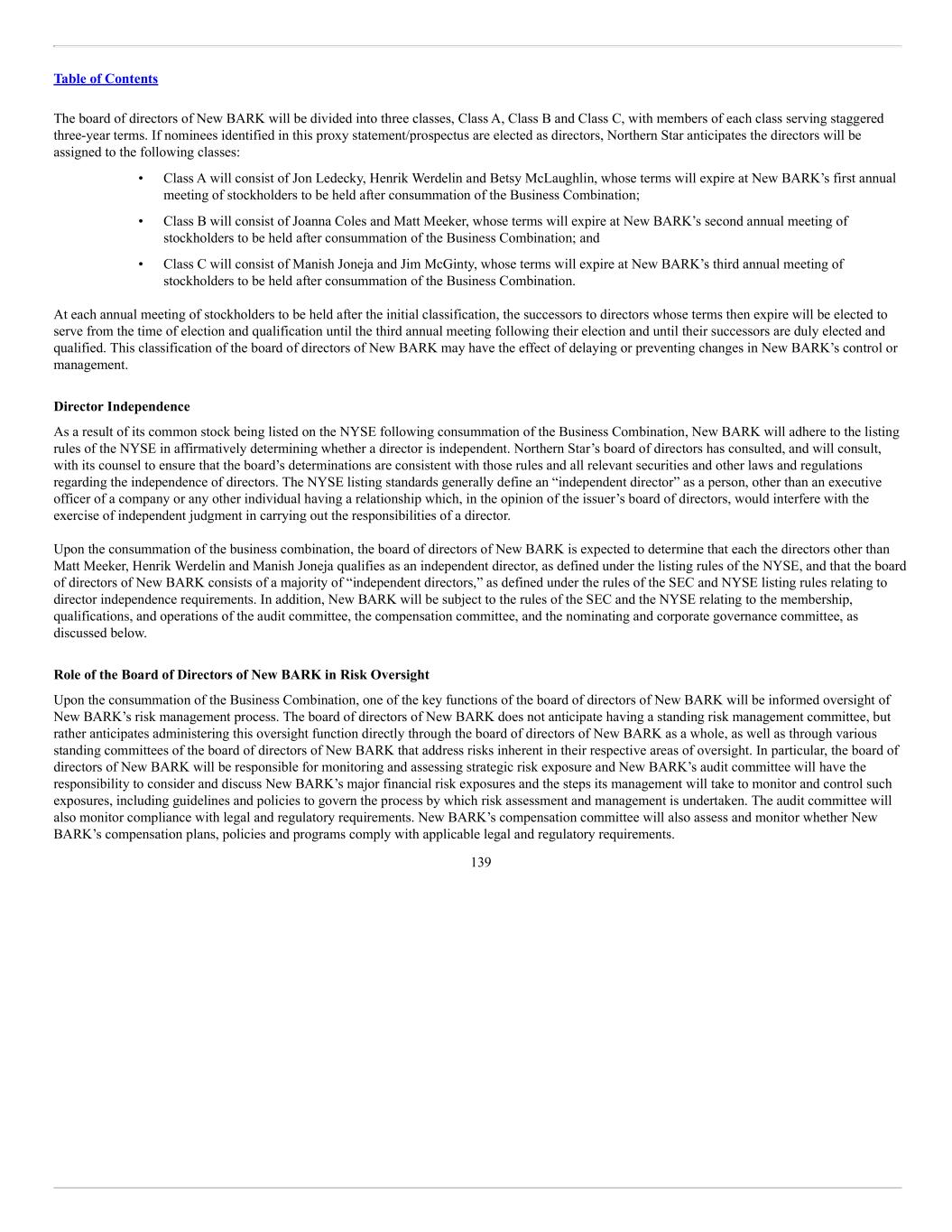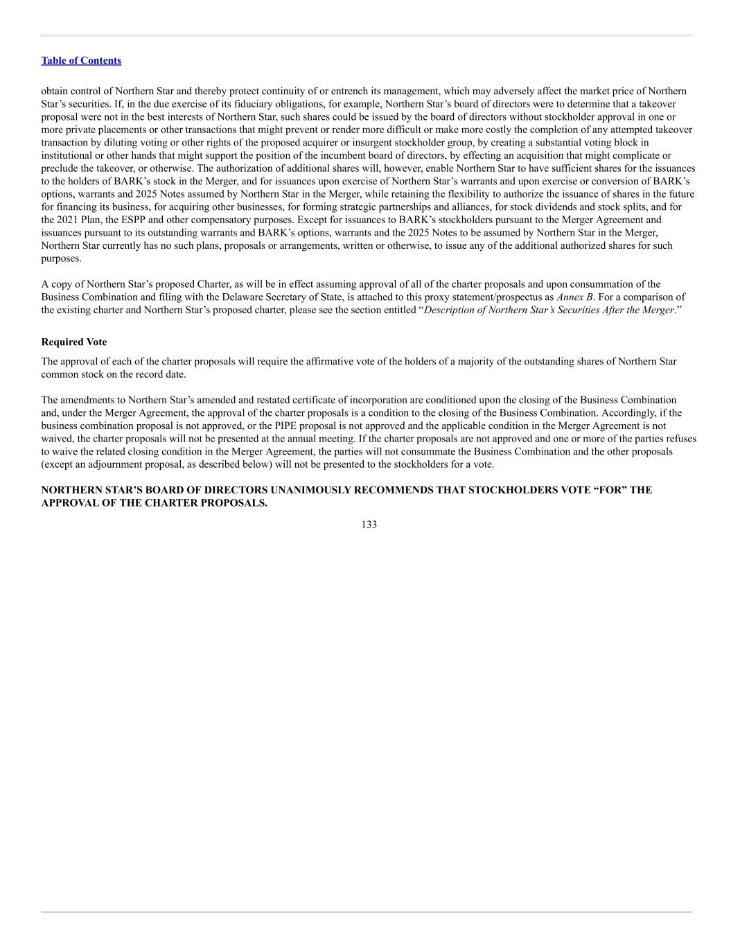 Table of Contents   is authorized to issue to 500,000,000 shares and remove the provisions for Northern Star’s current Class B common stock (the shares of which will all convert into shares of Class A common stock in connection with the Business Combination) so that the Class B common stock will cease to exist and Northern Star will have a single class of common stock, (c) to add supermajority voting provisions requiring the affirmative vote of the holders of 66 2/3% of the voting power of all of the then outstanding shares of the capital stock of New BARK to amend certain provisions of the second amended and restated certificate of incorporation, to adopt, amend or repeal any provision of the bylaws, or to remove any director, or the entire Board of Directors, and (d) to remove the various provisions applicable only to special purpose acquisition companies (such as the obligation to dissolve and liquidate if a business combination is not consummated within a certain period of time) and make certain other immaterial changes that the Northern Star board deems appropriate; (ii) elect seven directors who, upon the closing of the Business Combination, will be the directors of Northern Star; (iii) approve Northern Star’s 2021 Equity Incentive Plan (the “2021 Plan”); (iv) approve Northern Star’s 2021 Employee Stock Purchase Plan (the “ESPP”); and (v) adjourn the annual meeting to a later date or dates, if it is determined by the officer presiding over the annual meeting that more time is necessary for Northern Star to consummate the Merger and the other transactions contemplated by the Merger Agreement. The approval of these proposals (other than the adjournment proposal) by the stockholders of Northern Star is a condition to the consummation of the Business Combination. See the sections entitled “The Charter Proposals,” “The Director Election Proposal,” “The Incentive Plan Proposal,” “The ESPP Proposal,” and “The Adjournment Proposal.”     •   Pursuant to the terms of the Merger Agreement, the parties thereto have agreed to nominate the following persons to serve as the initial directors of Northern Star upon the closing of the Business Combination: as Class A directors serving until Northern Star’s 2022 annual meeting of stockholders, Jon Ledecky, Henrik Werdelin and Betsy McLaughlin; as Class B directors serving until Northern Star’s 2023 annual meeting of stockholders, Joanna Coles and Matt Meeker; and as Class C directors serving until Northern Star’s 2024 annual meeting of stockholders, Manish Joneja and Jim McGinty. See the section entitled “The Director Election Proposal.”     •   Upon completion of the Merger, the executive officers of Northern Star will include Matthew Meeker, as Executive Chairman, and Manish Joneja, as Chief Executive Officer, and the other persons described under “The Director Election Proposal—Information about Executive Officers, Directors and Nominees.”     •   Certain stockholders of BARK and Northern Star will enter into a registration rights agreement (the “Registration Rights Agreement”), pursuant to which they will be granted certain rights to have registered, in certain circumstances, the resale under the Securities Act of certain shares of Northern Star common stock held by them, subject to certain conditions set forth therein. Northern Star will terminate its existing registration rights agreement with the Northern Star initial stockholders. See the section entitled “The Business Combination Proposal—Related Agreements.”     •   In connection with the execution of the Merger Agreement, certain of BARK’s officers, directors, founders and their family members and 5% or greater holders of BARK’s stock (the “Supporting Holders”), who collectively hold approximately 77.5% of the issued and outstanding shares of BARK’s common stock on an as-converted basis as of April 5, 2021, have entered into agreements with Northern Star (the “Support Agreements”) pursuant to which the Supporting Holders have agreed, among other things, to vote all of their respective shares of BARK’s stock in favor of the Merger at a meeting called to approve the Merger by BARK’s stockholders (or in an action by written consent approving the Merger). See the section entitled “The Business Combination Proposal—Related Agreements.”   3