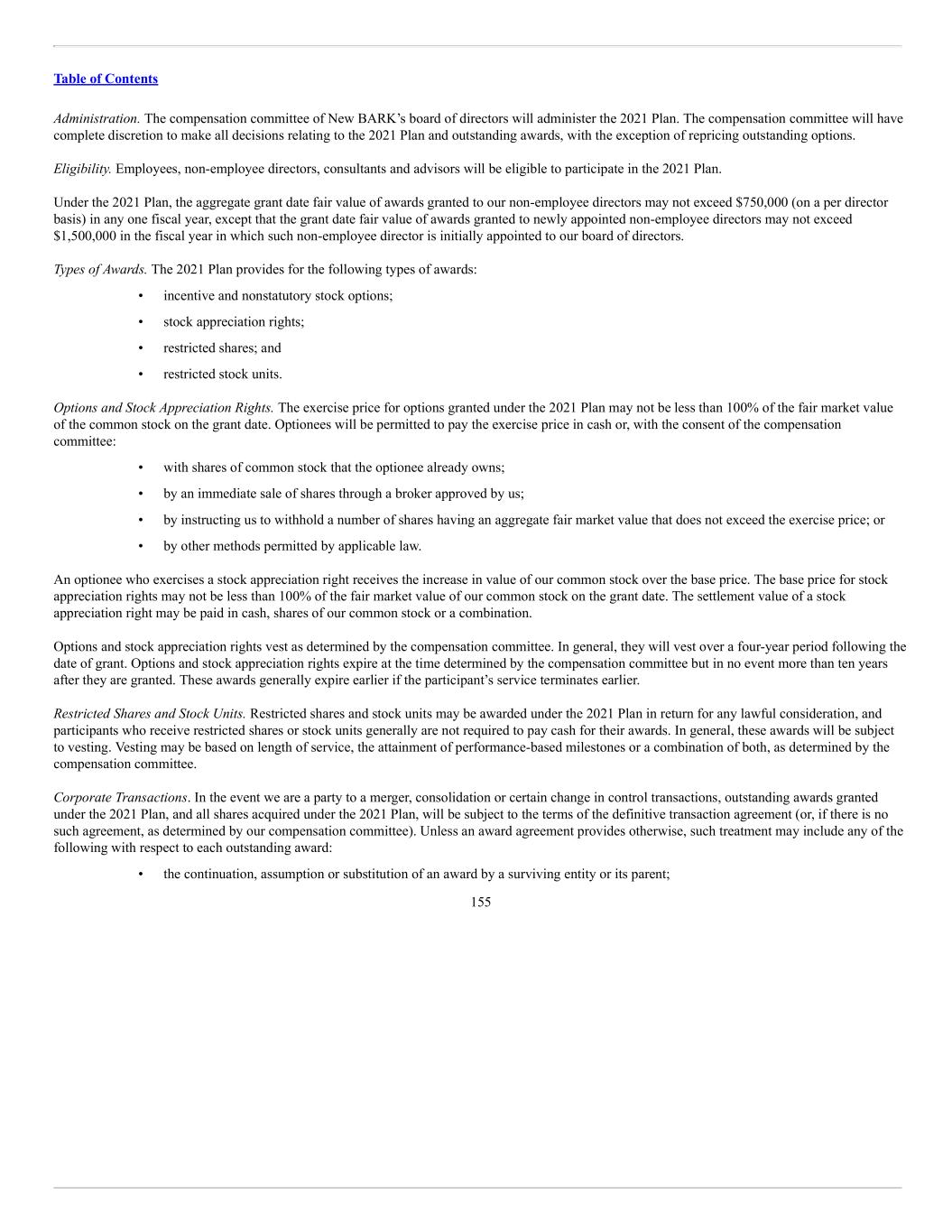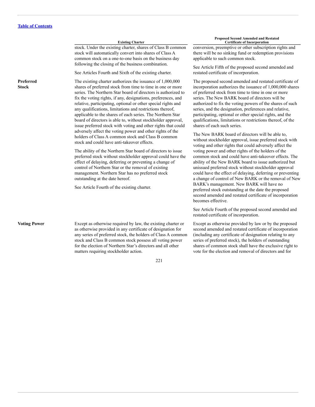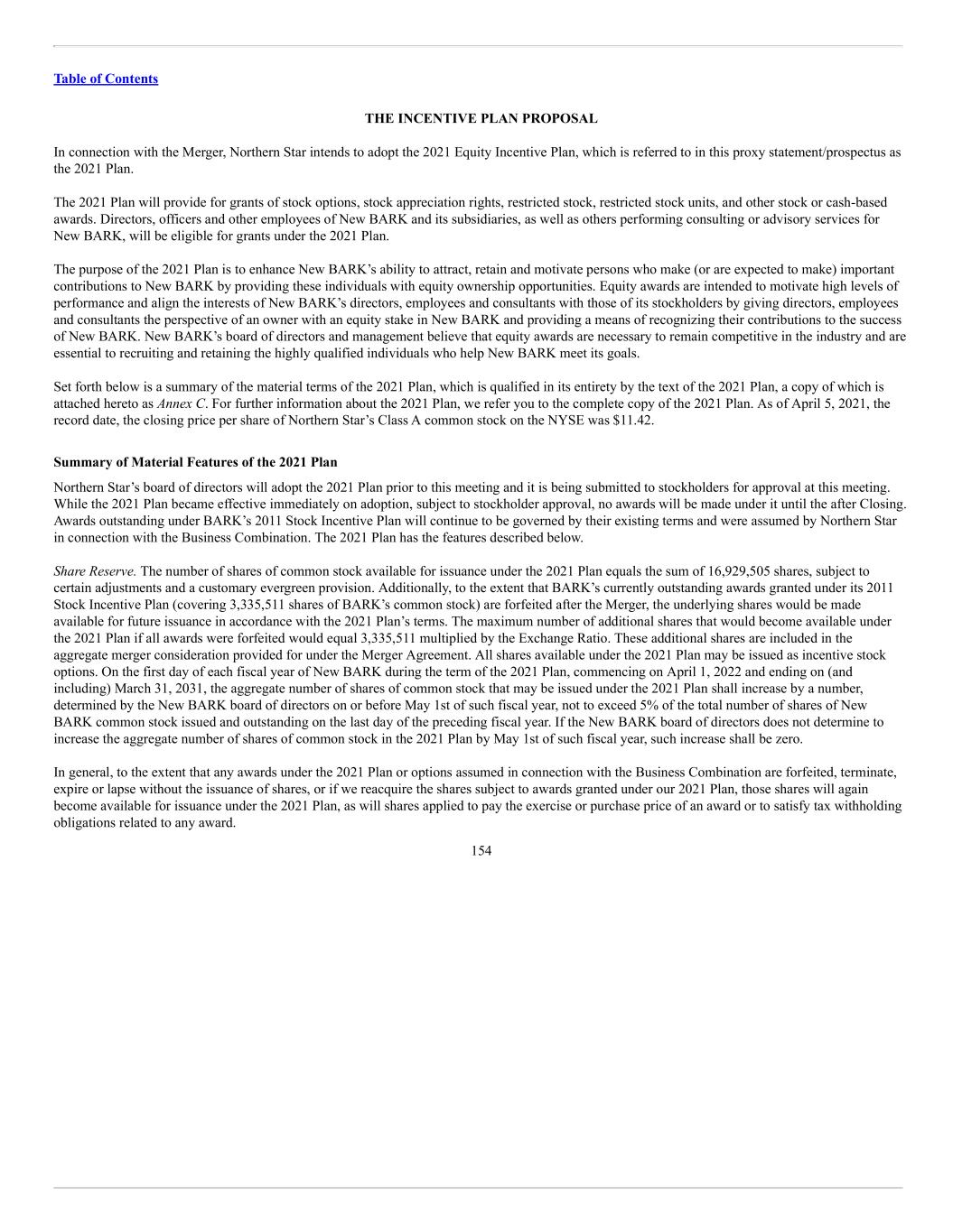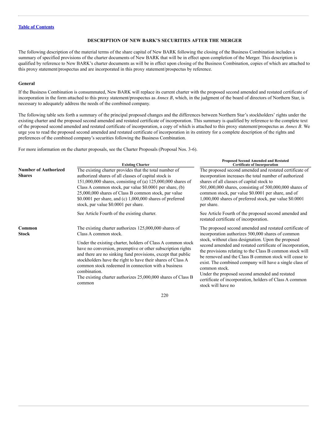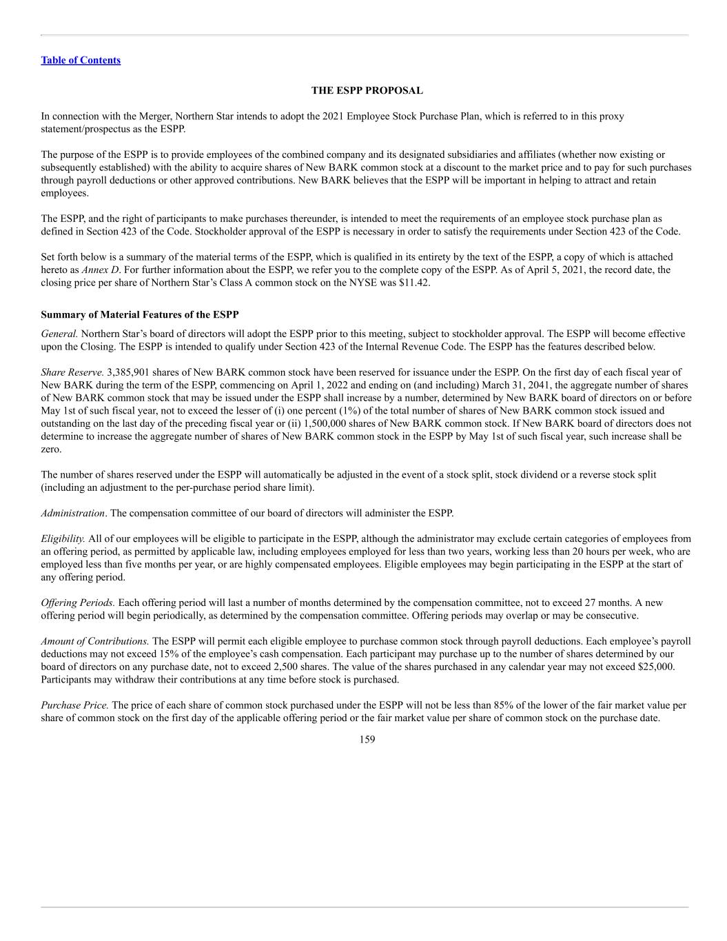 Table of Contents   Northern Star’s current Class B common stock (the shares of which will all convert into shares of Class A common stock in connection with the Business Combination) so that the Class B common stock will cease to exist and Northern Star will have a single class of common stock (Proposal No. 4);     (iii) add supermajority voting provisions requiring the affirmative vote of the holders of 66 2/3% of the voting power of all of the then outstanding shares of the capital stock of New BARK to amend certain provisions of the second amended and restated certificate of incorporation, to adopt, amend or repeal any provision of the bylaws, or to remove any director, or the entire Board of Directors (Proposal No. 5); and     (iv) remove the various provisions applicable only to special purpose acquisition corporations (such as the obligation to dissolve and liquidate if a business combination is not consummated within a certain period of time) and make certain other changes that the Northern Star board deems appropriate for a public operating company (Proposal No. 6). A copy of Northern Star’s proposed second amended and restated certificate of incorporation effectuating the foregoing amendments is attached to this proxy statement/prospectus as Annex B. You are encouraged to read the second amended and restated certificate of incorporation in its entirety. See the section entitled “The Charter Proposals.” The Director Election Proposal (Proposal No. 7) The stockholders of Northern Star will vote to elect seven directors who, upon the closing of the Business Combination, will be the directors of Northern Star. If the nominees identified in this proxy statement/prospectus are elected, Jon Ledecky, Henrik Werdelin and Betsy McLaughlin will be Class A directors serving until Northern Star’s 2022 annual meeting of stockholders; Joanna Coles and Matt Meeker will be Class B directors serving until Northern Star’s 2023 annual meeting of stockholders; and Manish Joneja and Jim McGinty, will be Class C directors serving until Northern Star’s 2024 annual meeting of stockholders, and in each case, until their successors are elected and qualified. See the section entitled “The Director Election Proposal.” The Incentive Plan Proposal (Proposal No. 8) The stockholders of Northern Star will vote on a proposal to approve the 2021 Plan. The 2021 Plan will initially reserve up to 16,929,505 shares of New BARK common stock, subject to certain adjustments and a customary evergreen provision. Additionally, to the extent that BARK’s currently outstanding awards granted under its 2011 Stock Incentive Plan (covering 3,335,511 shares of BARK’s common stock) are forfeited after the Merger, the underlying shares would be made available for future issuance in accordance with the 2021 Plan’s terms. The maximum number of additional shares that would become available under the 2021 Plan if all awards were forfeited would equal 3,335,511 multiplied by the Exchange Ratio. These additional shares are included in the aggregate merger consideration provided for under the Merger Agreement. The purpose of the 2021 Plan is to provide New BARK’s and its subsidiaries’ officers, directors, employees and consultants who, by their position, ability and diligence are able to make important contributions to New BARK’s growth and profitability, with an incentive to assist New BARK in achieving its long-term corporate objectives, to attract and retain directors, executive officers and other employees of outstanding competence, to provide such persons with an opportunity to acquire an equity interest in New BARK and to further align the interests of such persons with the interests of New BARK’s stockholders. The 2021 Plan is attached to this proxy statement/prospectus as Annex C. You are encouraged to read the proposed 2021 Plan in its entirety. See the section entitled “The Incentive Plan Proposal.” The ESPP Proposal (Proposal No. 9) The stockholders of Northern Star will vote on a proposal to approve the ESPP. The ESPP will initially reserve up to 3,385,901 shares of New BARK common stock for future issuance in accordance with the ESPP’s terms, subject to certain adjustments and a customary evergreen provision. The purpose of the ESPP is to provide employees of the combined company and its designated subsidiaries and affiliates (whether now existing or   19