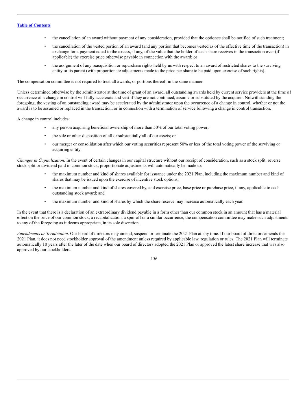 1/31/23, 9:14 AM EX-3.1 https://www.sec.gov/Archives/edgar/data/1819574/000119312521196533/d39269dex31.htm 3/8 2. the number of shares of the series, which number the Board may thereafter increase or decrease (but not below the number of shares thereof then outstanding) without any vote of stockholders (except as otherwise expressly required by this Certificate of Incorporation); 3. the amounts or rates at which dividends will be payable on, and the preferences, if any, of shares of the series in respect of dividends, and whether such dividends, if any, shall be cumulative or noncumulative; 4. the dates on which dividends, if any, shall be payable; 5. the redemption rights and price or prices, if any, for shares of the series; 6. the terms and amount of any sinking fund, if any, provided for the purchase or redemption of shares of the series; 7. the amounts payable on, and the preferences, if any, of shares of the series in the event of any voluntary or involuntary liquidation, dissolution or winding up of the affairs of the Corporation; 8. whether the shares of the series shall be convertible into or exchangeable for, shares of any other class or series, or any other security, of the Corporation or any other corporation, and, if so, the specification of such other class or series or such other security, the conversion or exchange price or prices or rate or rates, any adjustments thereof, the date or dates at which such shares shall be convertible or exchangeable and all other terms and conditions upon which such conversion or exchange may be made; 9. restrictions on the issuance or reissuance of shares of the same series or any other class or series; 10. the voting rights, if any, of the holders of shares of the series generally or upon specified events; and 11. any other powers, preferences and relative, participating, optional or other special rights, and the qualifications, limitations or restrictions thereof, of each series of Preferred Stock, all as may be determined from time to time by the Board and stated in the resolution or resolutions providing for the issuance of such Preferred Stock. Without limiting the generality of the foregoing, subject to the rights of one or more series of Preferred Stock then outstanding, the resolutions providing for issuance of any series of Preferred Stock may provide that such series shall be superior or rank equally or be junior to any other series of Preferred Stock to the extent permitted by law. FIFTH: This Article FIFTH is inserted for the management of the business and for the conduct of the affairs of the Corporation. A. General Powers. The business and affairs of the Corporation shall be managed by or under the direction of the Board, except as otherwise provided by this Certificate of Incorporation (including any certificate of designation relating to any series of Preferred Stock) or the DGCL. B. Number of Directors; Election of Directors. Subject to the rights of holders of any series of Preferred Stock to elect directors, the number of directors of the Corporation shall exclusively be fixed from time to time by resolution of the majority of the Whole Board. For purposes of this Certificate of Incorporation, the term “Whole Board” will mean the total number of authorized directors, whether or not there exist any vacancies in previously authorized directorships. No decrease in the number of directors constituting the Board shall shorten the term of any incumbent director. B-3