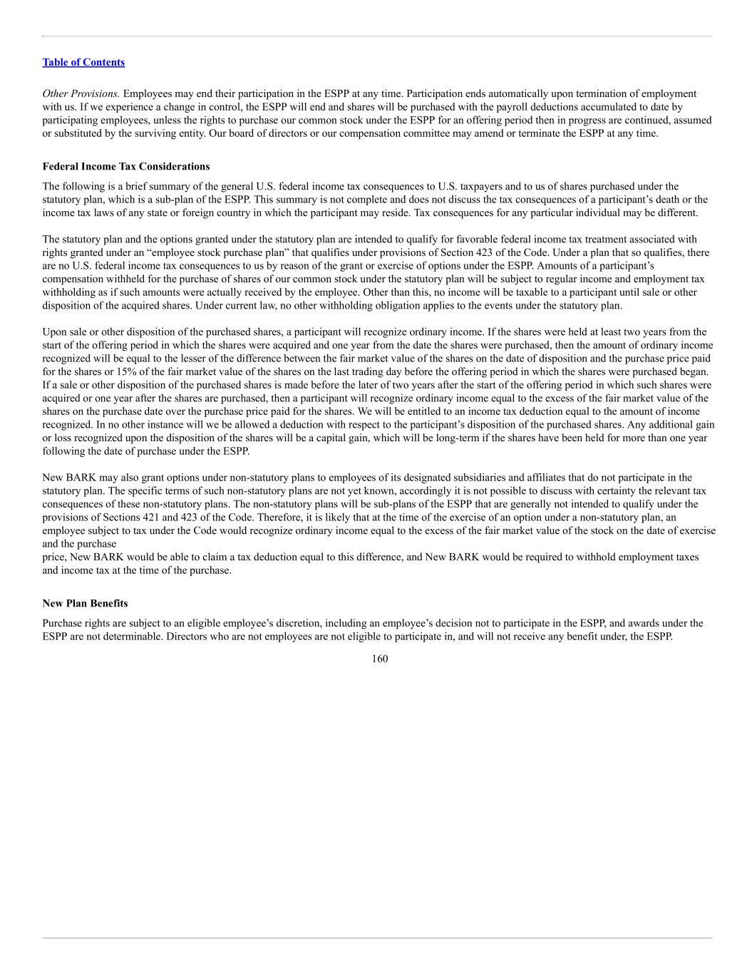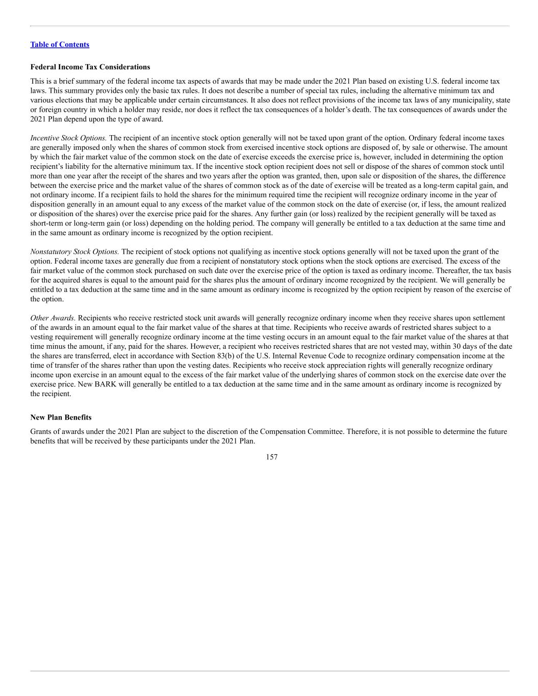 Table of Contents attempt to impose additional or new regulation on BARK’s business or levy additional or new sales, income or other taxes relating to our activities. Tax authorities at the international, federal, state and local levels are currently reviewing the appropriate treatment of companies engaged in e-commerce. New or revised international, federal, state or local tax regulations may subject BARK or its subscribers and customers to additional sales, income and other taxes. New or revised taxes and, in particular, sales taxes, value-added taxes and similar taxes are likely to increase costs to its subscribers and customers and increase the cost of doing business online (including the cost of compliance processes necessary to capture data and collect and remit taxes), and such taxes may decrease the attractiveness of purchasing products over the Internet. Any of these events could materially adversely affect BARK’s business, financial condition and operating results. BARK may experience fluctuations in its tax obligations and effective tax rate, which could materially and adversely affect its results of operations. BARK is subject to U.S. federal and state income taxes. Tax laws, regulations and administrative practices in various jurisdictions may be subject to significant change, with or without advance notice, due to economic, political and other conditions, and significant judgment is required in evaluating and estimating BARK’s provision and accruals for these taxes. There are many transactions that occur during the ordinary course of business for which the ultimate tax determination is uncertain. its effective tax rates could be affected by numerous factors, such as changes in tax, accounting and other laws, regulations, administrative practices, principles and interpretations, the mix and level of earnings in a given taxing jurisdiction or its ownership or capital structures. Further, the U.S. federal income tax legislation enacted in Public Law No. 115-97 (the “Tax Cuts and Jobs Act”) is highly complex, subject to interpretation, and contains significant changes to U.S. tax law, including, but not limited to, a reduction in the corporate tax rate, significant additional limitations on the deductibility of interest, substantial revisions to the taxation of international operations, and limitations on the use of net operating losses generated in tax years beginning after December 31, 2017. The presentation of its financial condition and results of operations is based upon BARK’s current interpretation of the provisions contained in the Tax Cuts and Jobs Act. In the future, the Treasury Department and the U.S. Internal Revenue Service (“IRS”) are expected to release regulations and interpretive guidance relating to the legislation contained in the Tax Cuts and Jobs Act. Any significant variance of BARK’s current interpretation of such legislation from any future regulations or interpretive guidance could result in a change to the presentation of its financial condition and results of operations and could materially and adversely affect its business, financial condition, and results of operations. BARK’s ability to utilize net operating loss carryforwards may be subject to certain limitations. BARK’s ability to use its federal and state net operating losses to offset potential future taxable income and related income taxes that would otherwise be due is dependent upon its generation of future taxable income before the expiration dates of the net operating losses, and BARK cannot predict with certainty when, or whether, BARK will generate sufficient taxable income to use all of its net operating losses. In addition, Section 382 of the Internal Revenue Code of 1986, as amended (the “Code”), contains rules that impose an annual limitation on the ability of a company with net operating loss carryforwards that undergoes an ownership change, which is generally any change in ownership of more than 50% of its stock (by value) over a three- year period, to utilize its net operating loss carryforwards in years after the ownership change. These rules generally operate by focusing on ownership changes among holders owning directly or indirectly 5% or more of the shares of stock of a company or any change in ownership arising from a new issuance of shares of stock by such company. If a company’s income in any year is less than the annual limitation prescribed by Section 382 of the Code, the unused portion of such limitation amount may be carried forward to increase the limitation (and net operating loss carryforward utilization) in subsequent tax years. BARK has experienced a prior ownership change that will result in an annual limitation under Section 382 of the Code, but BARK does not expect such limitation to have a material adverse effect on its ability to utilize net operating losses. In addition, if BARK were to undergo a further ownership change as a result of future   63