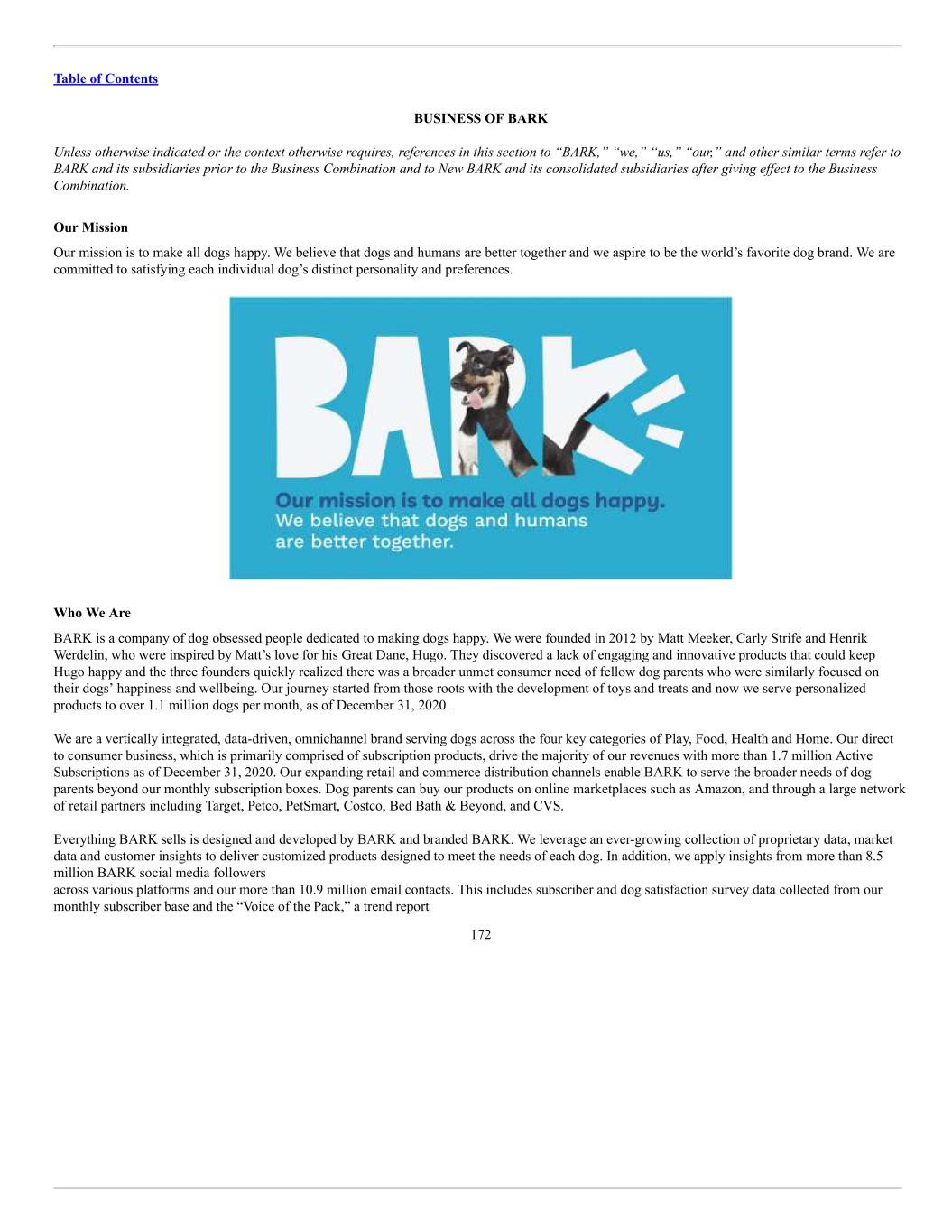 Table of Contents The mailing address of Merger Sub’s principal executive office is c/o Graubard Miller, The Chrysler Building, 405 Lexington Avenue, 11th Floor, New York, NY 10174, and its telephone number is (212) 818-8800. As a result of the consummation of the Merger, Merger Sub will cease to exist. BARK BARK is a company of dog obsessed people dedicated to making dogs happy. BARK is a vertically integrated, data driven, omnichannel brand serving dogs across the four key categories of Play, Food, Health, and Home. BARK’s dog-obsessed team applies its unique, data-driven understanding of what makes each dog special to design playstyle-specific toys, delicious and satisfying treats, food, and wellness supplements, and best in class offerings that foster the health and happiness of dogs. Founded in 2012, BARK loyally serves dogs nationwide with monthly subscription offerings, BarkBox and Super Chewer; a personalized meal delivery service for dogs, BARK Eats; custom collections through online marketplaces and via brick and mortar retail partners, including Target and Amazon; wellness products that meet dogs’ needs with BARK Bright through monthly subscriptions; BARK’S ATB platform; and individually on its website BarkShop.com. The mailing address of BARK’s principal executive office is 221 Canal Street, Floor 6, New York, New York 10013, and its telephone number is 1- 855-501-BARK (1-855-501-2275). After the consummation of the Business Combination, BARK will be a wholly owned subsidiary of New BARK. This proxy statement/prospectus includes certain registered trademarks, including trademarks that are the property of BARK and its affiliates. This proxy statement/prospectus also includes other trademarks, service marks and trade names owned by BARK or other companies. All trademarks, service marks and traded names included herein are the property of their respective owners. Emerging Growth Company Northern Star is an “emerging growth company,” as defined under the JOBS Act. As an emerging growth company, Northern Star is eligible to take advantage of certain exemptions from various reporting requirements that are applicable to other public companies that are not emerging growth companies. These include, but are not limited to, not being required to comply with the auditor attestation requirements of Section 404 of the Sarbanes-Oxley Act of 2002, reduced disclosure obligations regarding executive compensation in its periodic reports and proxy statements, and exemptions from the requirements of holding a nonbinding advisory vote on executive compensation and the requirement to obtain stockholder approval of any golden parachute payments not previously approved. In addition, Section 107 of the JOBS Act provides that an emerging growth company can take advantage of an extended transition period provided in Section 7(a)(2)(B) of the Securities Act for complying with new or revised accounting standards. Northern Star has elected to take advantage of such extended transition period. Northern Star will remain an emerging growth company until the earlier of (1) December 31, 2025 (the last day of the fiscal year following the fifth anniversary of the consummation of Northern Star’s initial public offering), (2) the last day of the fiscal year in which Northern Star has total annual gross revenue of at least $1.07 billion, (3) the last day of the fiscal year in which Northern Star is deemed to be a “large accelerated filer,” as defined in the Exchange Act, and (4) the date on which Northern Star has issued more than $1.0 billion in nonconvertible debt during the prior three-year period. The Business Combination Proposal (Proposal No. 1) The stockholders of Northern Star will vote on a proposal to approve and adopt the Merger Agreement and the Business Combination, including the Merger of Merger Sub with and into BARK, with BARK surviving as a   16