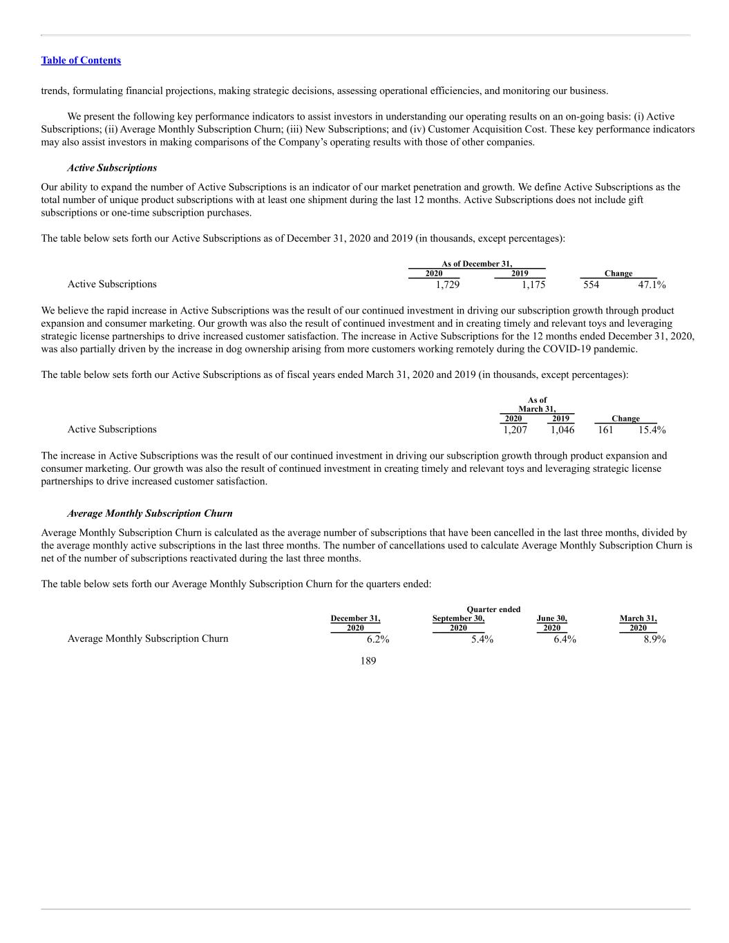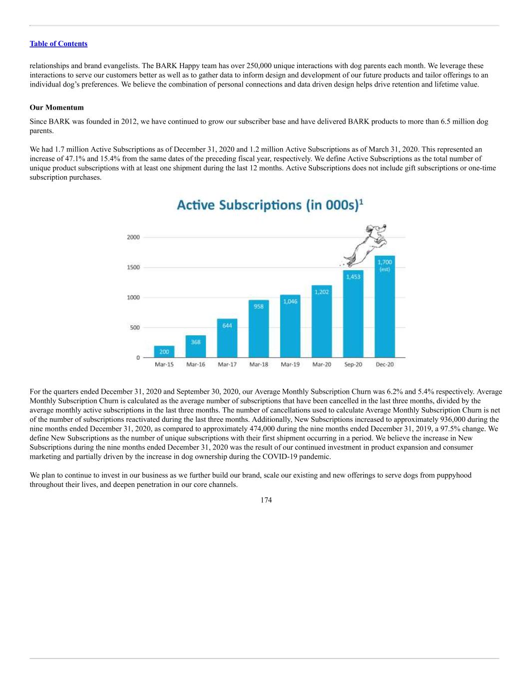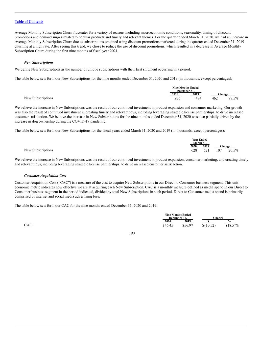 Table of Contents   •   global economic conditions;     •   the duration, extent, and effects of the COVID-19 pandemic; and     •   political, economic and social instability, including terrorist activities, and any disruption these events may cause to the global economy. The impact of one or more of the foregoing and other factors may cause its results of operations to vary significantly. As such, BARK believes that quarter-to-quarter comparisons of its results of operations may not be meaningful and should not be relied upon as an indication of future performance. BARK has experienced significant revenue growth in recent periods, including increased subscriptions during the COVID-19 pandemic. This rate of growth may not be sustainable or indicative of its future rate of growth. BARK has experienced significant growth in recent periods. For example, BARK’s revenues increased from $161.7 million in the nine months ended December 31, 2019 to $266.4 million in the nine months ended December 31, 2020, an increase of approximately 64.8%. BARK believes that its continued growth in revenue will depend upon, among other factors, BARK’s ability to:     •   acquire new subscribers who purchase subscriptions from BARK at the same or better rates as its existing subscriber base;     •   retain its subscribers and have them continue to purchase subscription-based products from BARK at the same or better rates;     •   increase the amount or categories of products subscribers purchase from BARK, such as through its Add-to-Box, or ATB, offerings;     •   attract new suppliers to provide quality products that BARK can offer to its subscribers and customers at attractive prices;     •   retain its existing suppliers and have them provide additional quality products that BARK can offer to its subscribers and customers at attractive prices;     •   expand its product offerings, including the launch of new brands, including BARK Eats, and expansion into new offerings;     •   increase the awareness of its brand;     •   provide dogs and dog parents with a superior experience;     •   develop new features to enhance the consumer experience;     •   respond to changes in consumer access to and use of the Internet and mobile devices;     •   react to challenges from existing and new competitors;     •   develop a scalable, high-performance technology and fulfillment infrastructure that can efficiently and reliably handle increased demand, as well as the deployment of new features and the sale of new products and services;     •   fulfill and deliver orders in a timely manner and in accordance with subscriber and customer expectations, which may change over time;     •   respond to macroeconomic trends and their impact on consumer spending patterns;     •   hire, integrate and retain talented personnel;     •   invest in the infrastructure underlying its website and other operational systems; and     •   BARK’s ability to expand to and successfully operate in international markets in the future.     41