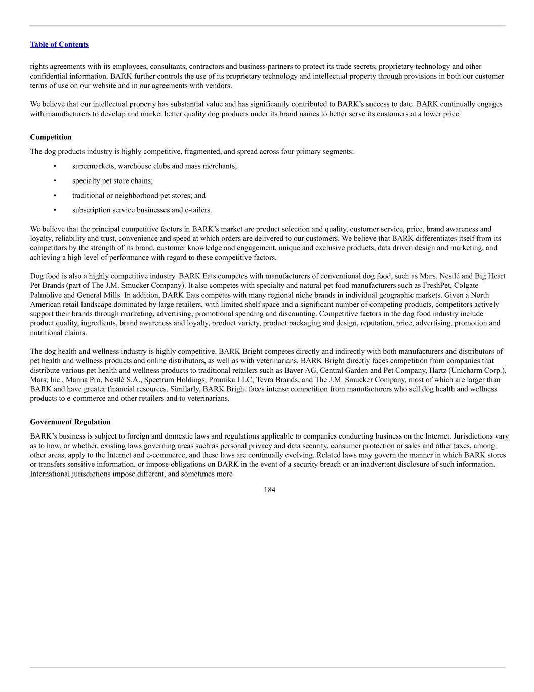 Table of Contents Many of BARK’s current competitors have, and potential competitors may have, longer operating histories, greater brand recognition, larger fulfillment infrastructures, greater technical capabilities, significantly greater financial, marketing and other resources and larger customer bases than BARK does. These factors may allow BARK’s competitors to derive greater net sales and profits from their existing customer base, acquire customers at lower costs or respond more quickly than BARK can to new or emerging technologies and changes in consumer preferences or habits. These competitors may engage in more extensive research and development efforts, undertake more far-reaching marketing campaigns and adopt more aggressive pricing policies (including but not limited to predatory pricing policies and the provision of substantial discounts), which may allow them to build larger customer bases or generate net sales from their customer bases more effectively than BARK does. Current and future competitors may also make strategic acquisitions or establish cooperative relationships among themselves or with others. By doing so, these competitors may increase their ability to meet the needs of BARK’s current or potential subscribers and customers and adversely affect BARK’s business, financial condition, and results of operations. If changes in consumer preferences decrease the competitive advantage attributable to these factors, or if BARK fails to otherwise positively differentiate BARK’s product offering or subscriber or customer experience from its competitors, its business, financial condition, and results of operations could be materially and adversely affected. As BARK expands its offerings, such as its BARK Eats line, BARK will face additional competition. For example, in the dog food category, there are numerous brands and products that compete for shelf space and sales, with competition based primarily upon brand recognition and loyalty, product packaging, quality and innovation, taste, nutrition, breadth of product line, price and convenience. Competitors in new markets may have broader product lines, substantially greater financial and other resources and/or lower fixed costs than BARK. BARK may not compete successfully with these other companies or maintain or grow the distribution of its new products. In order to effectively compete in the future, BARK may be required to offer promotions and other incentives, which may result in lower operating margins and in turn adversely affect its results of operations. BARK also faces a significant challenge from its competitors forming alliances with each other. These relationships may enable both their retail and online stores to negotiate better pricing and better terms from suppliers by aggregating the demand for products and negotiating volume discounts, which could be a competitive disadvantage to us. BARK expects competition in the dog products and services retail industry, in particular Internet-based competition, generally to continue to increase. If BARK fails to compete successfully, its business, financial condition, and results of operations could be materially and adversely affected. As part of BARK’s strategy, BARK seeks to obtain licenses enabling BARK to develop and market products based on popular entertainment, sports, and other branded properties owned by third parties. If products developed based on these licenses are not successful or BARK is unable to maintain, renew and extend solid relationships with its key partners its business, financial condition, and results of operations may be adversely affected. BARK currently has in-licenses to several entertainment properties, including SCOOB!, HOME ALONE and PEANUTS, as well as certain sports and other well-known branded properties. These licenses typically have multi-year terms and provide BARK with the right to market and sell designated classes of products. If BARK fails to meet its contractual commitments and/or any of these licenses were to terminate and not be maintained, renewed or extended, or the popularity of any of these licensed properties was to significantly decline, its business would be damaged and BARK would need to successfully develop and market other products to replace the products previously offered under license.     48