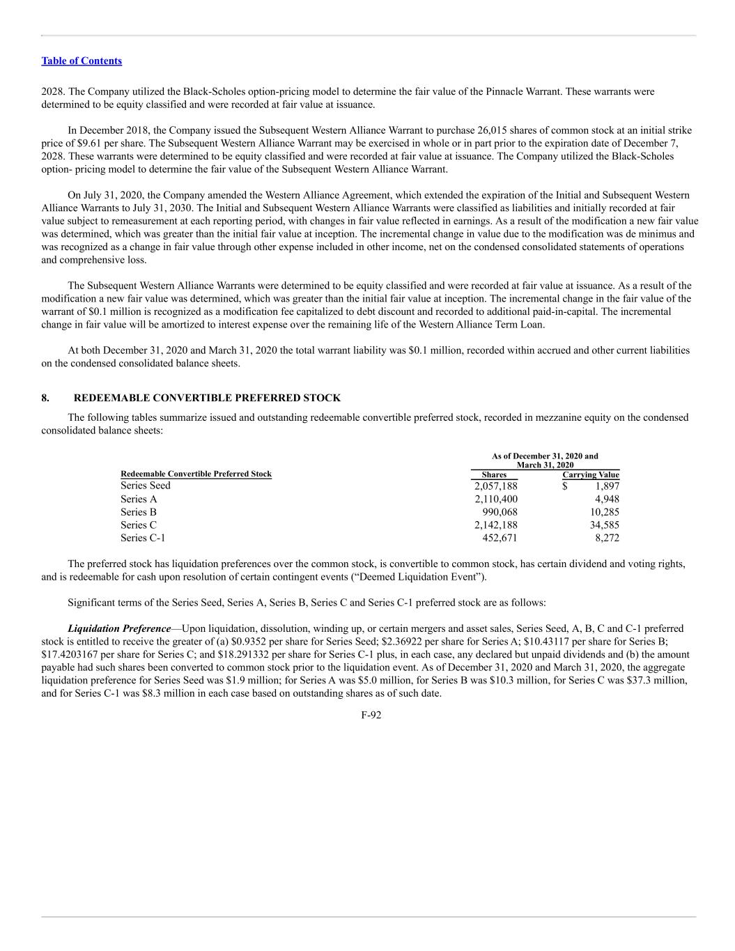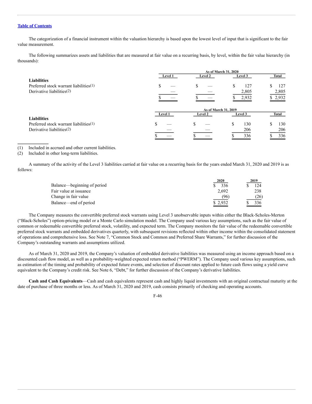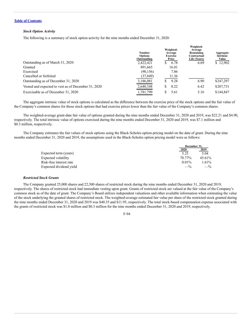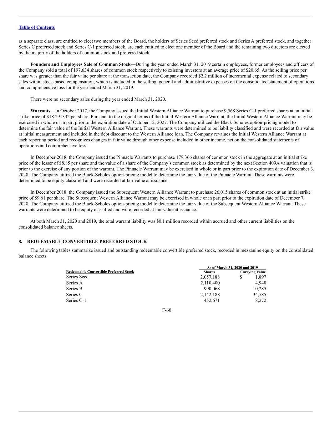 Table of Contents      As of December 31,     As of March 31,        2020      2020      2019   Consolidated Balance Sheet Data:          Cash    $ 51,896     $ 9,676    $ 11,341 Total assets      151,865       64,689      46,545 Total liabilities      246,693       140,089      92,550 Total redeemable convertible preferred stock      59,987       59,987      59,987 Total stockholders’ deficit      (154,815)      (135,387)      (105,992)    34