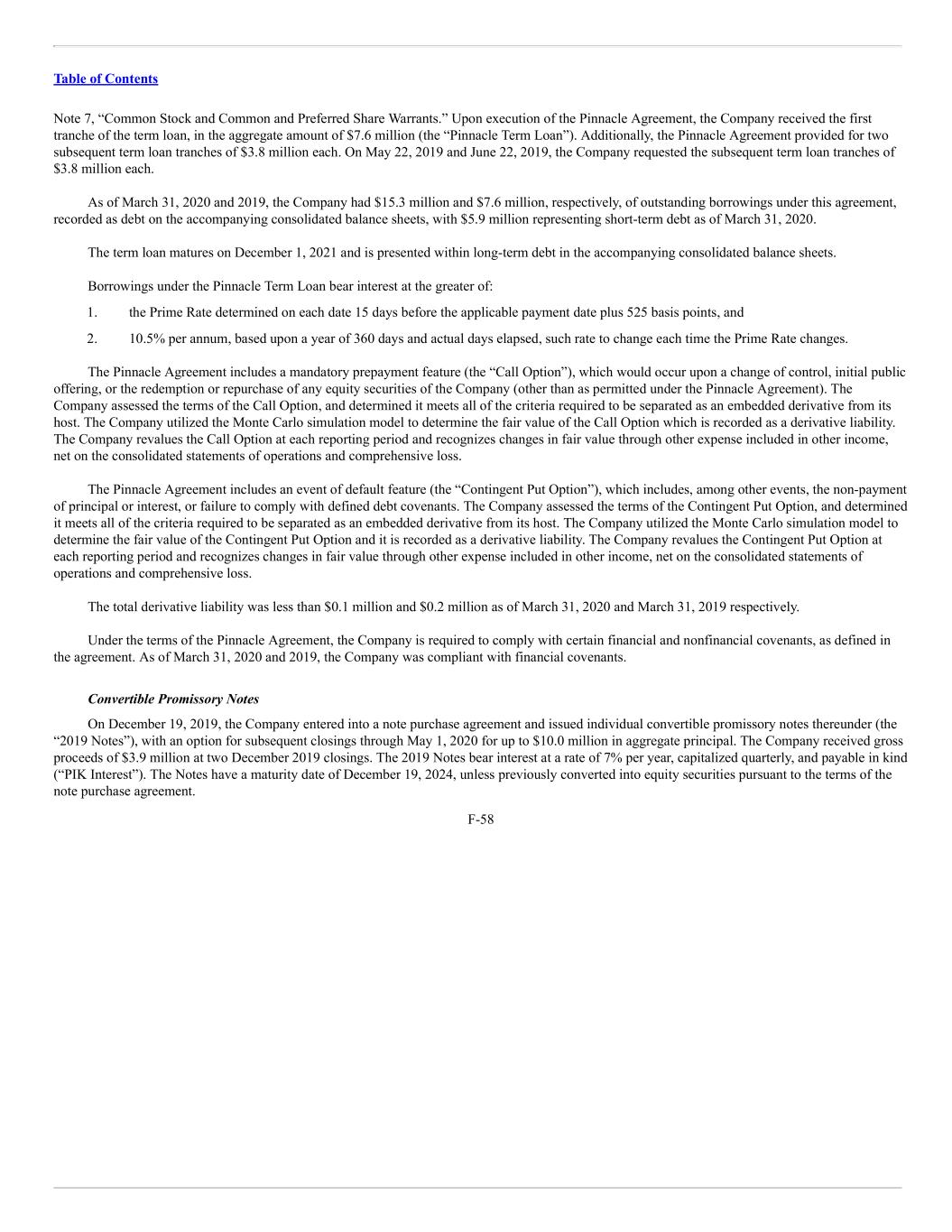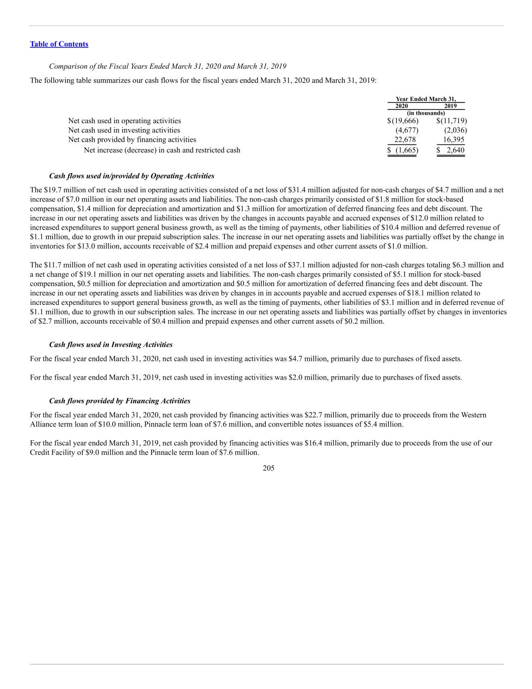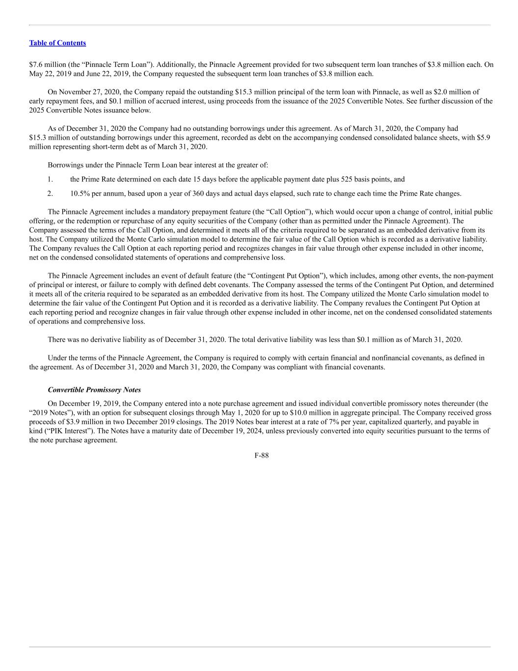 Table of Contents      As of December 31,     As of March 31,        2020      2020      2019   Consolidated Balance Sheet Data:          Cash    $ 51,896     $ 9,676    $ 11,341 Total assets      151,865       64,689      46,545 Total liabilities      246,693       140,089      92,550 Total redeemable convertible preferred stock      59,987       59,987      59,987 Total stockholders’ deficit      (154,815)      (135,387)      (105,992)    34