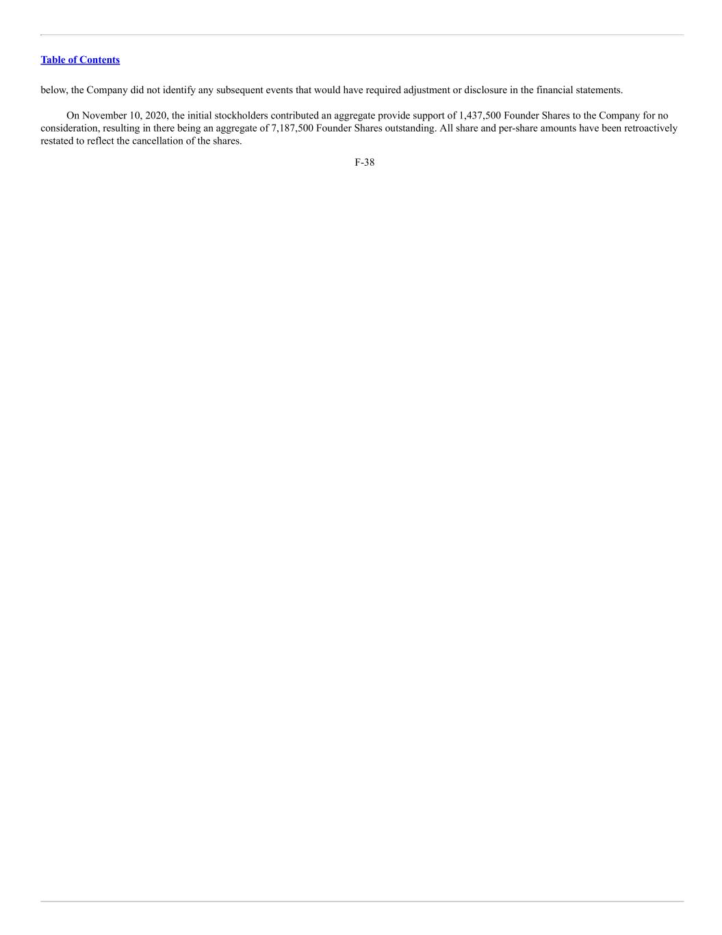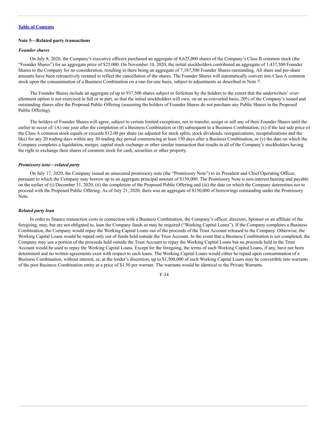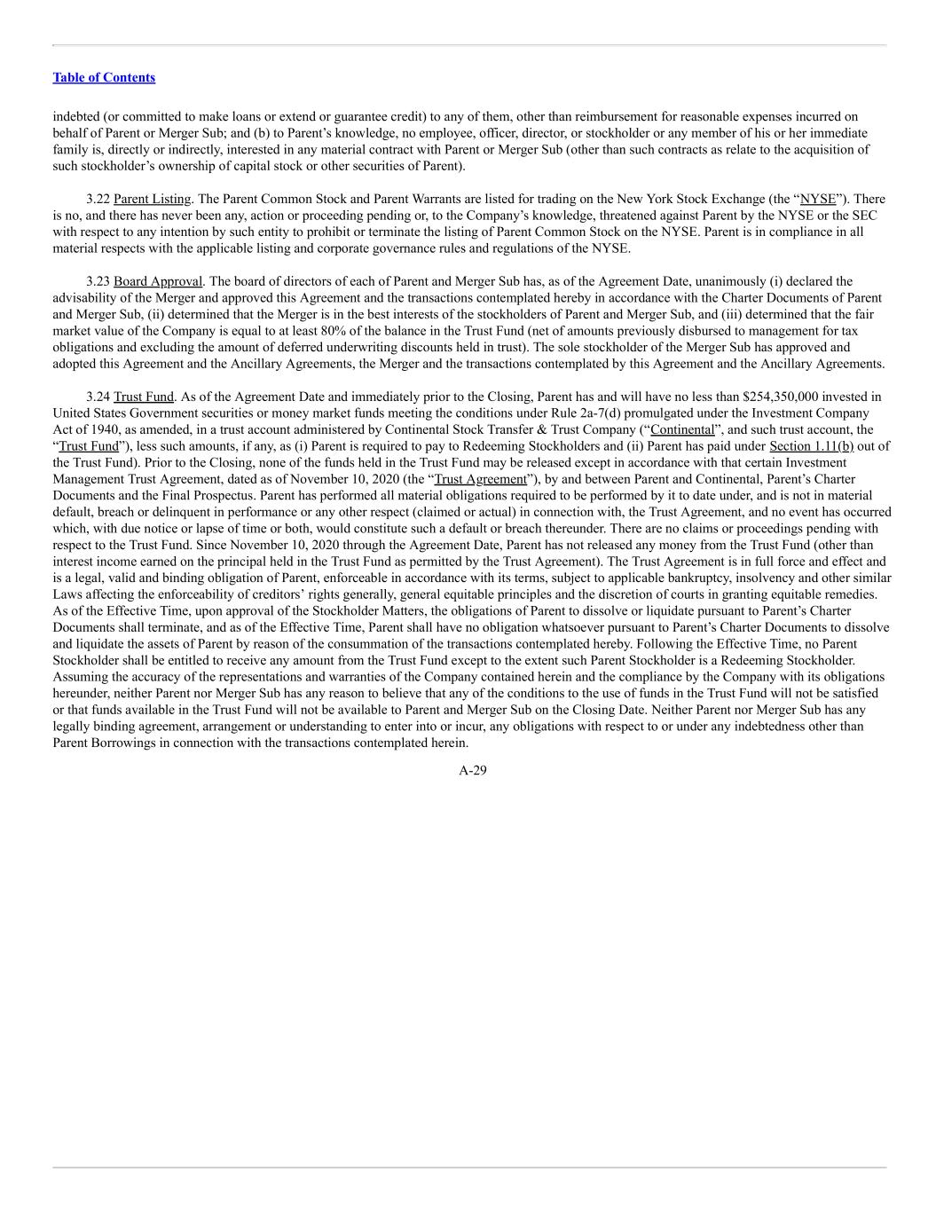 Table of Contents indebted (or committed to make loans or extend or guarantee credit) to any of them, other than reimbursement for reasonable expenses incurred on behalf of Parent or Merger Sub; and (b) to Parent’s knowledge, no employee, officer, director, or stockholder or any member of his or her immediate family is, directly or indirectly, interested in any material contract with Parent or Merger Sub (other than such contracts as relate to the acquisition of such stockholder’s ownership of capital stock or other securities of Parent). 3.22 Parent Listing. The Parent Common Stock and Parent Warrants are listed for trading on the New York Stock Exchange (the “NYSE”). There is no, and there has never been any, action or proceeding pending or, to the Company’s knowledge, threatened against Parent by the NYSE or the SEC with respect to any intention by such entity to prohibit or terminate the listing of Parent Common Stock on the NYSE. Parent is in compliance in all material respects with the applicable listing and corporate governance rules and regulations of the NYSE. 3.23 Board Approval. The board of directors of each of Parent and Merger Sub has, as of the Agreement Date, unanimously (i) declared the advisability of the Merger and approved this Agreement and the transactions contemplated hereby in accordance with the Charter Documents of Parent and Merger Sub, (ii) determined that the Merger is in the best interests of the stockholders of Parent and Merger Sub, and (iii) determined that the fair market value of the Company is equal to at least 80% of the balance in the Trust Fund (net of amounts previously disbursed to management for tax obligations and excluding the amount of deferred underwriting discounts held in trust). The sole stockholder of the Merger Sub has approved and adopted this Agreement and the Ancillary Agreements, the Merger and the transactions contemplated by this Agreement and the Ancillary Agreements. 3.24 Trust Fund. As of the Agreement Date and immediately prior to the Closing, Parent has and will have no less than $254,350,000 invested in United States Government securities or money market funds meeting the conditions under Rule 2a-7(d) promulgated under the Investment Company Act of 1940, as amended, in a trust account administered by Continental Stock Transfer & Trust Company (“Continental”, and such trust account, the “Trust Fund”), less such amounts, if any, as (i) Parent is required to pay to Redeeming Stockholders and (ii) Parent has paid under Section 1.11(b) out of the Trust Fund). Prior to the Closing, none of the funds held in the Trust Fund may be released except in accordance with that certain Investment Management Trust Agreement, dated as of November 10, 2020 (the “Trust Agreement”), by and between Parent and Continental, Parent’s Charter Documents and the Final Prospectus. Parent has performed all material obligations required to be performed by it to date under, and is not in material default, breach or delinquent in performance or any other respect (claimed or actual) in connection with, the Trust Agreement, and no event has occurred which, with due notice or lapse of time or both, would constitute such a default or breach thereunder. There are no claims or proceedings pending with respect to the Trust Fund. Since November 10, 2020 through the Agreement Date, Parent has not released any money from the Trust Fund (other than interest income earned on the principal held in the Trust Fund as permitted by the Trust Agreement). The Trust Agreement is in full force and effect and is a legal, valid and binding obligation of Parent, enforceable in accordance with its terms, subject to applicable bankruptcy, insolvency and other similar Laws affecting the enforceability of creditors’ rights generally, general equitable principles and the discretion of courts in granting equitable remedies. As of the Effective Time, upon approval of the Stockholder Matters, the obligations of Parent to dissolve or liquidate pursuant to Parent’s Charter Documents shall terminate, and as of the Effective Time, Parent shall have no obligation whatsoever pursuant to Parent’s Charter Documents to dissolve and liquidate the assets of Parent by reason of the consummation of the transactions contemplated hereby. Following the Effective Time, no Parent Stockholder shall be entitled to receive any amount from the Trust Fund except to the extent such Parent Stockholder is a Redeeming Stockholder. Assuming the accuracy of the representations and warranties of the Company contained herein and the compliance by the Company with its obligations hereunder, neither Parent nor Merger Sub has any reason to believe that any of the conditions to the use of funds in the Trust Fund will not be satisfied or that funds available in the Trust Fund will not be available to Parent and Merger Sub on the Closing Date. Neither Parent nor Merger Sub has any legally binding agreement, arrangement or understanding to enter into or incur, any obligations with respect to or under any indebtedness other than Parent Borrowings in connection with the transactions contemplated herein.   A-29