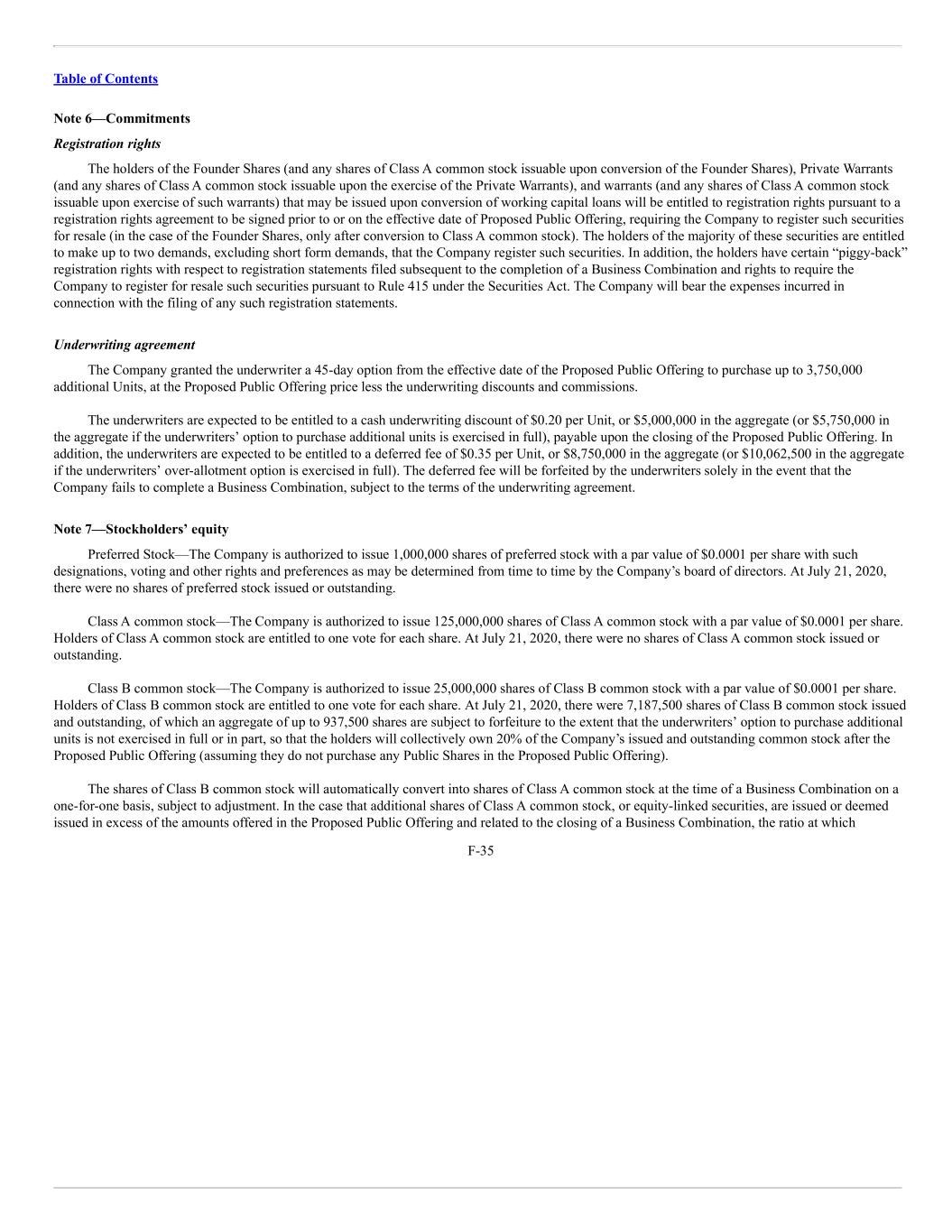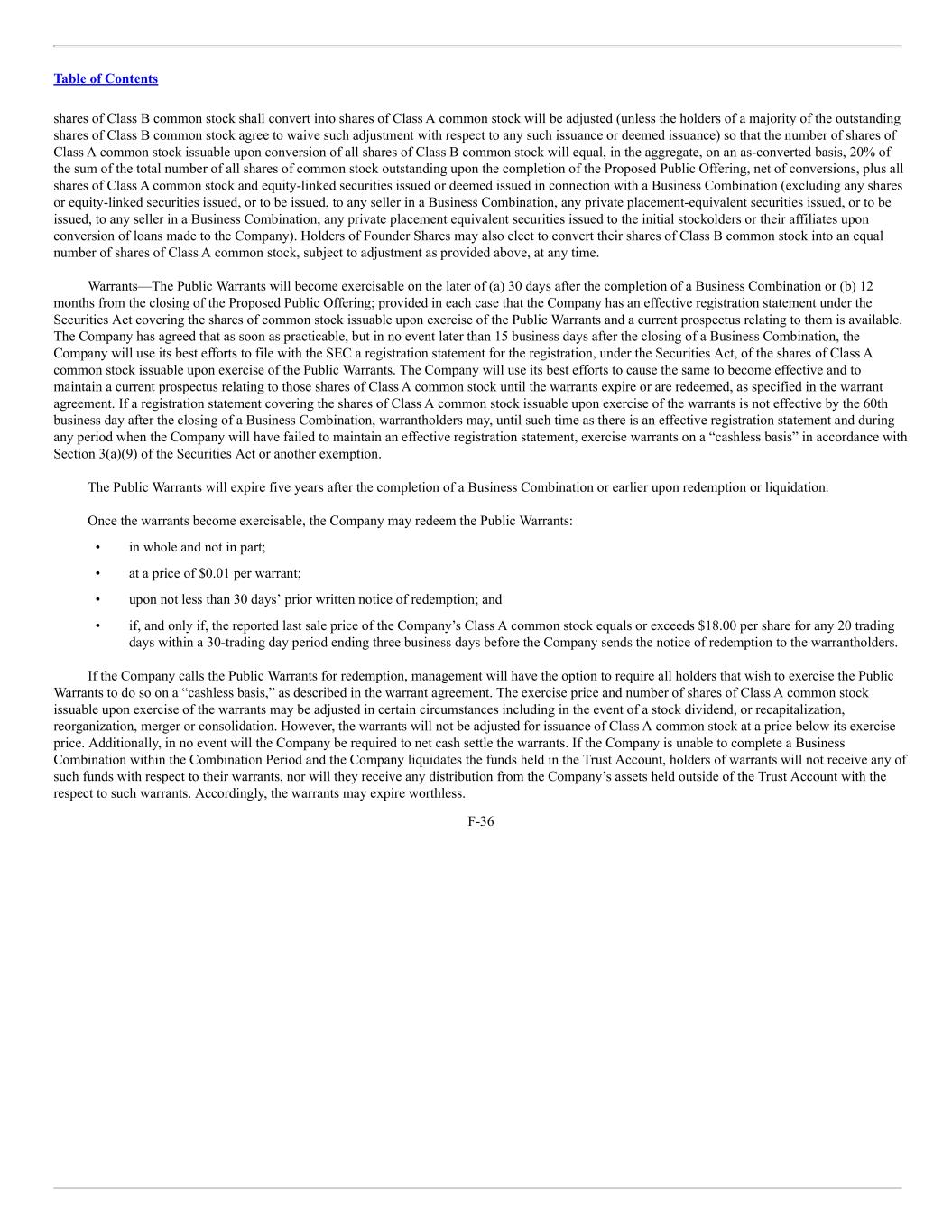 Table of Contents financial statements shall be deemed “Audited Financial Statements” for the purposes of this Agreement and the representation and warranties set forth in Section 2.7 shall be deemed to apply to such Audited Financial Statements with the same force and effect as if made as of the Agreement Date. ARTICLE VI CONDITIONS TO THE TRANSACTION 6.1 Conditions to Obligations of Each Party to Effect the Merger. The respective obligations of each party to this Agreement to effect the Merger shall be subject to the satisfaction as of the Closing Date of the following conditions, any one or more of which may be waived (if legally permitted) in writing by all of such parties: (a) Parent Stockholder Matters. The Stockholder Matters shall have been duly approved and adopted by the affirmative vote of the Parent Stockholders required under Parent’s Charter Documents and the DGCL. (b) Parent Net Tangible Assets. Parent shall have, either immediately prior to or upon the Closing, at least $5,000,001 of net tangible assets (as determined in accordance with Rule 3a51-1(g)(1) of the Exchange Act) following the exercise by holders of shares of Parent Common Stock issued in Parent’s initial public offering of securities and outstanding immediately before the Closing of their right to convert their shares into a pro rata share of the Trust Fund in accordance with Parent’s Charter Documents. (c) HSR Act; No Order. All specified waiting periods under the HSR Act shall have expired and no Governmental Entity shall have enacted, issued, promulgated, enforced or entered any statute, rule, regulation, executive order, decree, injunction or other order (whether temporary, preliminary or permanent) which is in effect and which has the effect of making the Merger illegal or otherwise prohibiting consummation of the Merger, substantially on the terms contemplated by this Agreement. (d) Proxy Statement. The Proxy Statement/Prospectus (including the Form S-4) shall have become effective in accordance with the provisions of the Securities Act, no stop order shall have been issued by the SEC which remains in effect with respect to the Proxy Statement/Prospectus, and no proceeding seeking such a stop order shall have been threatened or initiated by the SEC which remains pending. (e) Company Stockholder Approval. The Company Stockholder Approval shall have been obtained. (f) Merger Shares. The Parent Common Stock comprising the aggregate Per Share Merger Consideration to be issued pursuant to this Agreement shall have been approved for listing on the NYSE, subject only to official notice of issuance thereof and public holder requirements. (g) PIPE Investment. The PIPE Investment shall have been, or concurrently with the Closing shall be, completed. 6.2 Additional Conditions to Obligations of the Company. The obligations of the Company to consummate and effect the Merger shall be subject to the satisfaction as of the Closing Date of each of the following conditions, any of which may be waived, in writing, exclusively by the Company: (a) Representations and Warranties. Each representation and warranty of Parent and Merger Sub (i) contained in Sections 3.3(a), 3.3(b), 3.3(c), 3.3(e), 3.3(g), 3.3(h) and 3.4 shall be true and correct in all respects as of the Closing Date as though then made (except to the extent such representations and warranties expressly relate to an earlier date, and in such case, shall be true and correct on and as of such earlier date), except where the failure of such representations and warranties to be so true and correct would not, individually or in the aggregate, be reasonably expected to result in more than de minimis additional cost, expense or liability to the Company, Parent, Merger Sub or their Affiliates and (ii) contained in the other Sections of Article III shall be true and correct (without giving any effect to any limitation as to “materiality” or “Material Adverse Effect” or any similar limitation set forth therein) as of the Closing Date as though then made (except to the extent such representations and warranties expressly relate to an earlier date, and in such case, shall be true and correct on   A-44
