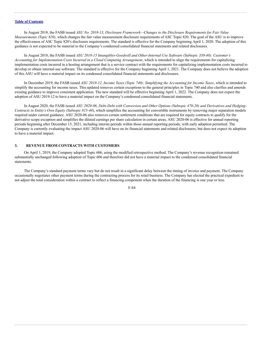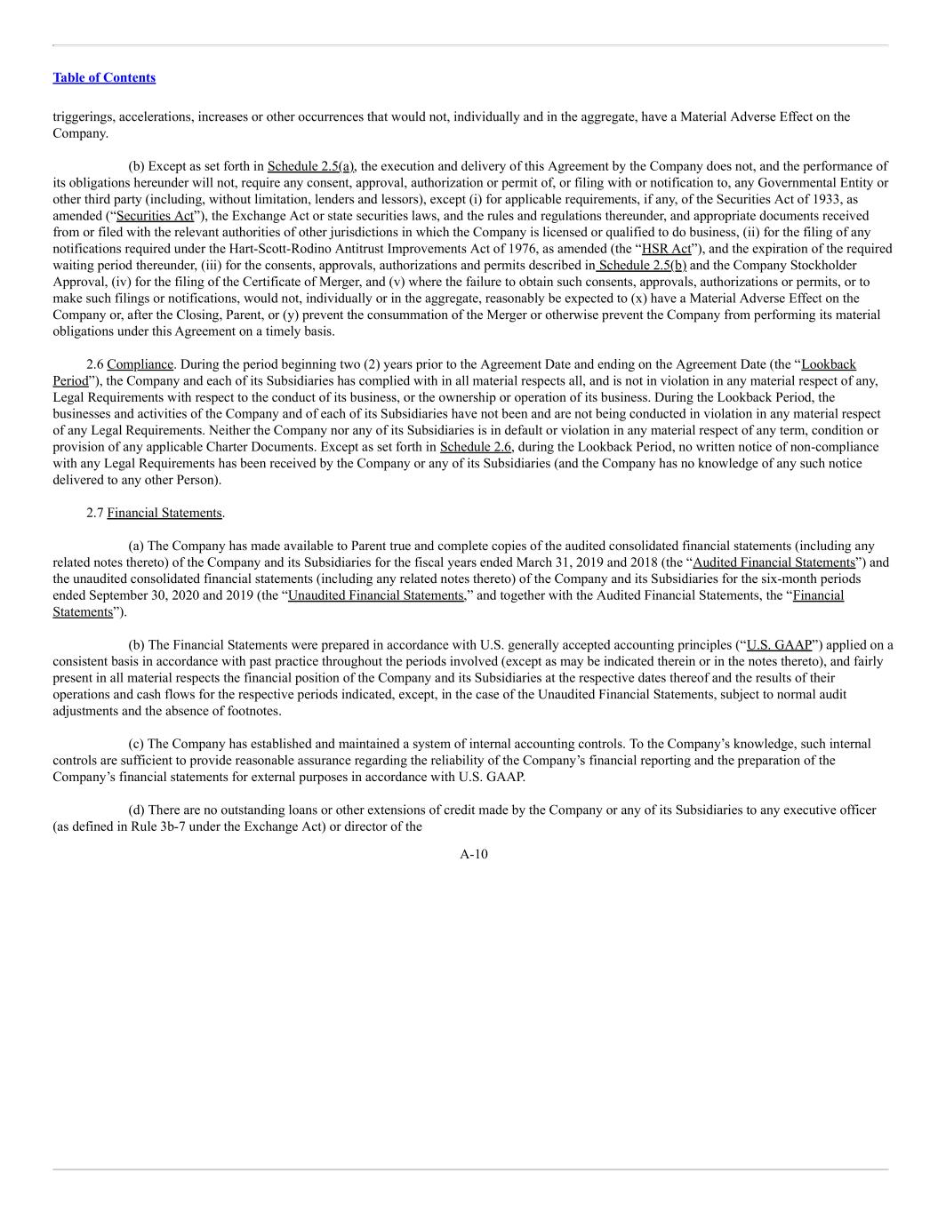 Table of Contents triggerings, accelerations, increases or other occurrences that would not, individually and in the aggregate, have a Material Adverse Effect on the Company. (b) Except as set forth in Schedule 2.5(a), the execution and delivery of this Agreement by the Company does not, and the performance of its obligations hereunder will not, require any consent, approval, authorization or permit of, or filing with or notification to, any Governmental Entity or other third party (including, without limitation, lenders and lessors), except (i) for applicable requirements, if any, of the Securities Act of 1933, as amended (“Securities Act”), the Exchange Act or state securities laws, and the rules and regulations thereunder, and appropriate documents received from or filed with the relevant authorities of other jurisdictions in which the Company is licensed or qualified to do business, (ii) for the filing of any notifications required under the Hart-Scott-Rodino Antitrust Improvements Act of 1976, as amended (the “HSR Act”), and the expiration of the required waiting period thereunder, (iii) for the consents, approvals, authorizations and permits described in Schedule 2.5(b) and the Company Stockholder Approval, (iv) for the filing of the Certificate of Merger, and (v) where the failure to obtain such consents, approvals, authorizations or permits, or to make such filings or notifications, would not, individually or in the aggregate, reasonably be expected to (x) have a Material Adverse Effect on the Company or, after the Closing, Parent, or (y) prevent the consummation of the Merger or otherwise prevent the Company from performing its material obligations under this Agreement on a timely basis. 2.6 Compliance. During the period beginning two (2) years prior to the Agreement Date and ending on the Agreement Date (the “Lookback Period”), the Company and each of its Subsidiaries has complied with in all material respects all, and is not in violation in any material respect of any, Legal Requirements with respect to the conduct of its business, or the ownership or operation of its business. During the Lookback Period, the businesses and activities of the Company and of each of its Subsidiaries have not been and are not being conducted in violation in any material respect of any Legal Requirements. Neither the Company nor any of its Subsidiaries is in default or violation in any material respect of any term, condition or provision of any applicable Charter Documents. Except as set forth in Schedule 2.6, during the Lookback Period, no written notice of non-compliance with any Legal Requirements has been received by the Company or any of its Subsidiaries (and the Company has no knowledge of any such notice delivered to any other Person). 2.7 Financial Statements. (a) The Company has made available to Parent true and complete copies of the audited consolidated financial statements (including any related notes thereto) of the Company and its Subsidiaries for the fiscal years ended March 31, 2019 and 2018 (the “Audited Financial Statements”) and the unaudited consolidated financial statements (including any related notes thereto) of the Company and its Subsidiaries for the six-month periods ended September 30, 2020 and 2019 (the “Unaudited Financial Statements,” and together with the Audited Financial Statements, the “Financial Statements”). (b) The Financial Statements were prepared in accordance with U.S. generally accepted accounting principles (“U.S. GAAP”) applied on a consistent basis in accordance with past practice throughout the periods involved (except as may be indicated therein or in the notes thereto), and fairly present in all material respects the financial position of the Company and its Subsidiaries at the respective dates thereof and the results of their operations and cash flows for the respective periods indicated, except, in the case of the Unaudited Financial Statements, subject to normal audit adjustments and the absence of footnotes. (c) The Company has established and maintained a system of internal accounting controls. To the Company’s knowledge, such internal controls are sufficient to provide reasonable assurance regarding the reliability of the Company’s financial reporting and the preparation of the Company’s financial statements for external purposes in accordance with U.S. GAAP. (d) There are no outstanding loans or other extensions of credit made by the Company or any of its Subsidiaries to any executive officer (as defined in Rule 3b-7 under the Exchange Act) or director of the   A-10