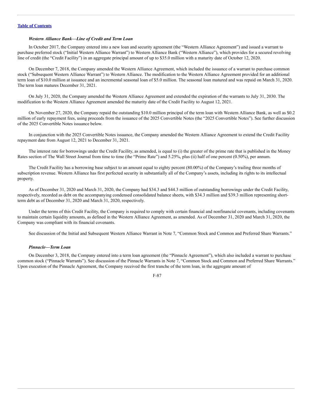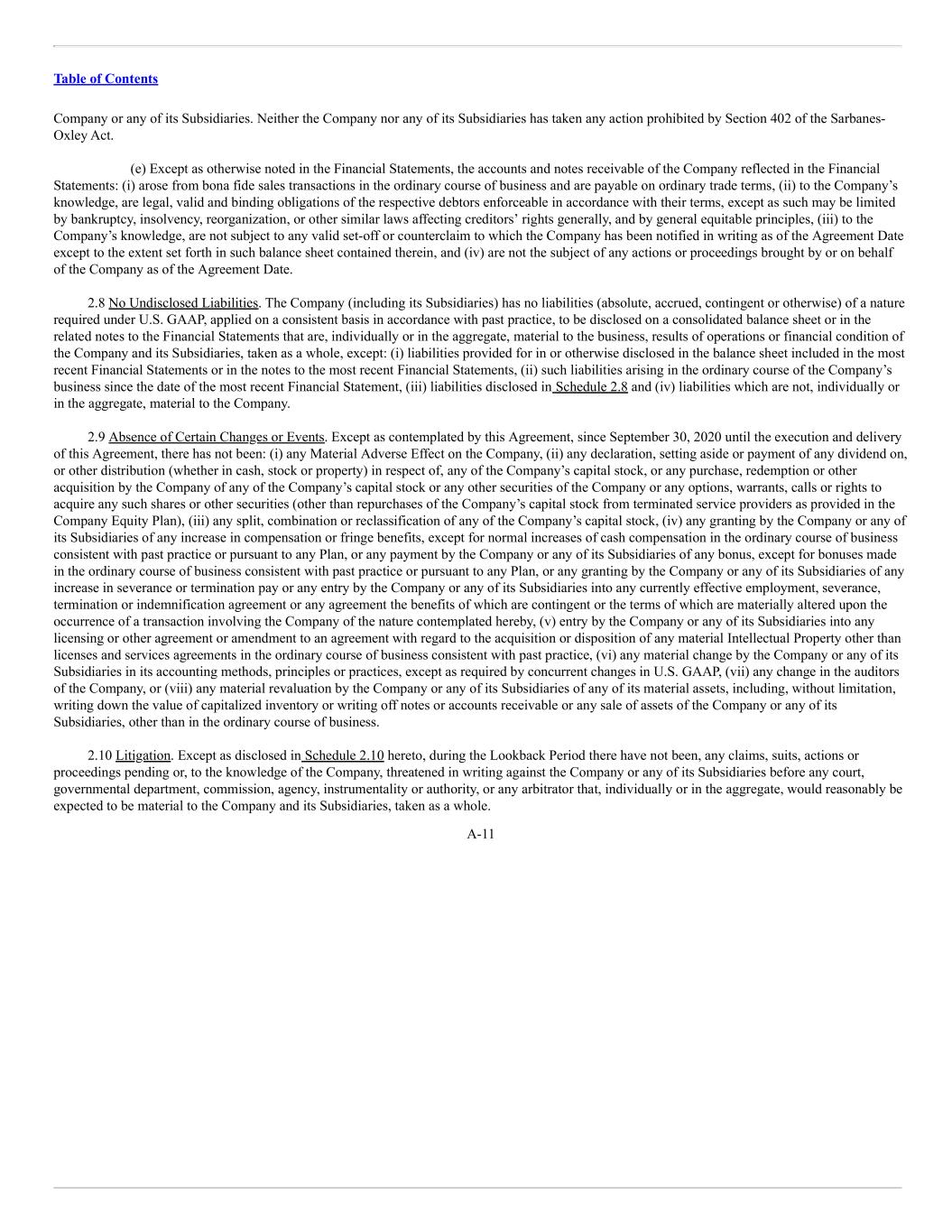 Table of Contents Company or any of its Subsidiaries. Neither the Company nor any of its Subsidiaries has taken any action prohibited by Section 402 of the Sarbanes- Oxley Act. (e) Except as otherwise noted in the Financial Statements, the accounts and notes receivable of the Company reflected in the Financial Statements: (i) arose from bona fide sales transactions in the ordinary course of business and are payable on ordinary trade terms, (ii) to the Company’s knowledge, are legal, valid and binding obligations of the respective debtors enforceable in accordance with their terms, except as such may be limited by bankruptcy, insolvency, reorganization, or other similar laws affecting creditors’ rights generally, and by general equitable principles, (iii) to the Company’s knowledge, are not subject to any valid set-off or counterclaim to which the Company has been notified in writing as of the Agreement Date except to the extent set forth in such balance sheet contained therein, and (iv) are not the subject of any actions or proceedings brought by or on behalf of the Company as of the Agreement Date. 2.8 No Undisclosed Liabilities. The Company (including its Subsidiaries) has no liabilities (absolute, accrued, contingent or otherwise) of a nature required under U.S. GAAP, applied on a consistent basis in accordance with past practice, to be disclosed on a consolidated balance sheet or in the related notes to the Financial Statements that are, individually or in the aggregate, material to the business, results of operations or financial condition of the Company and its Subsidiaries, taken as a whole, except: (i) liabilities provided for in or otherwise disclosed in the balance sheet included in the most recent Financial Statements or in the notes to the most recent Financial Statements, (ii) such liabilities arising in the ordinary course of the Company’s business since the date of the most recent Financial Statement, (iii) liabilities disclosed in Schedule 2.8 and (iv) liabilities which are not, individually or in the aggregate, material to the Company. 2.9 Absence of Certain Changes or Events. Except as contemplated by this Agreement, since September 30, 2020 until the execution and delivery of this Agreement, there has not been: (i) any Material Adverse Effect on the Company, (ii) any declaration, setting aside or payment of any dividend on, or other distribution (whether in cash, stock or property) in respect of, any of the Company’s capital stock, or any purchase, redemption or other acquisition by the Company of any of the Company’s capital stock or any other securities of the Company or any options, warrants, calls or rights to acquire any such shares or other securities (other than repurchases of the Company’s capital stock from terminated service providers as provided in the Company Equity Plan), (iii) any split, combination or reclassification of any of the Company’s capital stock, (iv) any granting by the Company or any of its Subsidiaries of any increase in compensation or fringe benefits, except for normal increases of cash compensation in the ordinary course of business consistent with past practice or pursuant to any Plan, or any payment by the Company or any of its Subsidiaries of any bonus, except for bonuses made in the ordinary course of business consistent with past practice or pursuant to any Plan, or any granting by the Company or any of its Subsidiaries of any increase in severance or termination pay or any entry by the Company or any of its Subsidiaries into any currently effective employment, severance, termination or indemnification agreement or any agreement the benefits of which are contingent or the terms of which are materially altered upon the occurrence of a transaction involving the Company of the nature contemplated hereby, (v) entry by the Company or any of its Subsidiaries into any licensing or other agreement or amendment to an agreement with regard to the acquisition or disposition of any material Intellectual Property other than licenses and services agreements in the ordinary course of business consistent with past practice, (vi) any material change by the Company or any of its Subsidiaries in its accounting methods, principles or practices, except as required by concurrent changes in U.S. GAAP, (vii) any change in the auditors of the Company, or (viii) any material revaluation by the Company or any of its Subsidiaries of any of its material assets, including, without limitation, writing down the value of capitalized inventory or writing off notes or accounts receivable or any sale of assets of the Company or any of its Subsidiaries, other than in the ordinary course of business. 2.10 Litigation. Except as disclosed in Schedule 2.10 hereto, during the Lookback Period there have not been, any claims, suits, actions or proceedings pending or, to the knowledge of the Company, threatened in writing against the Company or any of its Subsidiaries before any court, governmental department, commission, agency, instrumentality or authority, or any arbitrator that, individually or in the aggregate, would reasonably be expected to be material to the Company and its Subsi