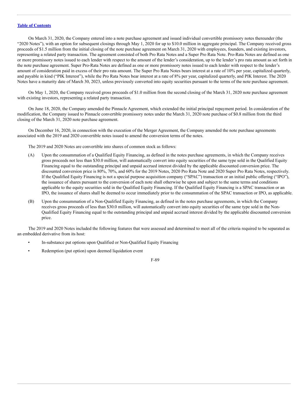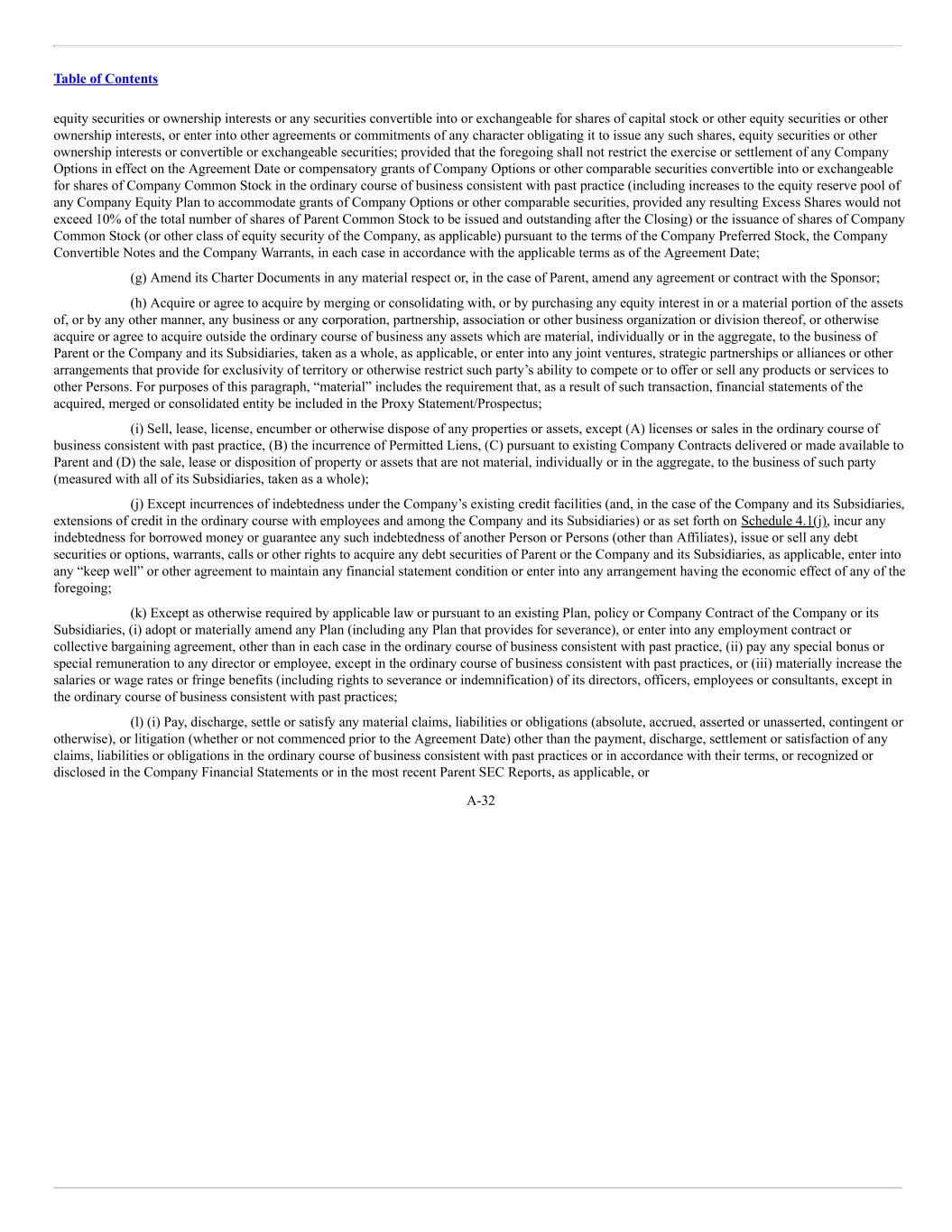 Table of Contents equity securities or ownership interests or any securities convertible into or exchangeable for shares of capital stock or other equity securities or other ownership interests, or enter into other agreements or commitments of any character obligating it to issue any such shares, equity securities or other ownership interests or convertible or exchangeable securities; provided that the foregoing shall not restrict the exercise or settlement of any Company Options in effect on the Agreement Date or compensatory grants of Company Options or other comparable securities convertible into or exchangeable for shares of Company Common Stock in the ordinary course of business consistent with past practice (including increases to the equity reserve pool of any Company Equity Plan to accommodate grants of Company Options or other comparable securities, provided any resulting Excess Shares would not exceed 10% of the total number of shares of Parent Common Stock to be issued and outstanding after the Closing) or the issuance of shares of Company Common Stock (or other class of equity security of the Company, as applicable) pursuant to the terms of the Company Preferred Stock, the Company Convertible Notes and the Company Warrants, in each case in accordance with the applicable terms as of the Agreement Date; (g) Amend its Charter Documents in any material respect or, in the case of Parent, amend any agreement or contract with the Sponsor; (h) Acquire or agree to acquire by merging or consolidating with, or by purchasing any equity interest in or a material portion of the assets of, or by any other manner, any business or any corporation, partnership, association or other business organization or division thereof, or otherwise acquire or agree to acquire outside the ordinary course of business any assets which are material, individually or in the aggregate, to the business of Parent or the Company and its Subsidiaries, taken as a whole, as applicable, or enter into any joint ventures, strategic partnerships or alliances or other arrangements that provide for exclusivity of territory or otherwise restrict such party’s ability to compete or to offer or sell any products or services to other Persons. For purposes of this paragraph, “material” includes the requirement that, as a result of such transaction, financial statements of the acquired, merged or consolidated entity be included in the Proxy Statement/Prospectus; (i) Sell, lease, license, encumber or otherwise dispose of any properties or assets, except (A) licenses or sales in the ordinary course of business consistent with past practice, (B) the incurrence of Permitted Liens, (C) pursuant to existing Company Contracts delivered or made available to Parent and (D) the sale, lease or disposition of property or assets that are not material, individually or in the aggregate, to the business of such party (measured with all of its Subsidiaries, taken as a whole); (j) Except incurrences of indebtedness under the Company’s existing credit facilities (and, in the case of the Company and its Subsidiaries, extensions of credit in the ordinary course with employees and among the Company and its Subsidiaries) or as set forth on Schedule 4.1(j), incur any indebtedness for borrowed money or guarantee any such indebtedness of another Person or Persons (other than Affiliates), issue or sell any debt securities or options, warrants, calls or other rights to acquire any debt securities of Parent or the Company and its Subsidiaries, as applicable, enter into any “keep well” or other agreement to maintain any financial statement condition or enter into any arrangement having the economic effect of any of the foregoing; (k) Except as otherwise required by applicable law or pursuant to an existing Plan, policy or Company Contract of the Company or its Subsidiaries, (i) adopt or materially amend any Plan (including any Plan that provides for severance), or enter into any employment contract or collective bargaining agreement, other than in each case in the ordinary course of business consistent with past practice, (ii) pay any special bonus or special remuneration to any director or employee, except in the ordinary course of business consistent with past practices, or (iii) materially increase the salaries or wage rates or fringe benefits (including rights to severance or indemnification) of its directors, officers, employees or consultants, except in the ordinary course of business consistent with past practices; (l) (i) Pay, discharge, settle or satisfy any material claims, liabilities or obligations (absolute, accrued, asserted or unasserted, contingent or otherwise), or litigation (whether or not commenced prior to the Agreement Date) other than the payment, discharge, settlement or satisfaction of any claims, liabilities or obligations in the ordinary course of business consistent with past practices or in accordance with their terms, or recognized or disclosed in the Company Financial Statements or in the most recent Parent SEC Reports, as applicable, or   A-32
