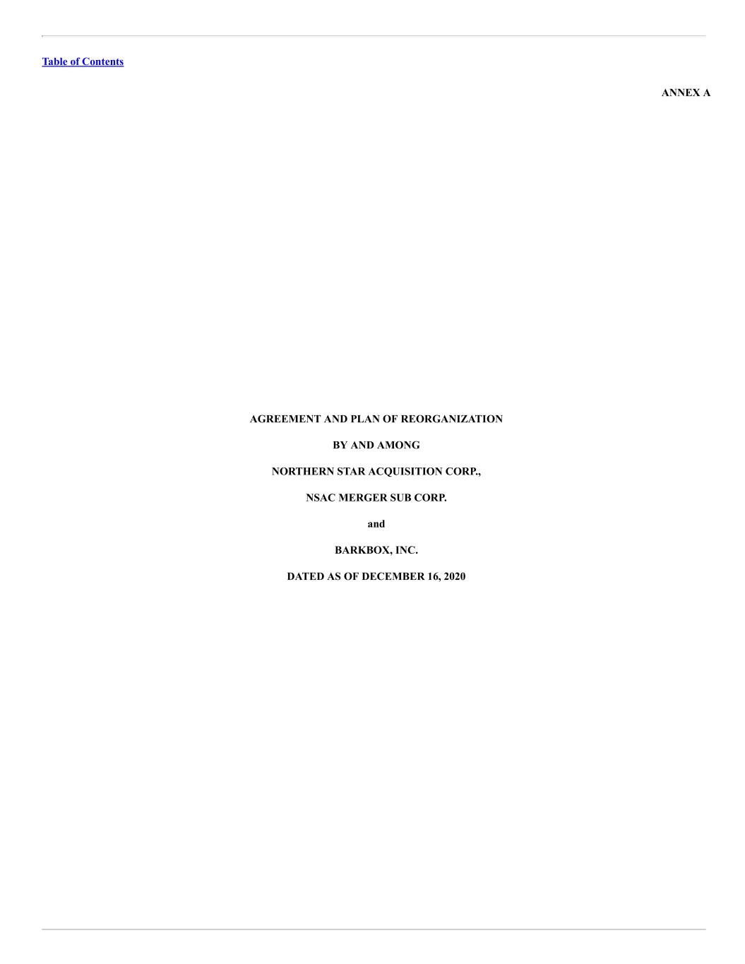 Table of Contents AGREEMENT AND PLAN OF REORGANIZATION THIS AGREEMENT AND PLAN OF REORGANIZATION is made and entered into as of December 16, 2020 (the “Agreement Date”), by and among Northern Star Acquisition Corp., a Delaware corporation (“Parent”), NSAC Merger Sub Corp., a Delaware corporation and wholly owned subsidiary of Parent (“Merger Sub”), and Barkbox, Inc., a Delaware corporation (“Company”). The term “Agreement” as used herein refers to this Agreement and Plan of Reorganization, as the same may be amended from time to time, and all schedules hereto (including the Company Schedule and the Parent Schedule, as defined in the preambles to Articles II and III hereof, respectively). Each of Parent, Merger Sub and the Company shall be referred to herein, individually, as a “Party” and, collectively, as the “Parties”. Except as otherwise indicated, capitalized terms used herein and not otherwise defined shall have the meanings ascribed to them in Section 8.2. RECITALS A. Upon the terms and subject to the conditions of this Agreement and in accordance with the Delaware General Corporation Law (the “DGCL”), the Parties intend to enter into a business combination transaction by which Merger Sub will merge with and into the Company (with the Company being the surviving entity of the Merger (“Surviving Corporation”)) in exchange for the Company’s stockholders receiving shares of Class A common stock, par value $0.0001 per share, of the Parent (“Parent Common Stock”) as provided by this Agreement (the “Merger”). B. The boards of directors of each of Parent, Merger Sub and the Company have determined that the Merger is fair to, and in the best interests of, their respective companies and their respective stockholders. C. The parties intend that the Merger will qualify as a “reorganization” within the meaning of Section 368(a) of the U.S. Internal Revenue Code of 1986, as amended (the “Code”), and this Agreement is hereby adopted as a “plan of reorganization” within the meaning of Section 368 of the Code. NOW, THEREFORE, in consideration of the covenants, promises and representations set forth herein, and for other good and valuable consideration, the receipt and sufficiency of which are hereby acknowledged, the parties agree as follows: ARTICLE I THE MERGER 1.1 The Merger. At the Effective Time and subject to and upon the terms and conditions of this Agreement and the applicable provisions of the DGCL, Merger Sub shall be merged with and into the Company, the separate corporate existence of Merger Sub shall cease and the Company shall continue as the Surviving Corporation after the Merger and as a wholly owned subsidiary of Parent. 1.2 Effective Time; Closing. Subject to the terms and conditions of this Agreement, as soon as practicable on or after the Closing Date (defined below), the parties hereto shall cause the Merger to be consummated by filing a Certificate of Merger (the “Certificate of Merger”) with the Secretary of State of the State of Delaware, in accordance with the applicable provisions of the DGCL (the time of such filing, or such later time as may be agreed in writing by Company and Parent and specified in the Certificate of Merger, being the “Effective Time”). Unless this Agreement shall have been terminated pursuant to Section 7.1, the consummation of the Merger (the “Closing”), other than the filing of the Certificate of Merger, shall take place at the offices of Graubard Miller, counsel to Parent, The Chrysler Building, 405 Lexington Avenue, 11th Floor, New York, New York 10174-1901 at a time and date to be specified by the parties, which shall be no later than the third (3rd) Business Day after the satisfaction or waiver of the conditions set forth in Article VI (other than those conditions that by their nature are to be satisfied at the Closing, but subject to the satisfaction thereof at the Closing), or at such other time, date and location as the parties hereto agree in writing (the “Closing Date”). Closing signatures may be transmitted by facsimile or by email pdf files.   A-1